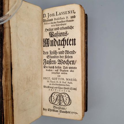 Los 53: LASSENIUS, Johannes: Heilige und erbauliche Paßions-Andachten in den Früh- und Abendstunden der sieben Fasten-Wochen, Die durch dessen Tod unterbrochen, auff Begehren aber fortgesetzet worden von Hect. Gottfr. Masio…