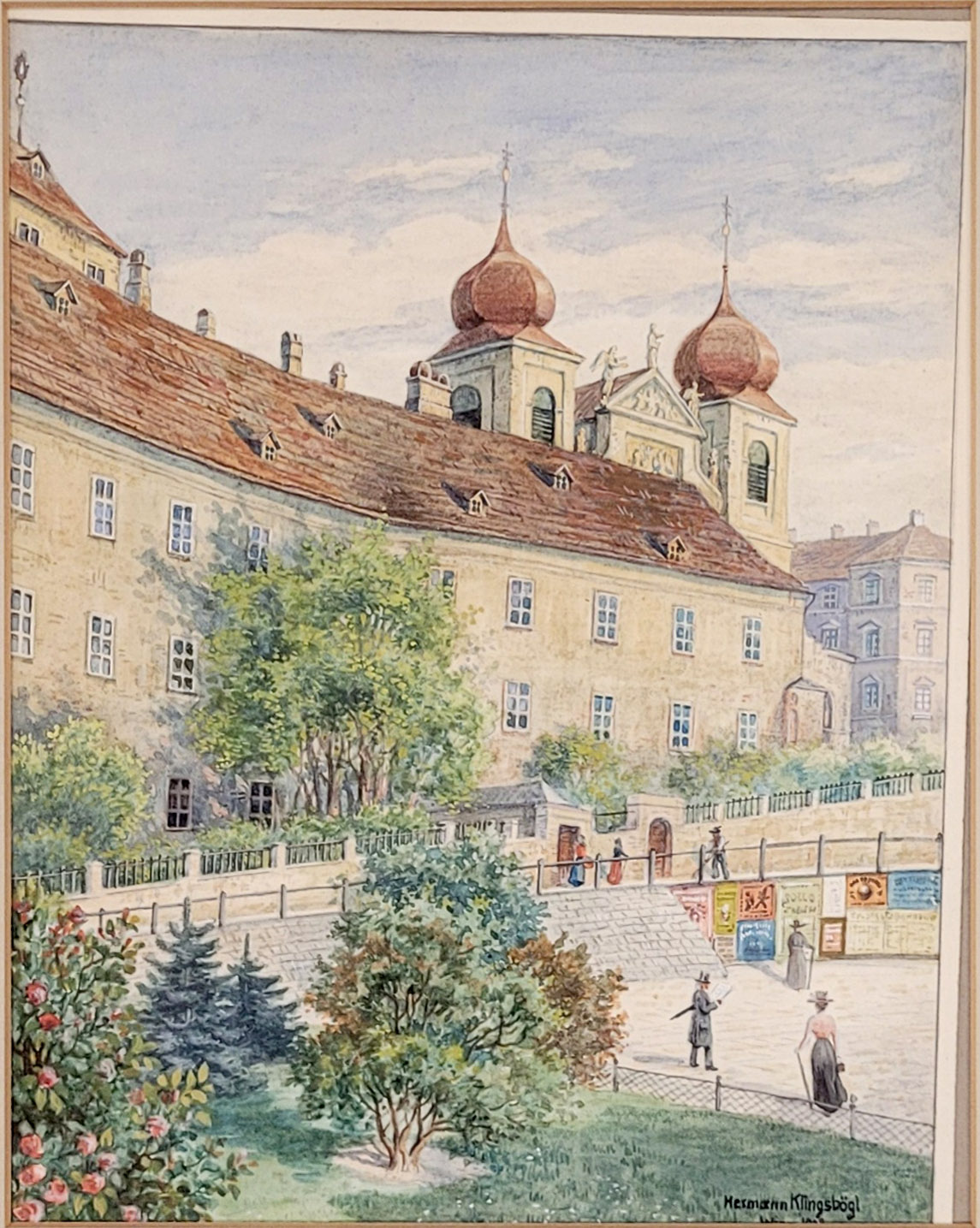 KLINGSBÖGL, Hermann (1874-1943): Ansicht auf das Wiener DominikanerklosterAquarell über Bleistift auf Papier, signiert, datiert 1918 und bezeichnet „Wien“ unten rechts, ca. 25 x 20 cm, gerahmt unter Glas und Passepartout