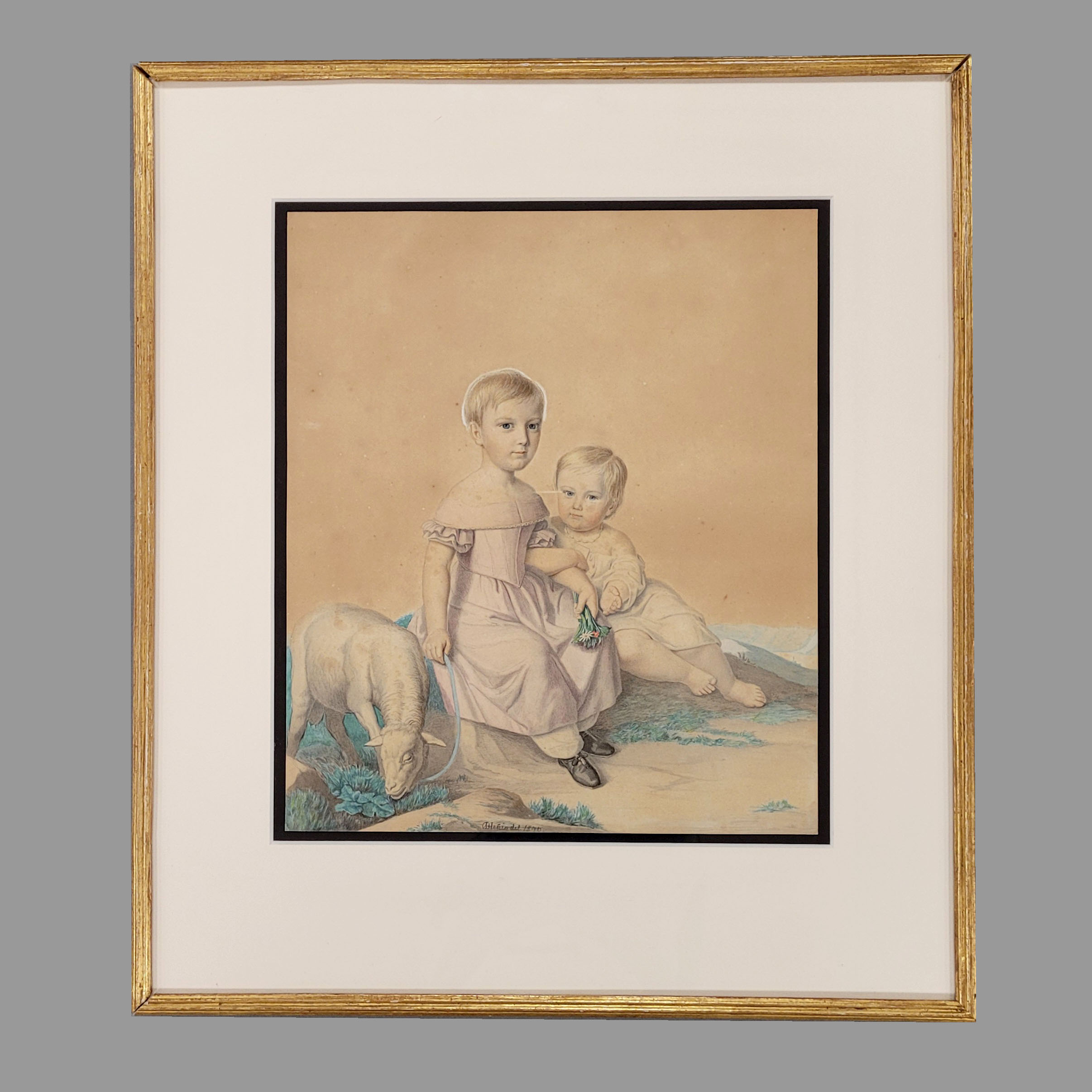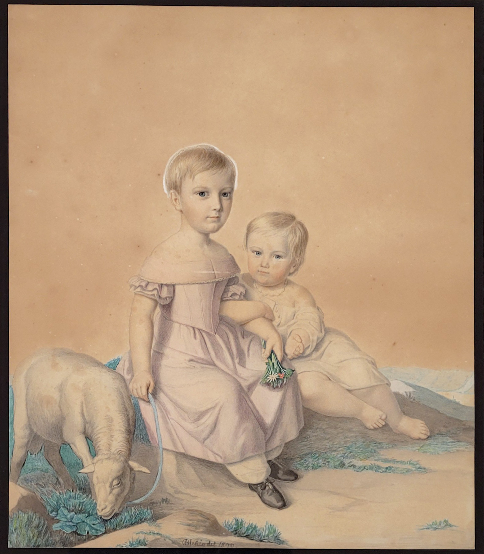 HENNIG, Gustav Adolf (1797-1869): Porträt zweier KinderMischtechnik auf Papier, signiert und datiert 1840 unten Mitte, 39 x 33,5 cm, gerahmt unter Glas und Passepartout