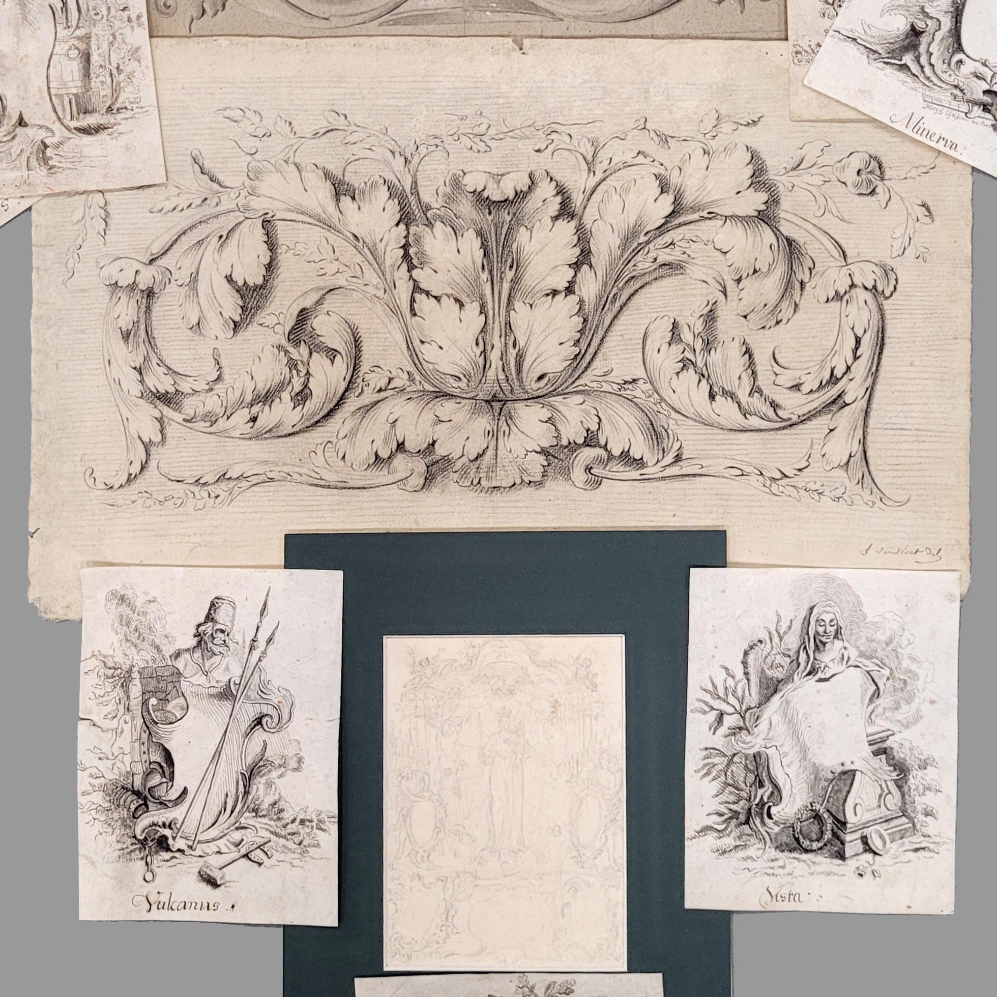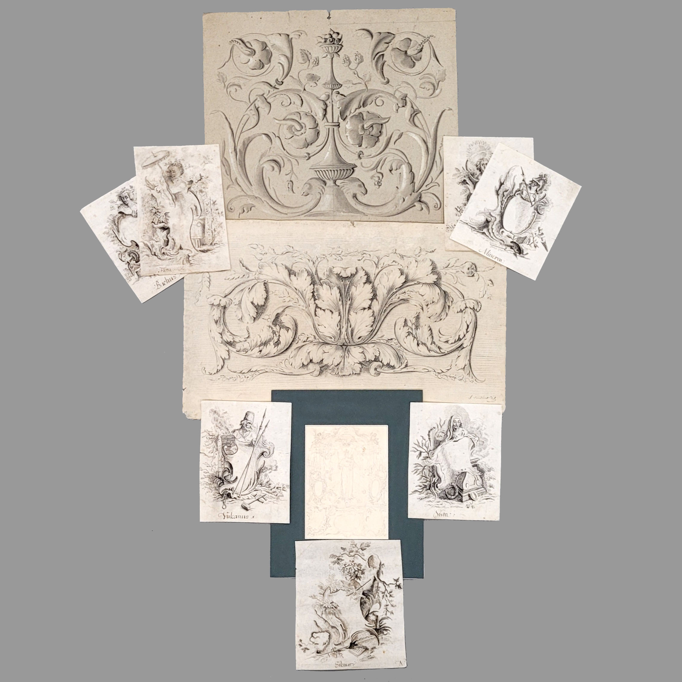 verschiedene Techniken, Größen und Zustände darunter 7 Entwurfszeichnungen des Bildhauers Johann Joseph Christian (1706-1777) aus Zwiefalten, ca. 19 x 14 cm, signiert (1x) insgesamt 10 Arbeiten