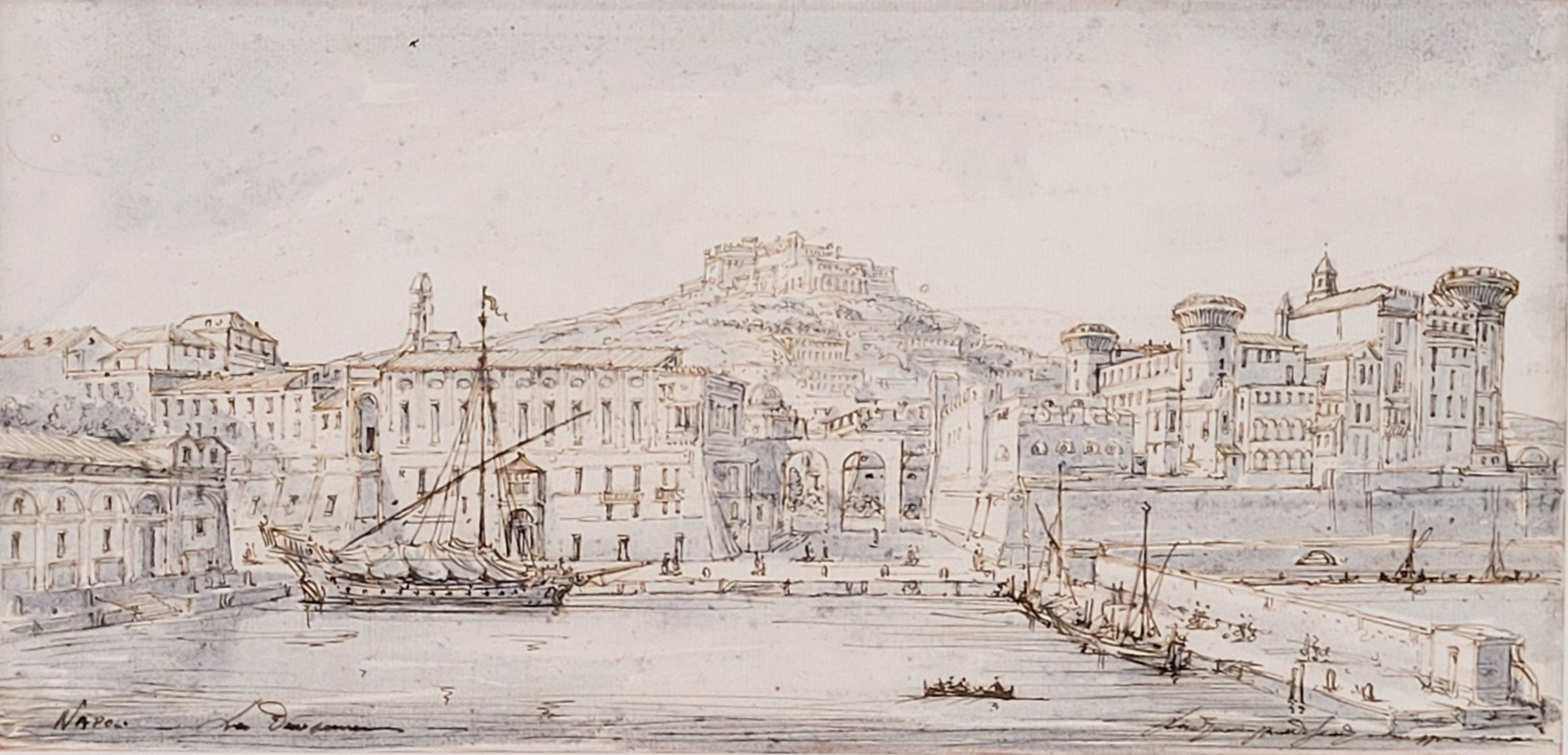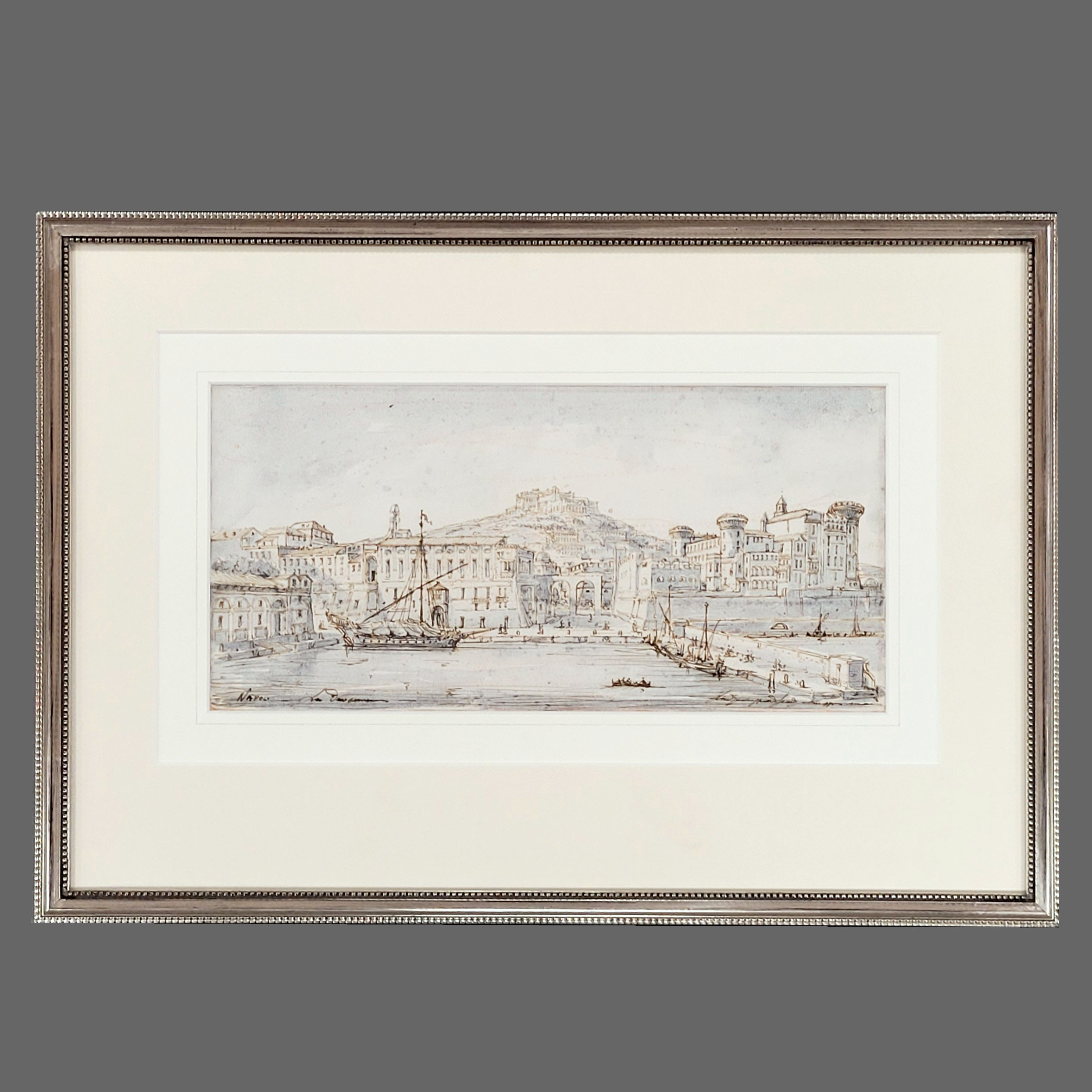 ITALIENISCHER MEISTER (wohl 18. Jh.): Ansicht des Hafens von Neapel mit Castel Sant’ElmoFeder, laviert auf Papier, bezeichnet unten links und rechts, 15,5 x 32,5 cm, gerahmt unter Glas und Passepartout
