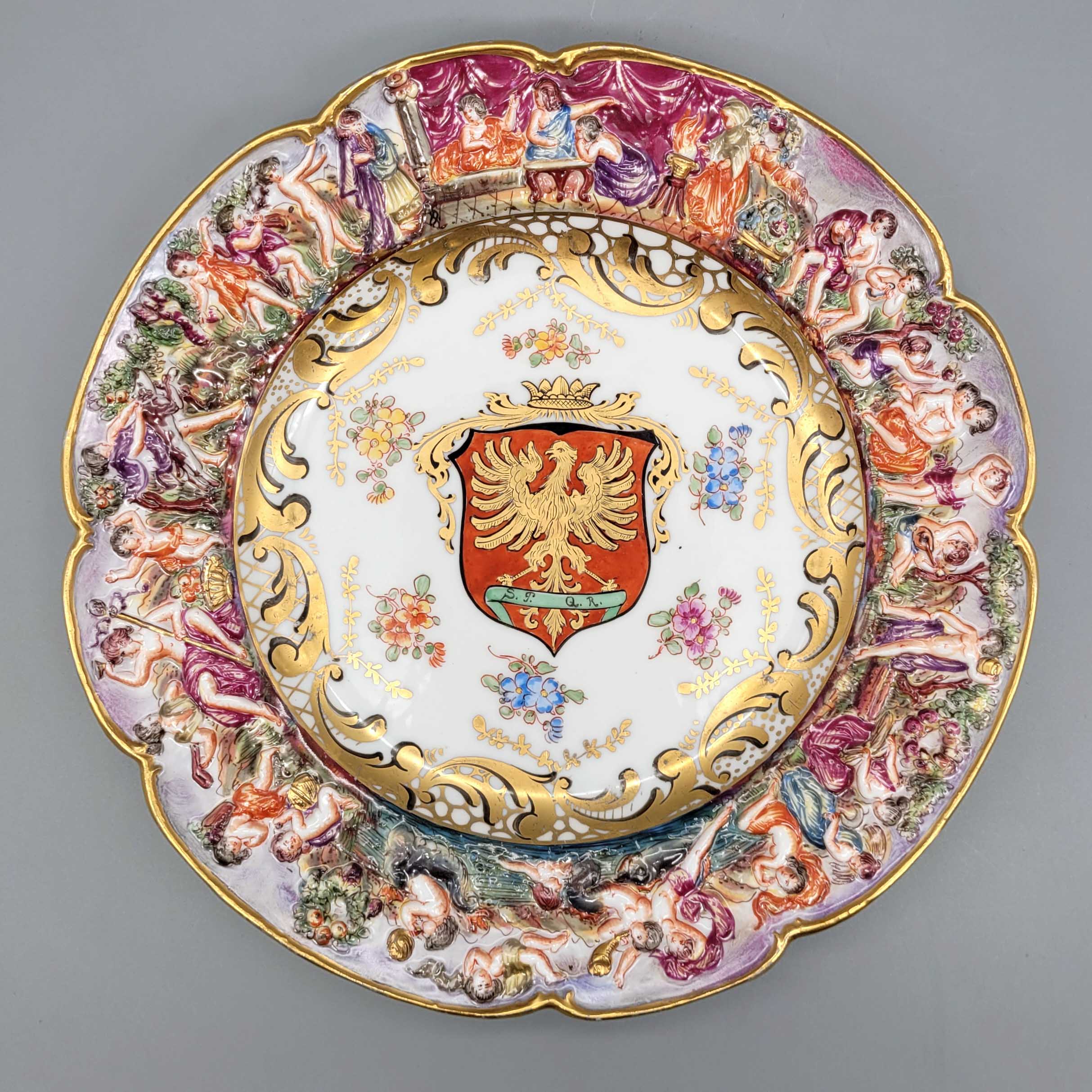 Prunkteller mit WappenPorzellan, Reliefrand, bemalt, im Spiegel Wappen mit Adler und „SPQR“, Vergoldung, wohl Capodimonte 19. Jahrhundert, Durchmesser 23 cm (kleiner Chip am Standring)