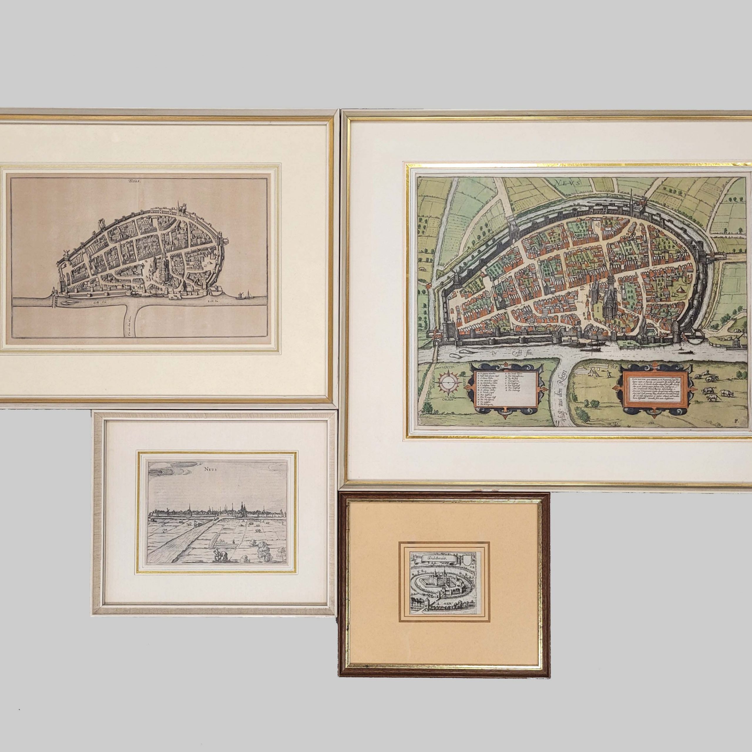 Neuss und Schloss Hülchrath4 Kupferstiche, 16./17. Jahrhundert, koloriert (1x), Braun-Hogenberg / Merian und Bertius, bis zu 34 x 44,5 cm, gerahmt unter Glas und Passepartout