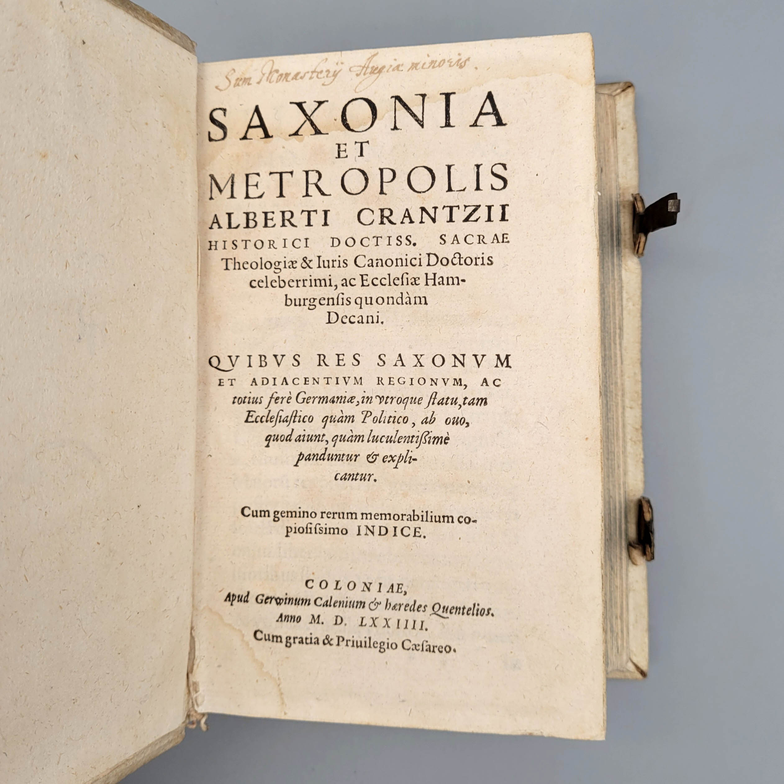 Köln (Galenius und Quentels Erben) 1574 (ohne den II. Teil „Metropolis“, geprägter Pergamenteinband der Zeit über Holzdeckeln und Metallschließen [eine verloren])