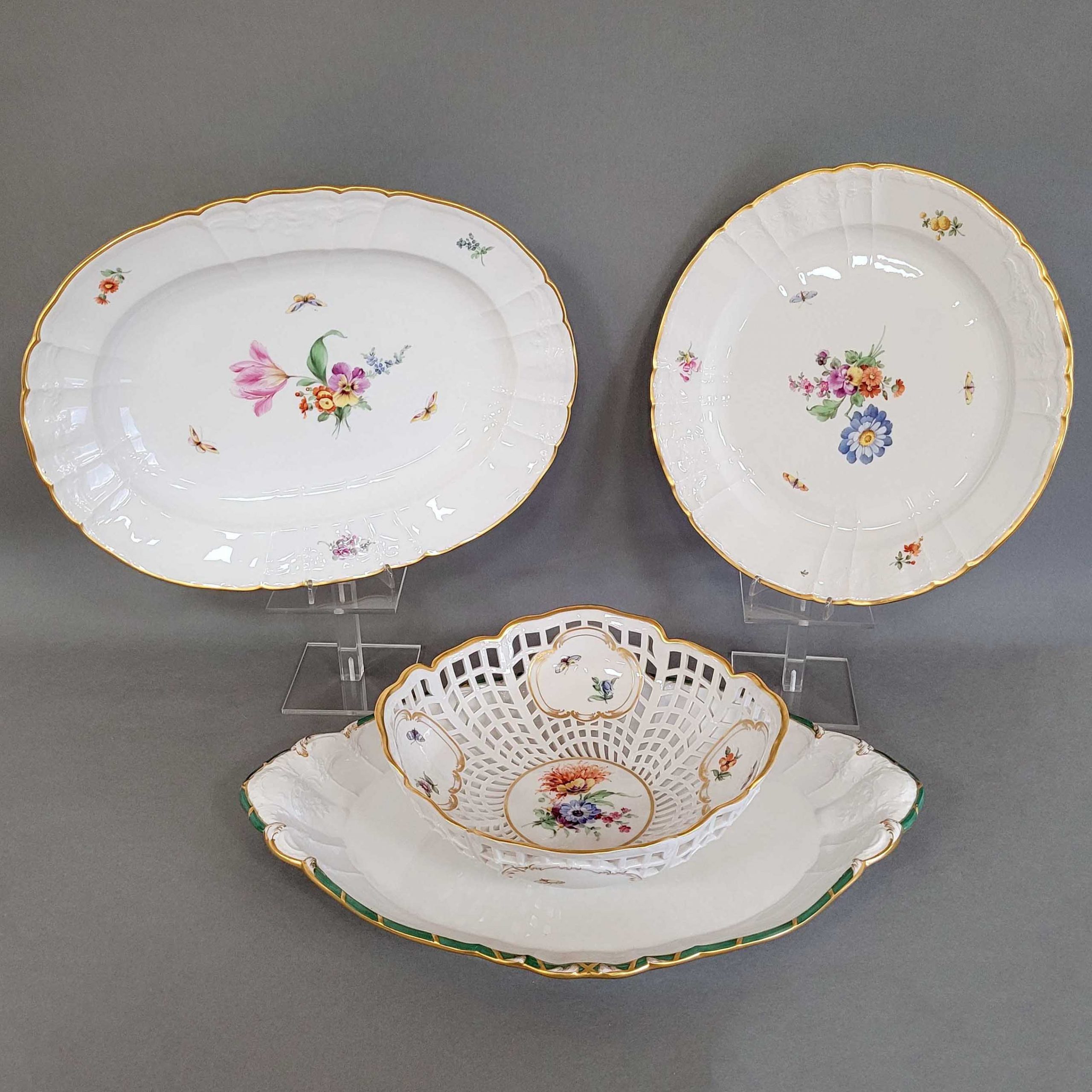 Drei Anbietplatten und ein DurchbruchkorbPorzellan, KPM Berlin, Rocaille (2x), Dekor 36 (3x), grün bemalter und vergoldeter Rand, Durchmesser 32 bzw. 40 cm, 48 x 32 cm, Korb 9 x 28 cm