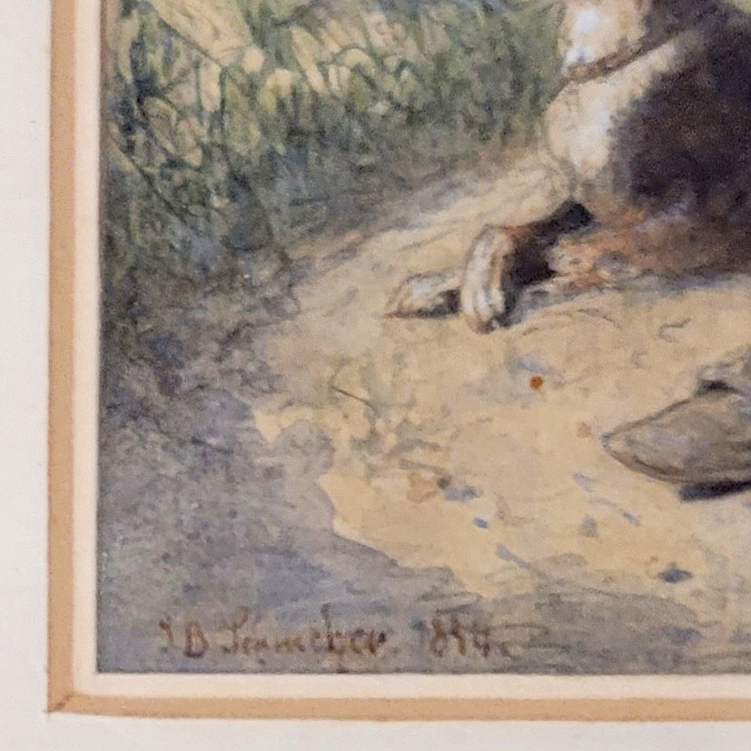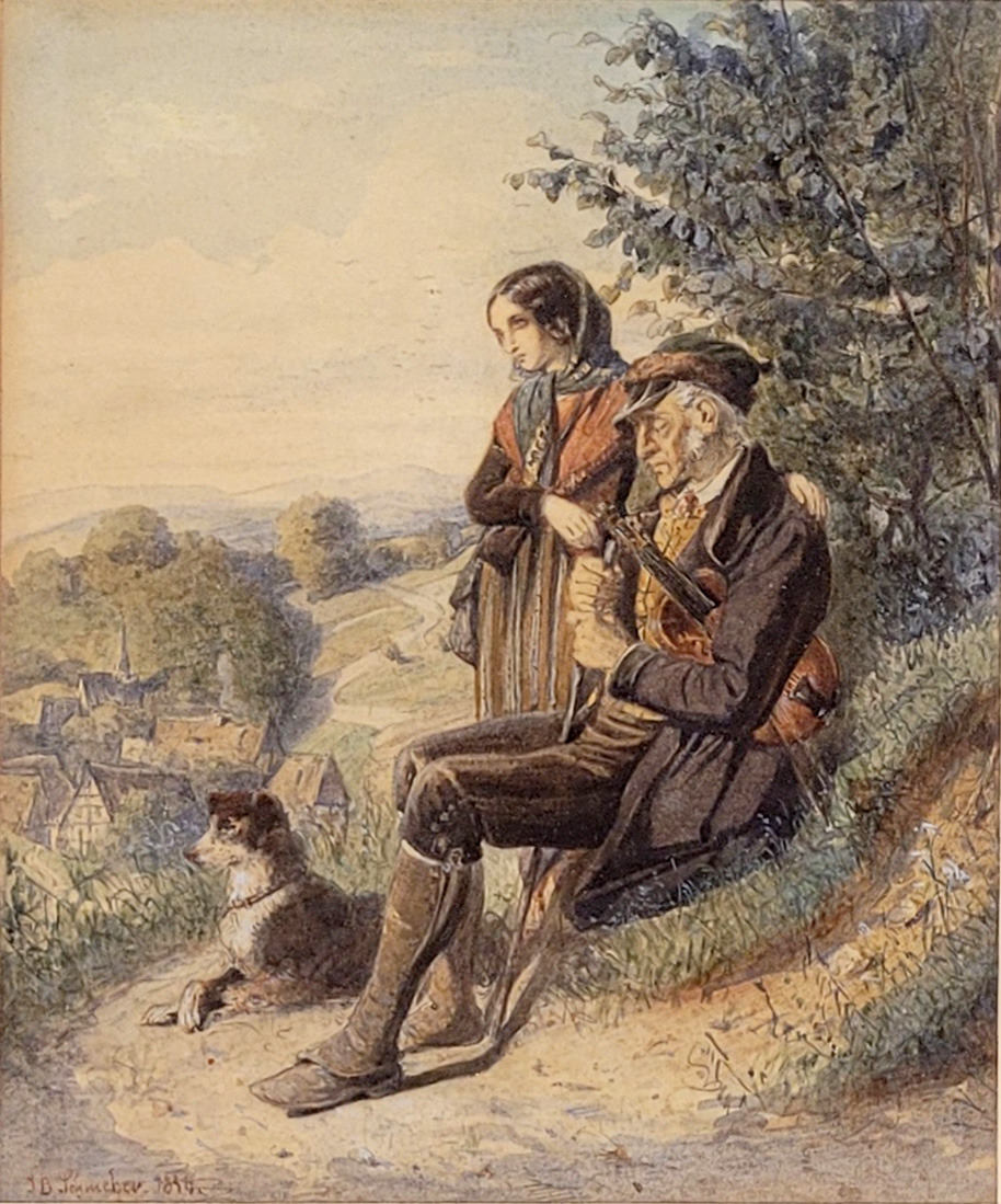 SCHMELZER, Johann Bernhard (1833-1909): Rast oberhalb eines DorfesAquarell, Gouache über Bleistift auf Papier, signiert und datiert 1856 unten links, 15,5 x 13,5 cm, gerahmt unter Glas und Passepartout (Rahmen der Zeit)