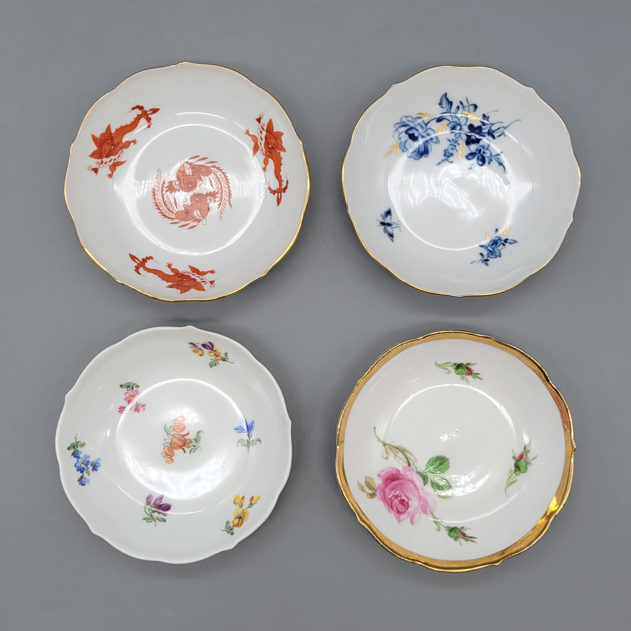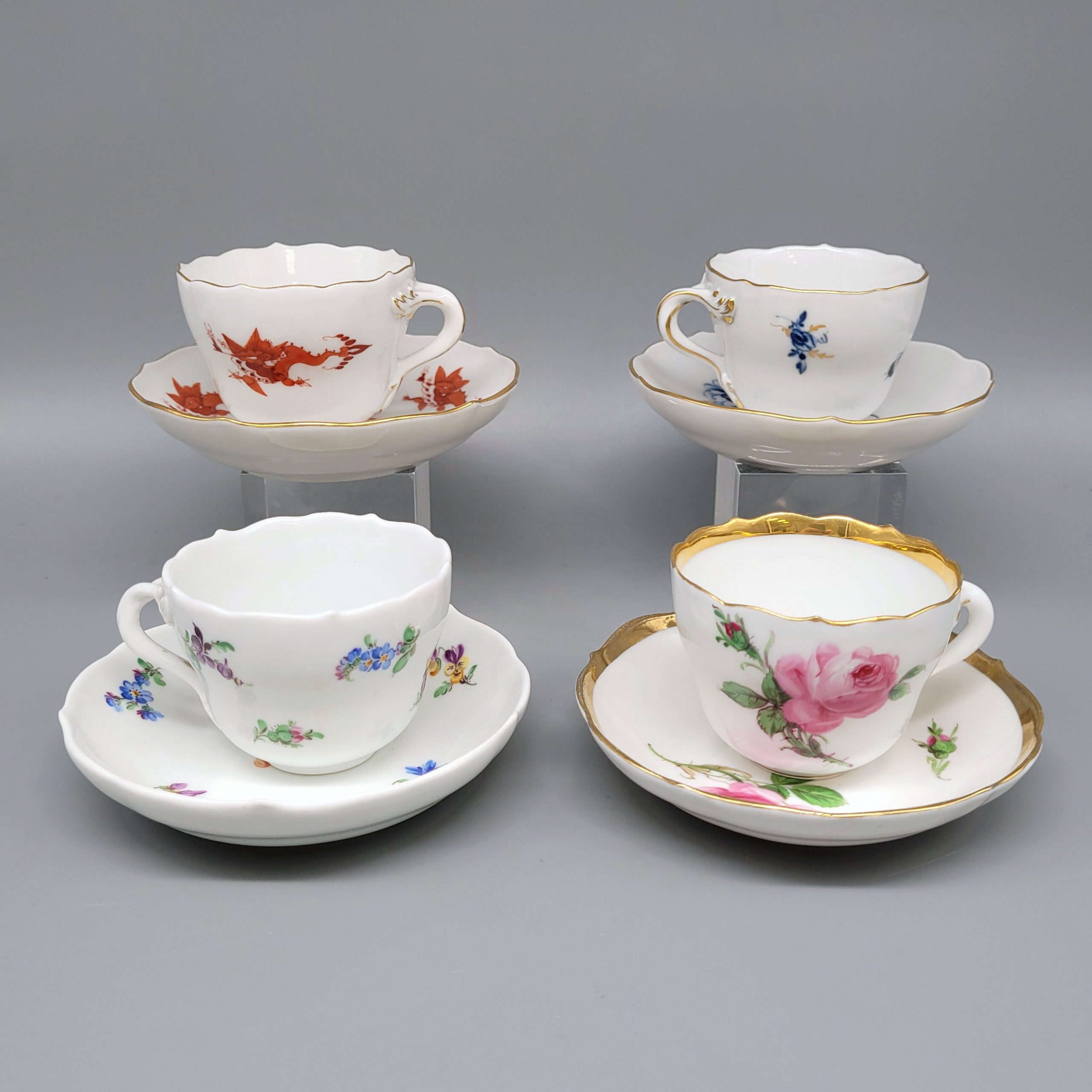 Vier Mokkatassen und UntertassenPorzellan, bemalt vergoldet, Meissen, verschiedene Dekore, Tassenhöhe 4,5 cm