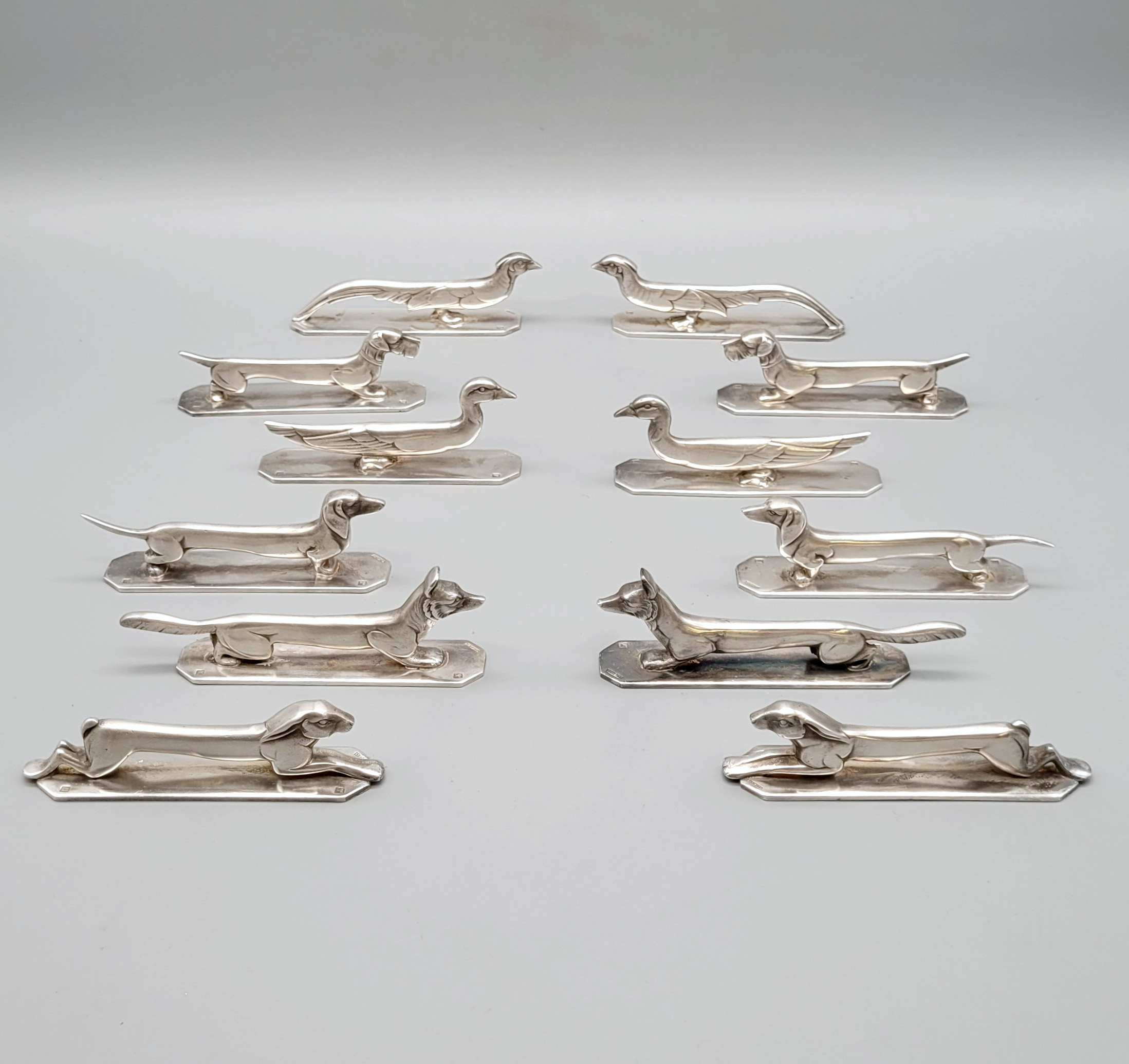 Set von zwölf Messerbänkchen in TierformMetall, versilbert, Marke Deetjen, Frankreich, um 1930-1940, 3,5 x 9,3 x 2 cm, Originalkassette