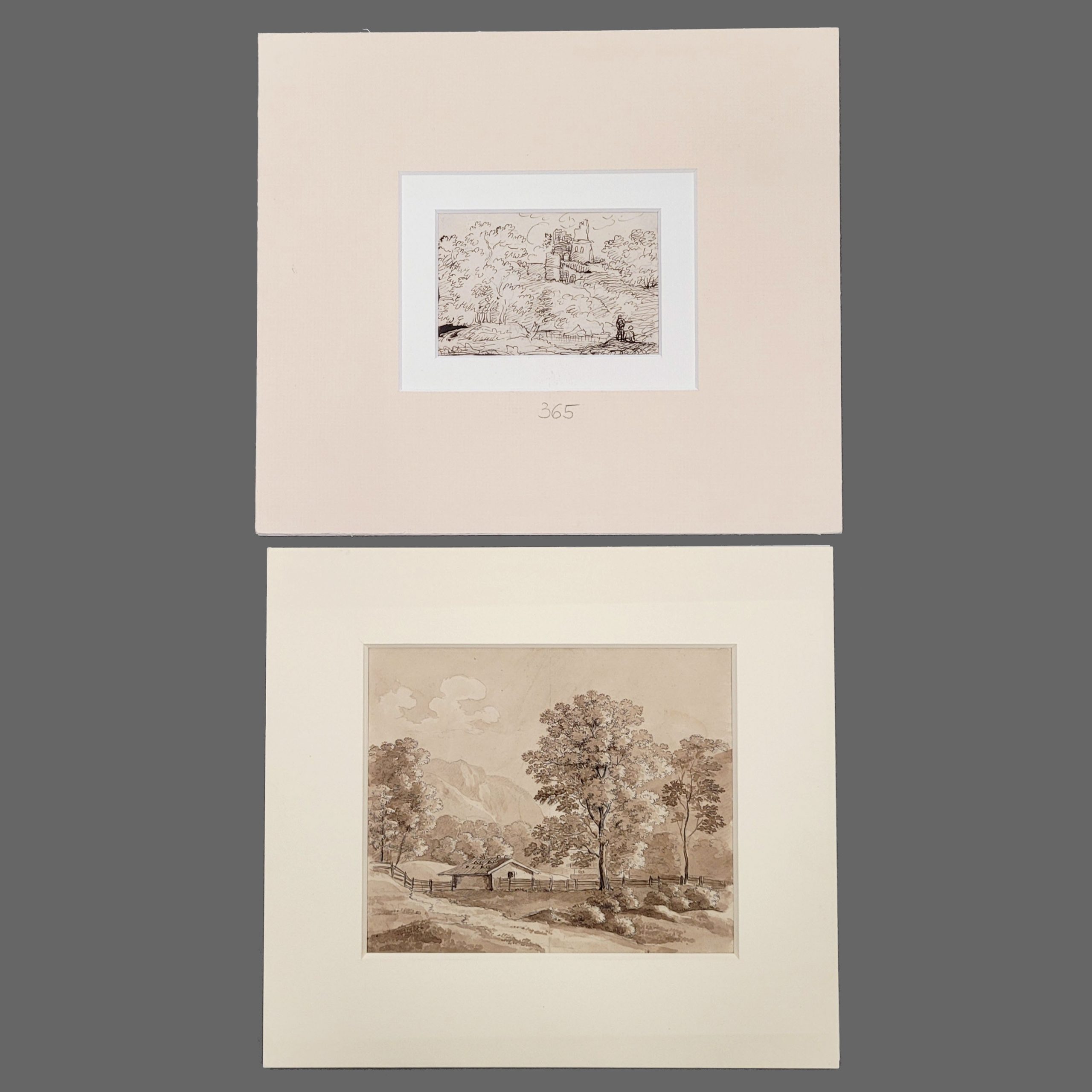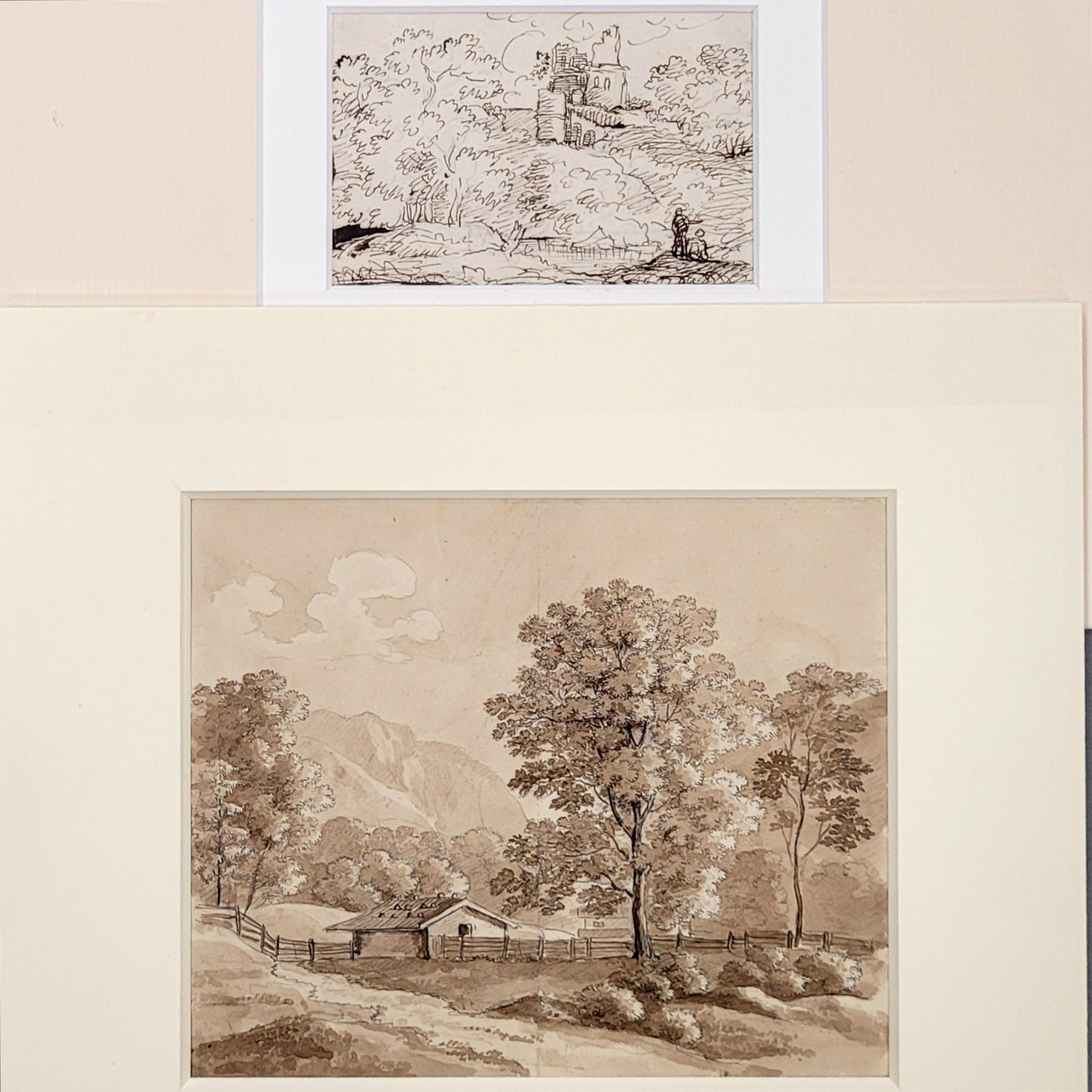Feder über Bleistift auf Papier, auf Karton montiert, verso Sammlerstempel „Hammer, Stockholm“, 8 x 12,5 cm, montiert im Klapp-Passepartout Feder, laviert über Bleistift auf Papier, montiert auf Papier, verso Stempel „Historischer Verein Oberbayern“ und alte Bezeichnung „Ruhpolding“, 16,5 x 20, montiert im Klapp-Passepartout