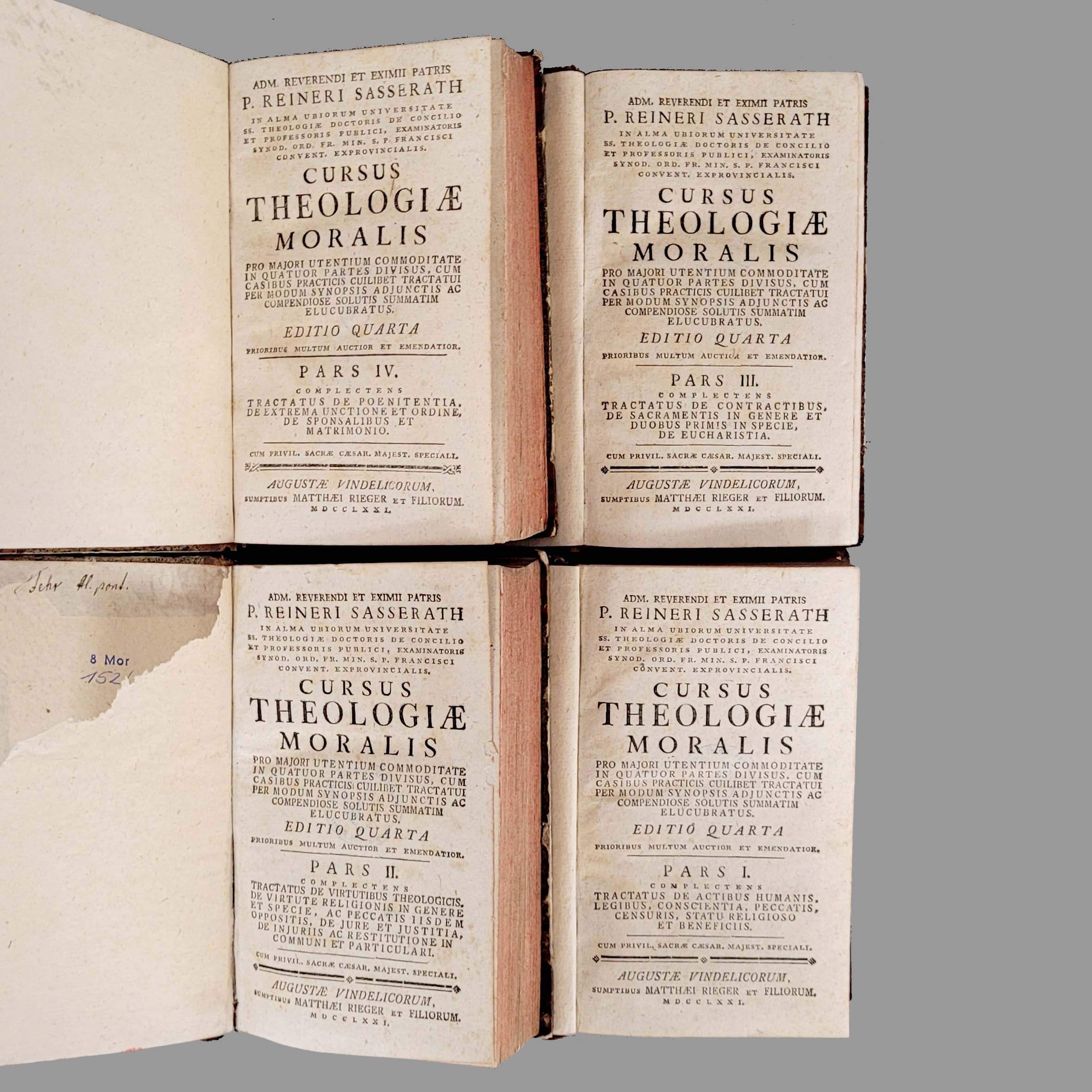 SASSERATH, Rainer: Cursus theologiae moralisVol. I-IV, Augsburg (Rieger) 1771 (Veröffentlichung der Vorlesungen des bekannten Kölner Moraltheologen des 18. Jahrhunderts)Wir weisen darauf hin, dass die Bücher nicht kollationiert sind