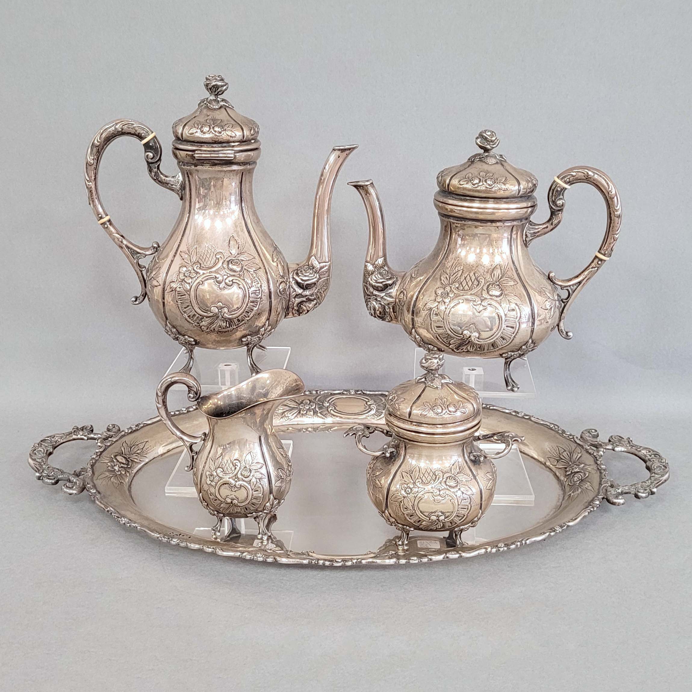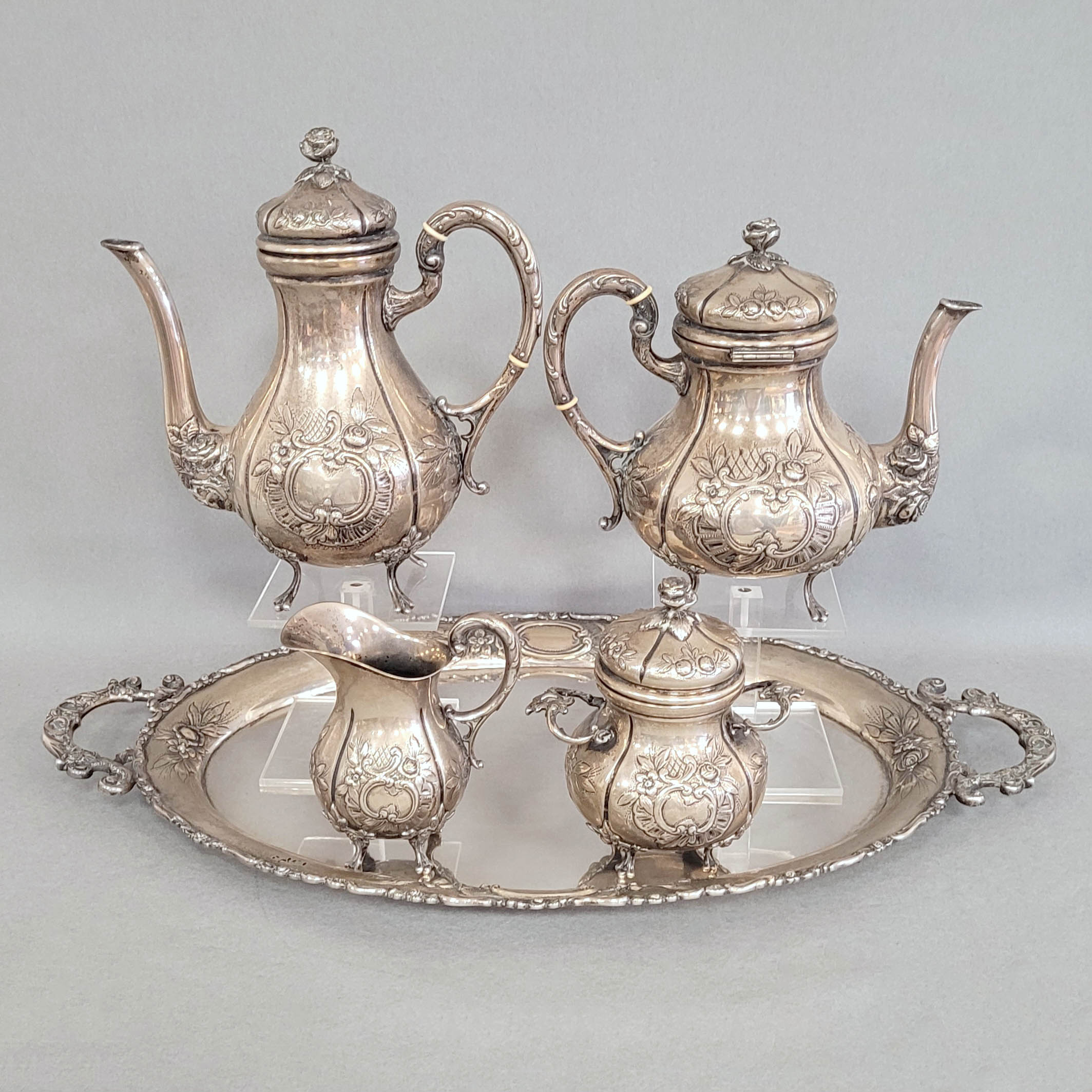 Kaffeekanne, Teekanne, Milch und Zucker auf Tablett800er Silber, Kaffeekanne Höhe 24,5 cm, Tablett (mit Henkeln) 55 x 33 cm, Gewicht 2919g