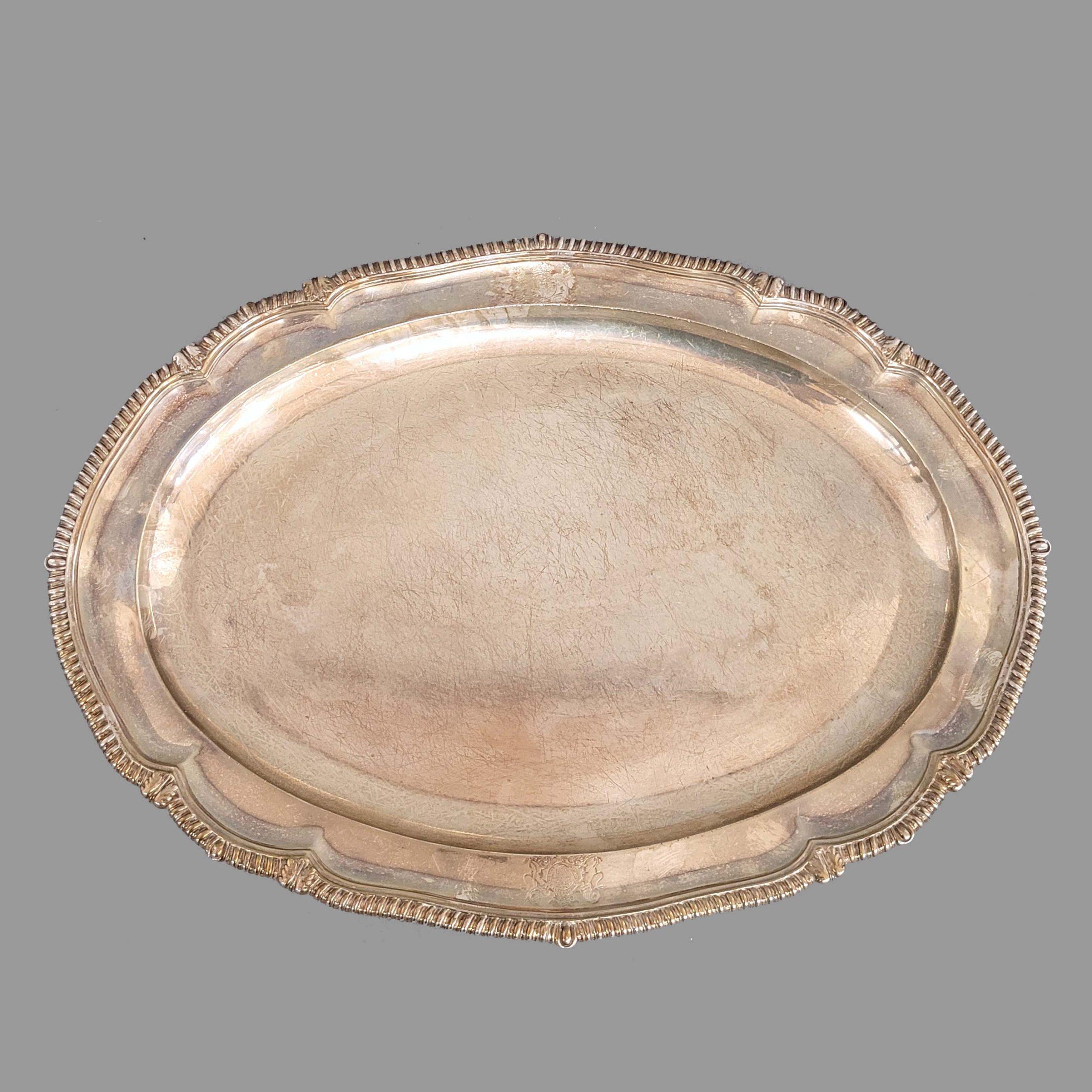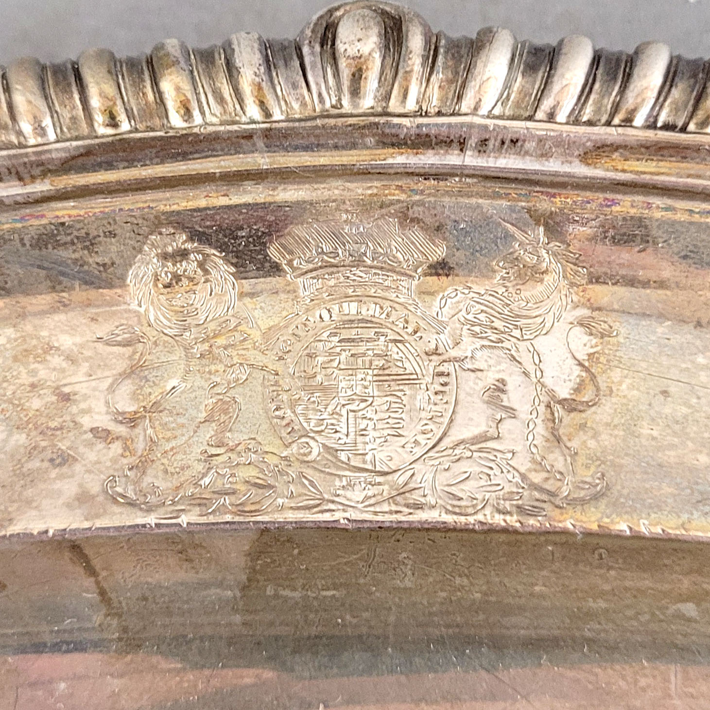 Großes Tablett mit mehrpassigem RandSilber, London 1850, Meister Marke „RG“ (=Hofsilberschmied Robert Garrard II [1793-1881], auf der Fahne 2x das gravierte Wappen des Vereinigten Königsreichs, 54 x 40 cm, Gewicht ca. 2800g