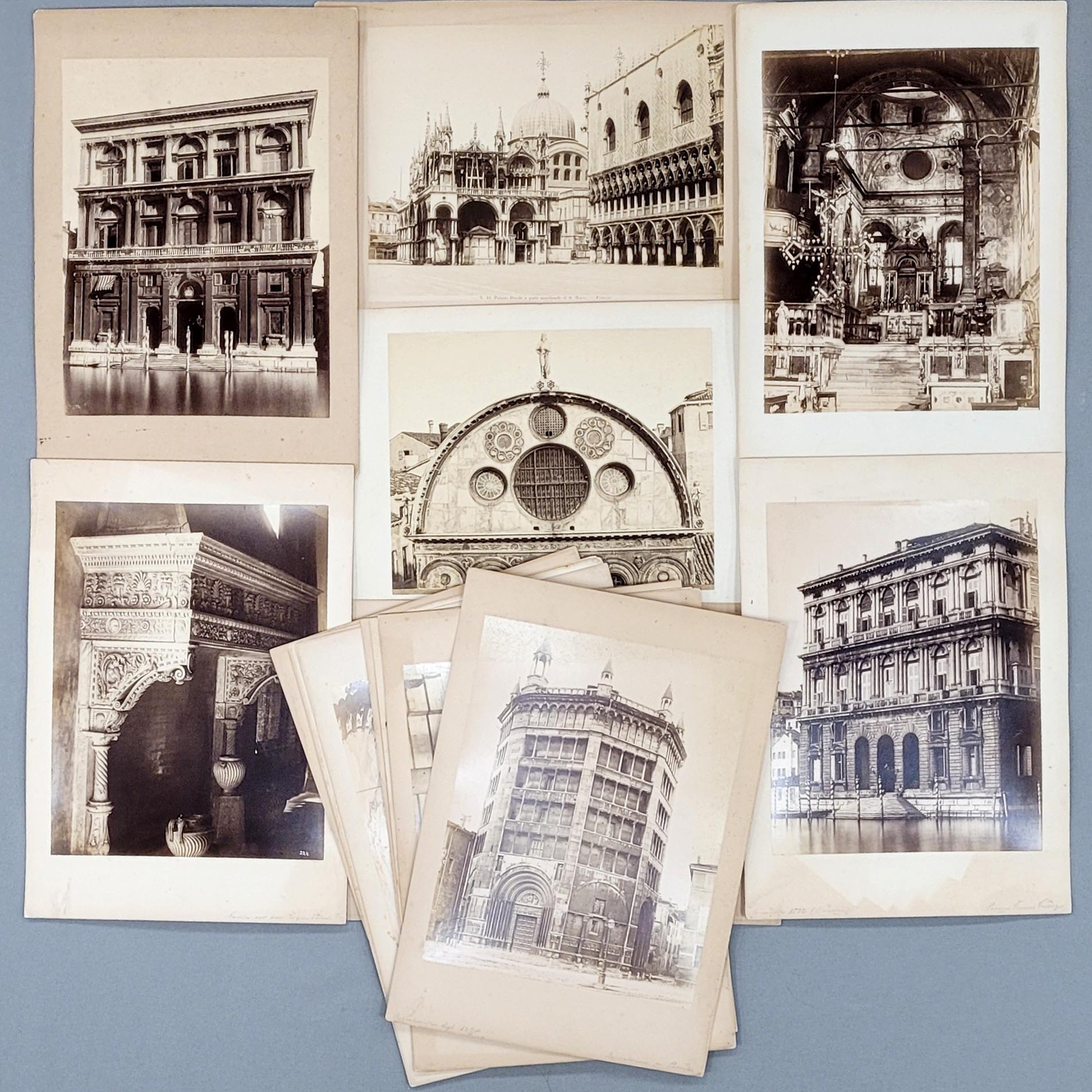 16 Blatt original montierte Albuminabzüge von Sehenswürdigkeiten in Venedig, zum Teil rückseitig dreisprachiger Text, zum Teil alt handschriftlich bezeichnet, 45,5 x 32 cm