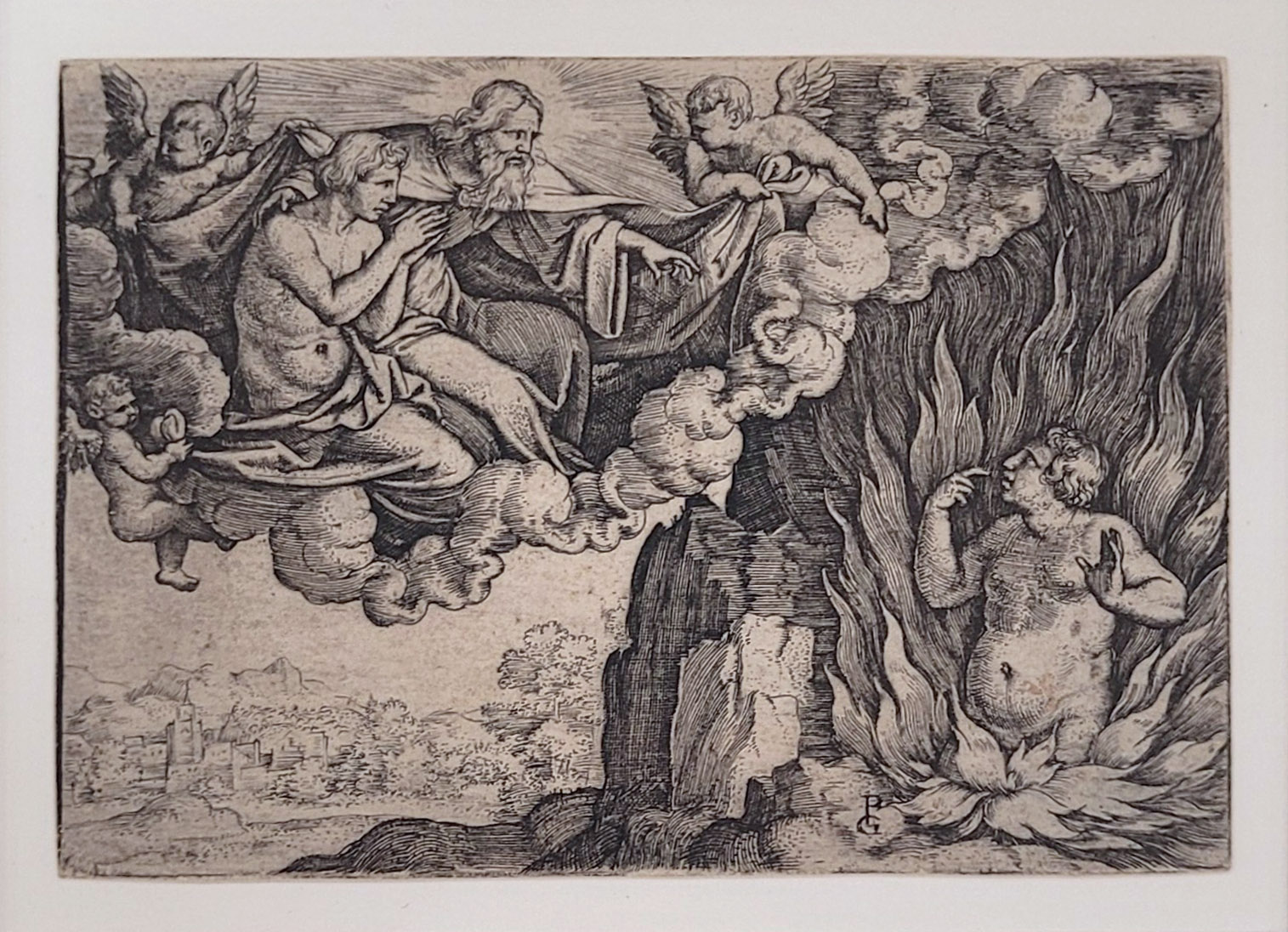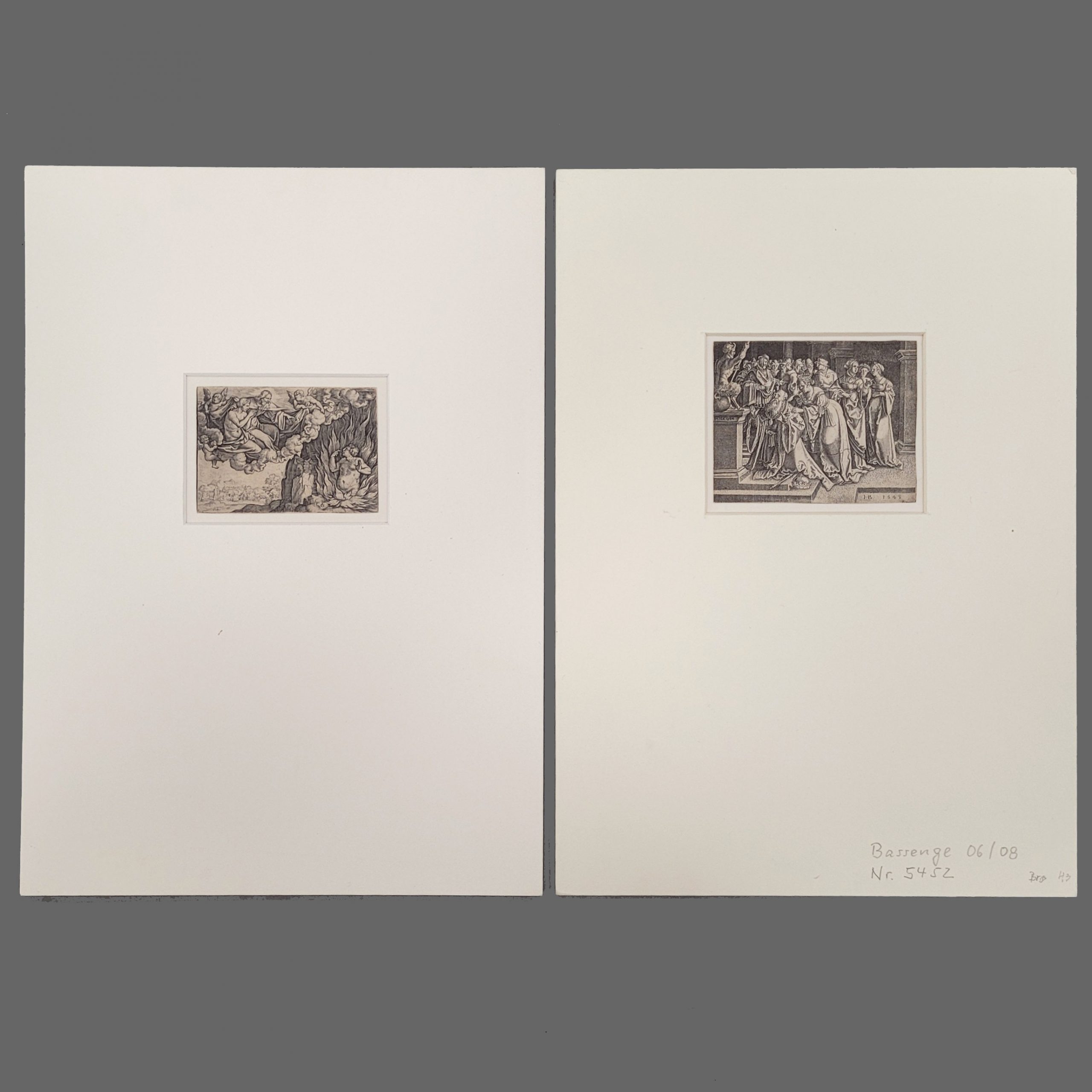 Kupferstich, 1545, 7,8 x 9,8 cm, montiert im Klapp-Passepartout PENCZ, Georg (1500-1550), Der reiche Mann in der Hölle und Lazarus im Himmel, Kupferstich, um 1542/1543, 6 x 9 cm, montiert im Klapp-Passepartout
