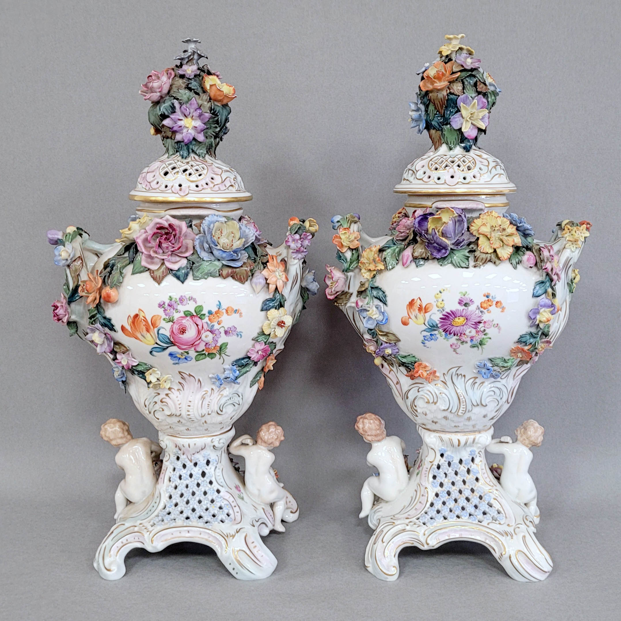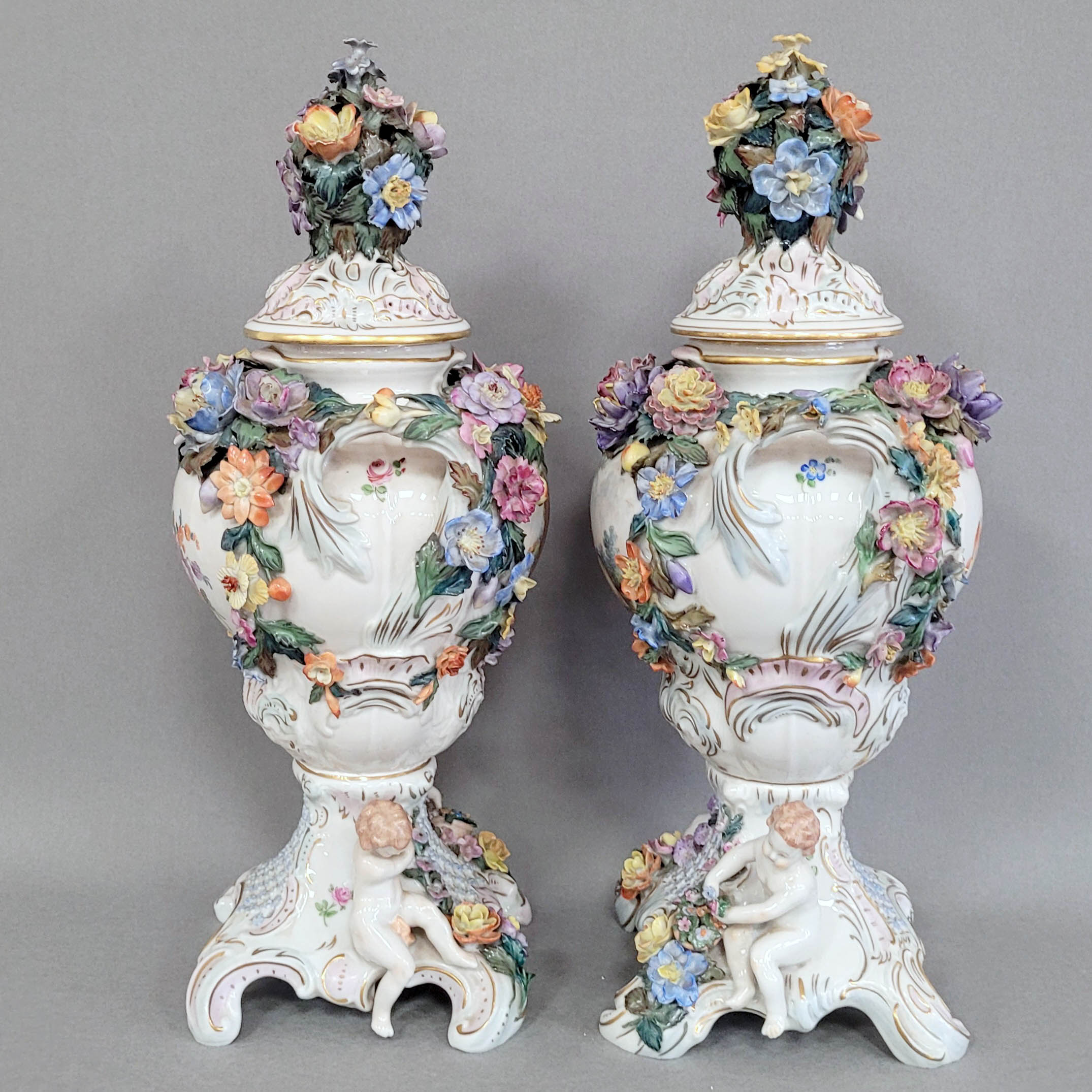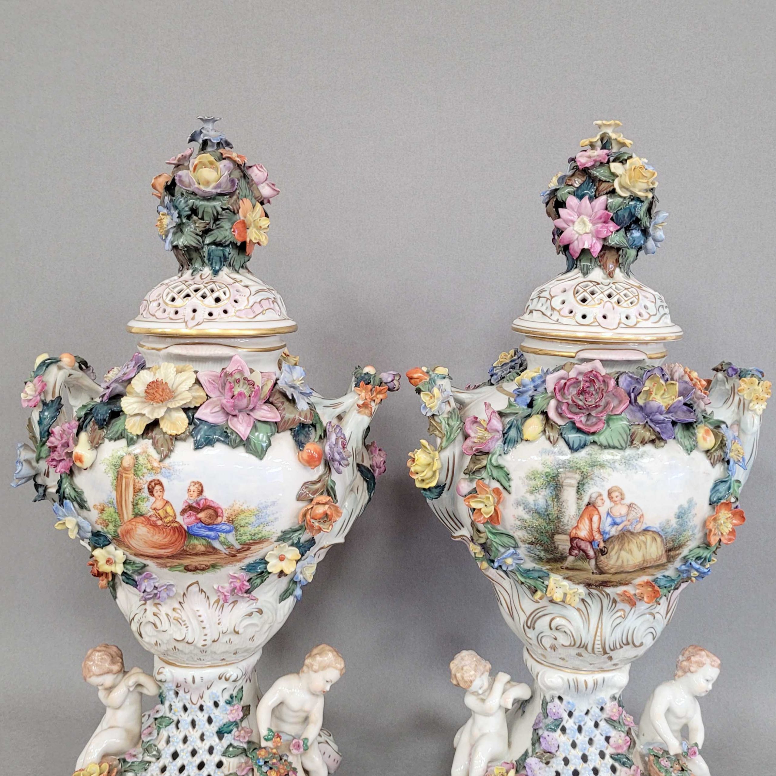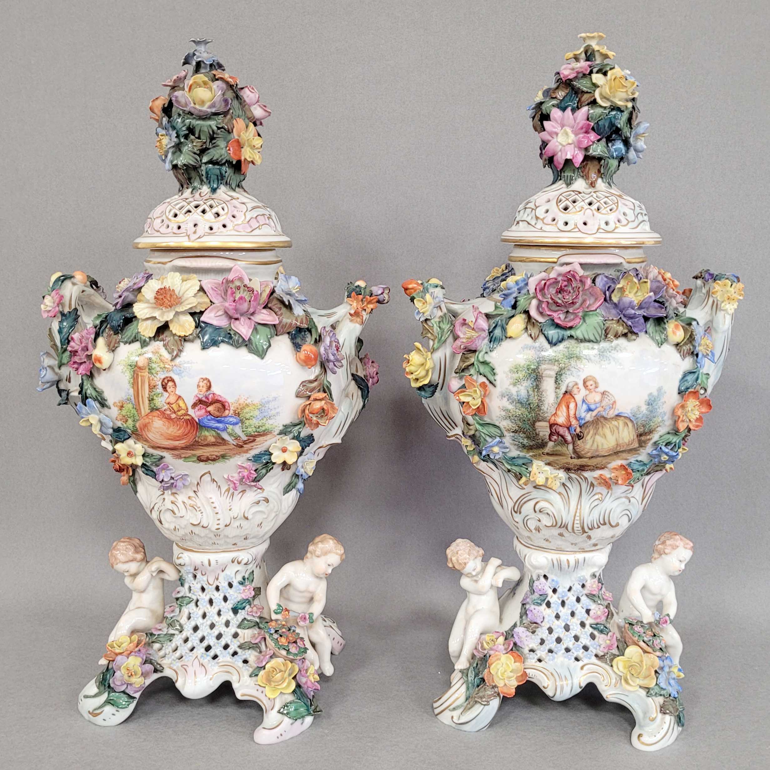 Paar große DeckelvasenPorzellan, bemalt und vergoldet, plastischer Blütendekor und Putten, Blumenstück und Galante Szene in polychromer Malerei, Potschappel Dresden, 20. Jahrhundert, Höhe 54 cm (minimale Fehlstellen an den Blüten)