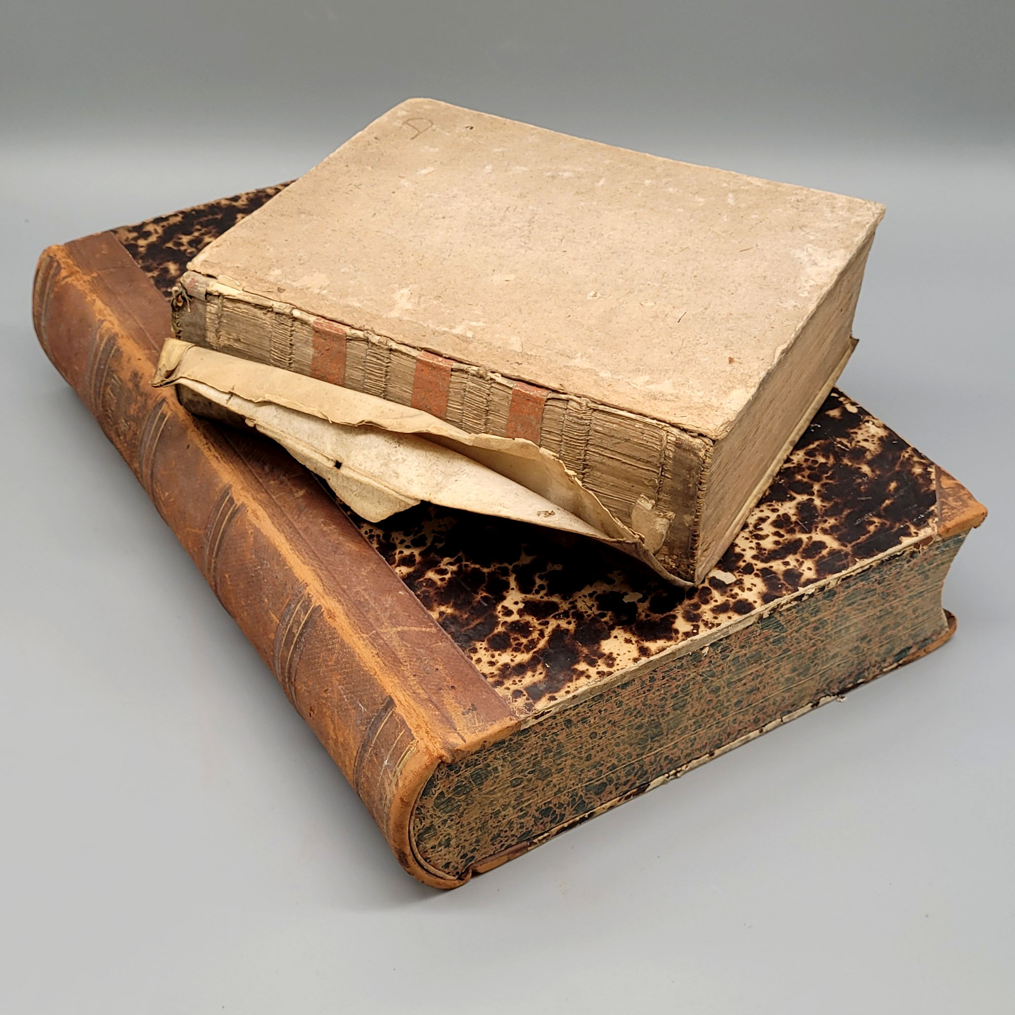 Antwerpen (Johannes Moretus) 1613 (Titelkupfer gelöst, Halbledereinband des 19. Jahrhunderts) beigelegt PAOLETTI, Augustin, Discursus praedicabiles sive viridarium sacrarum concionum in dominicas et festa a dominica adventus usque ad dominicam quinquagesimae occurentia.., Köln (Johannes Busaeus) 1664 (Pergamenteinband über Pappe der Zeit, Vorderdeckel ohne Pergament)
