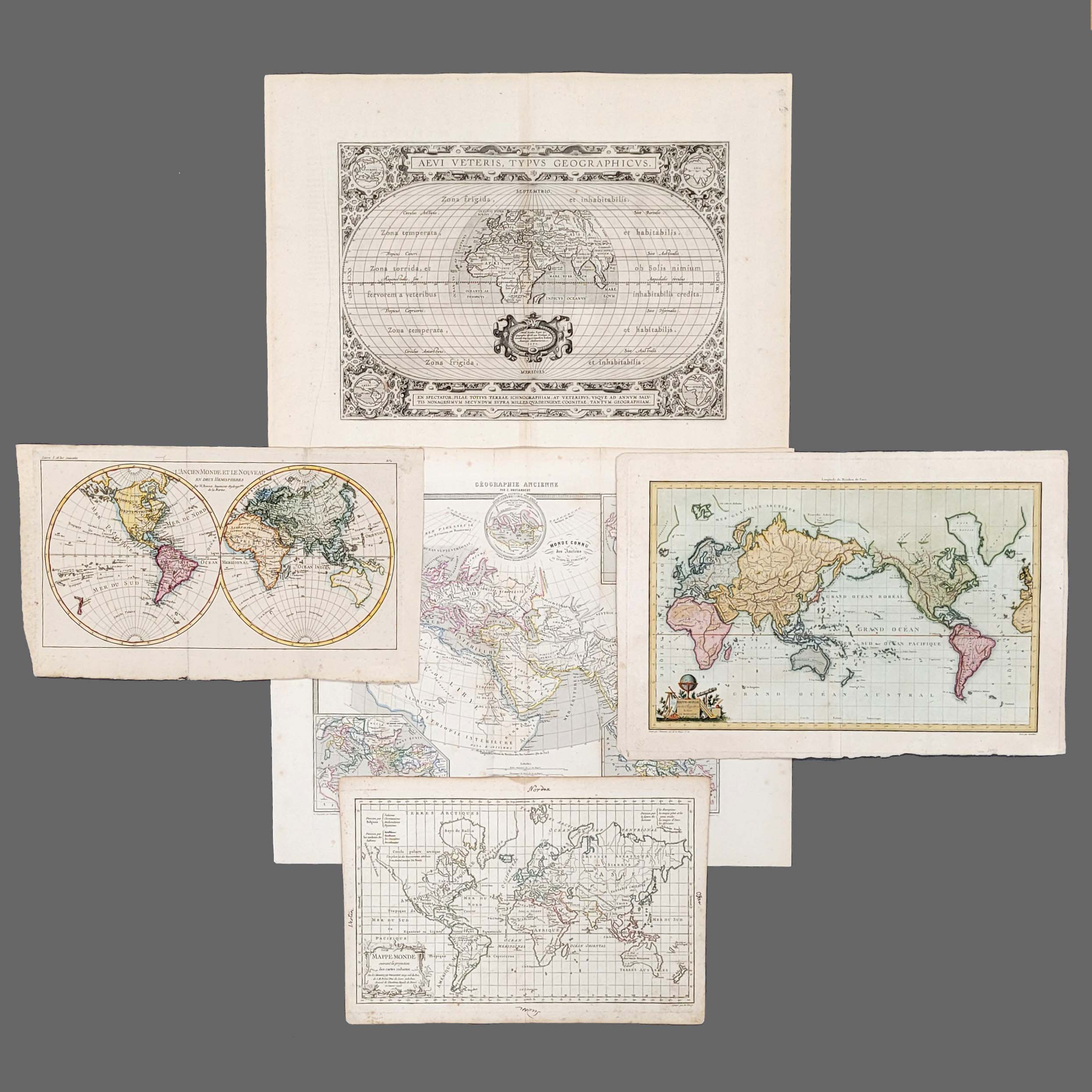 ORTELIUS, Abraham (1527-1598), Aevi veteris, typus geographicus, Kupferstich 1590/1601, 49 x 59 cm 3 französische Weltkarten des 18. Jahrhunderts (Vaugondy, Bonne, Giraldon), Kupferstiche, koloriert, bis zu 35 x 51 cm beigelegt CORTAMBERT, Eugène (1805-1881), Géographie ancienne, Stahlstich, 1864, grenzkoloriert, 48 x 60 cm