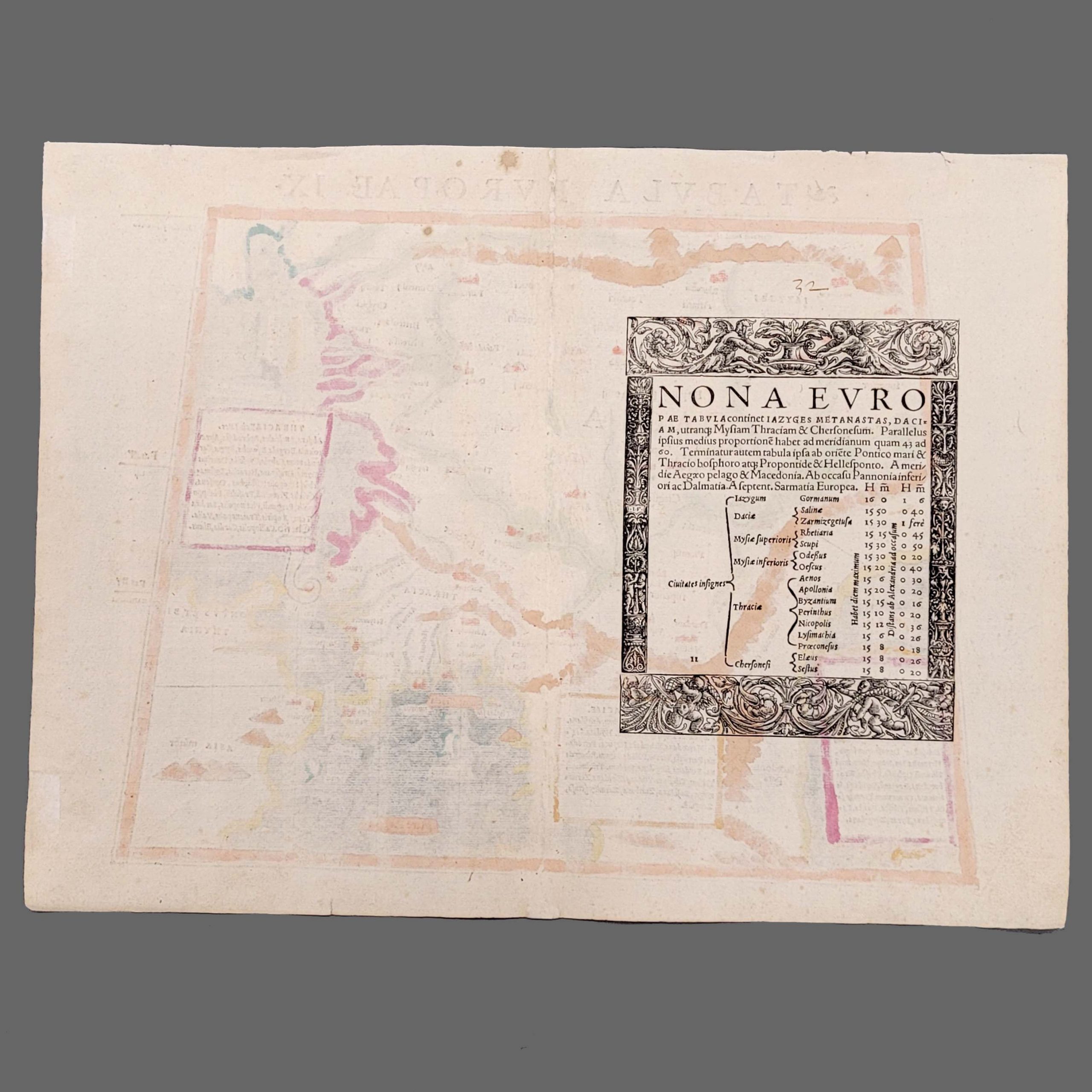 MÜNSTER, Sebastian (1488-1552): Tabula Europae IX – DaciaHolzschnitt, koloriert, verso mit der Holbein-Kartusche, um 1550, 29,3 x 39 cm