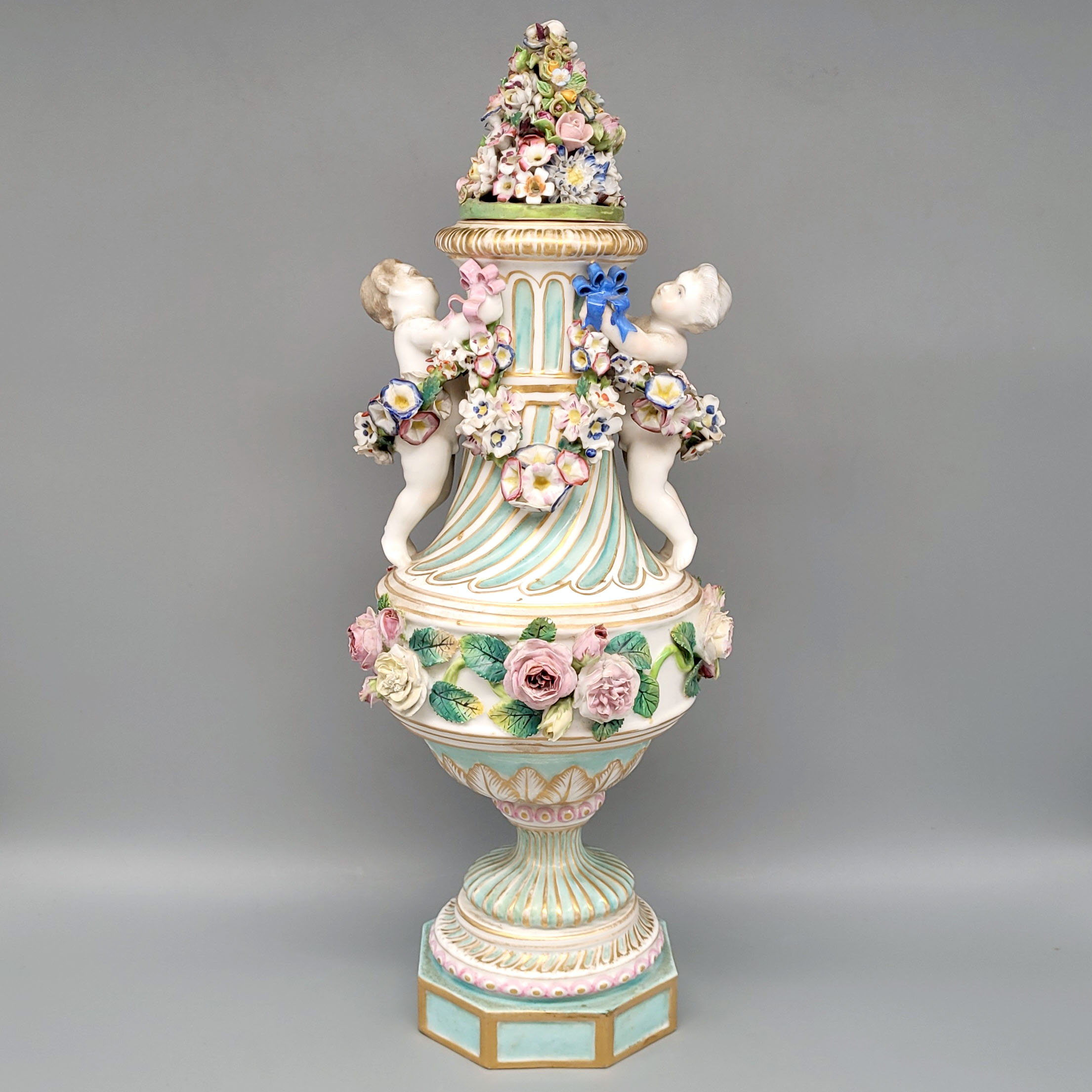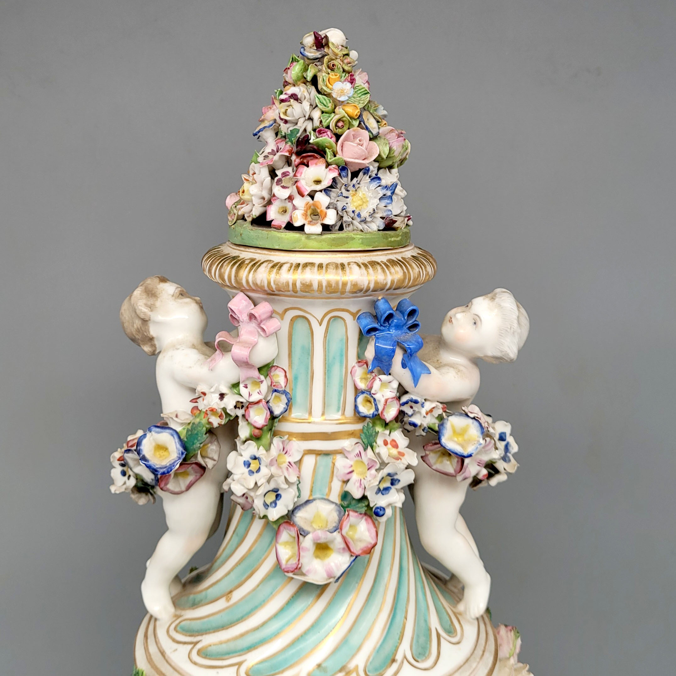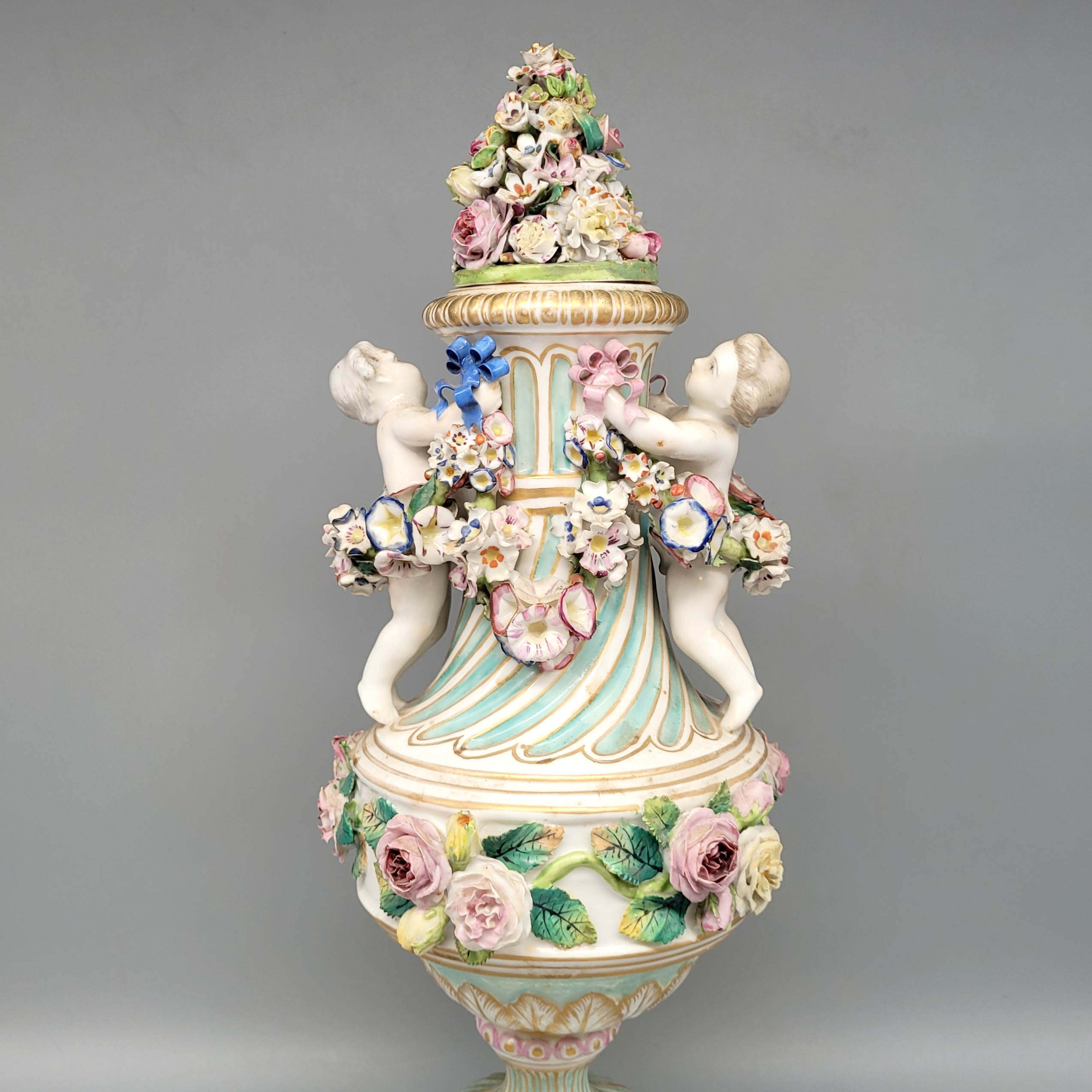 Porzellan, bemalt und vergoldet, vergoldeter plastischer Blüten- und Figurendekor, Schwertermarke, 19. Jahrhundert, Höhe 42 cm (minimale Fehlstellen an den Blüten, Deckel zugehörig[?])