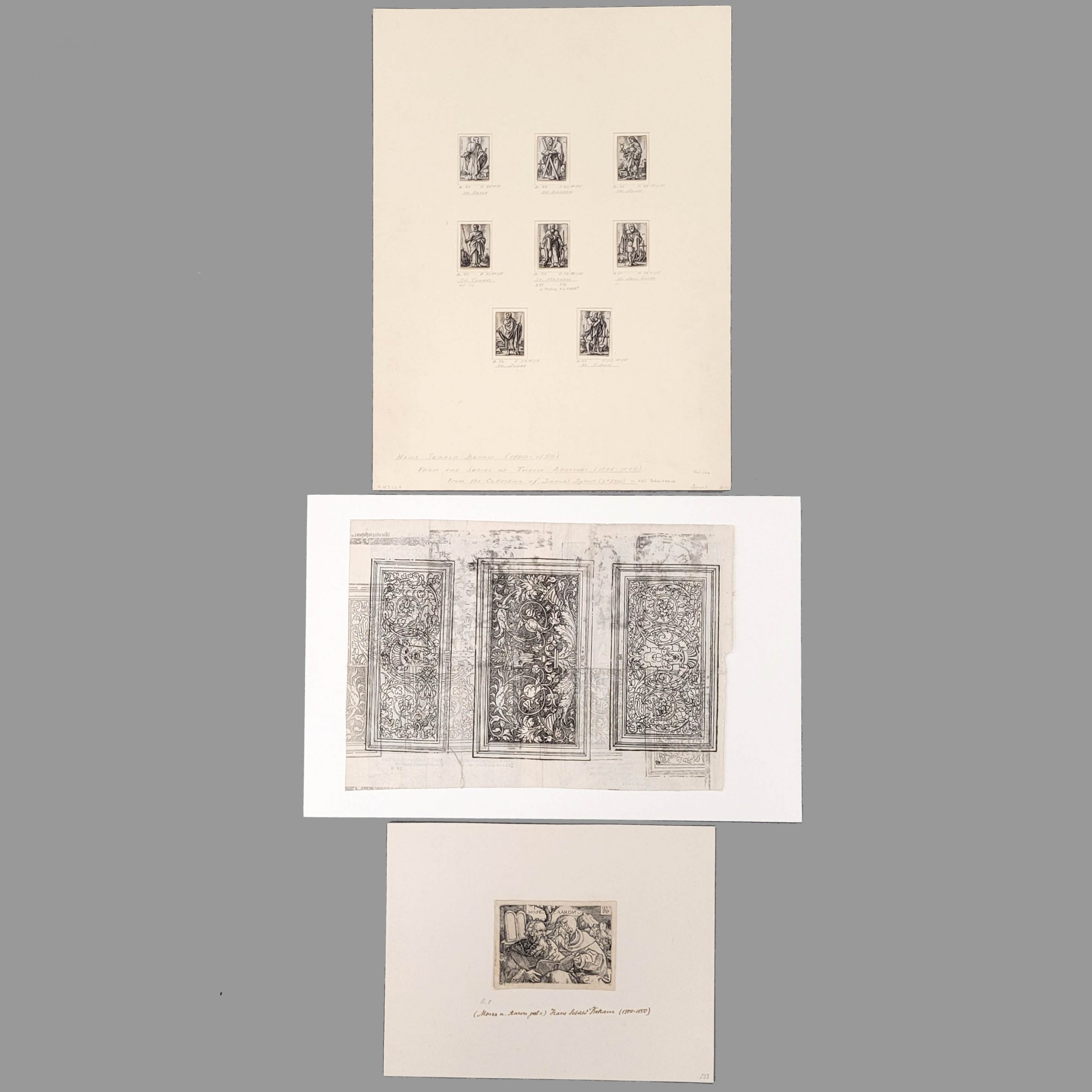 Kupferstiche, 1526 bzw. 1545-1546, 8,5 x 12 cm bzw. je ca. 4 x 3 cm, beigelegt BEHAM, Hans Sebald, 3 Dekorationsentwürfe, 1546 auf Buchseite von 1619 gedruckt 39 x 26,5 cm, alle montiert auf Karton