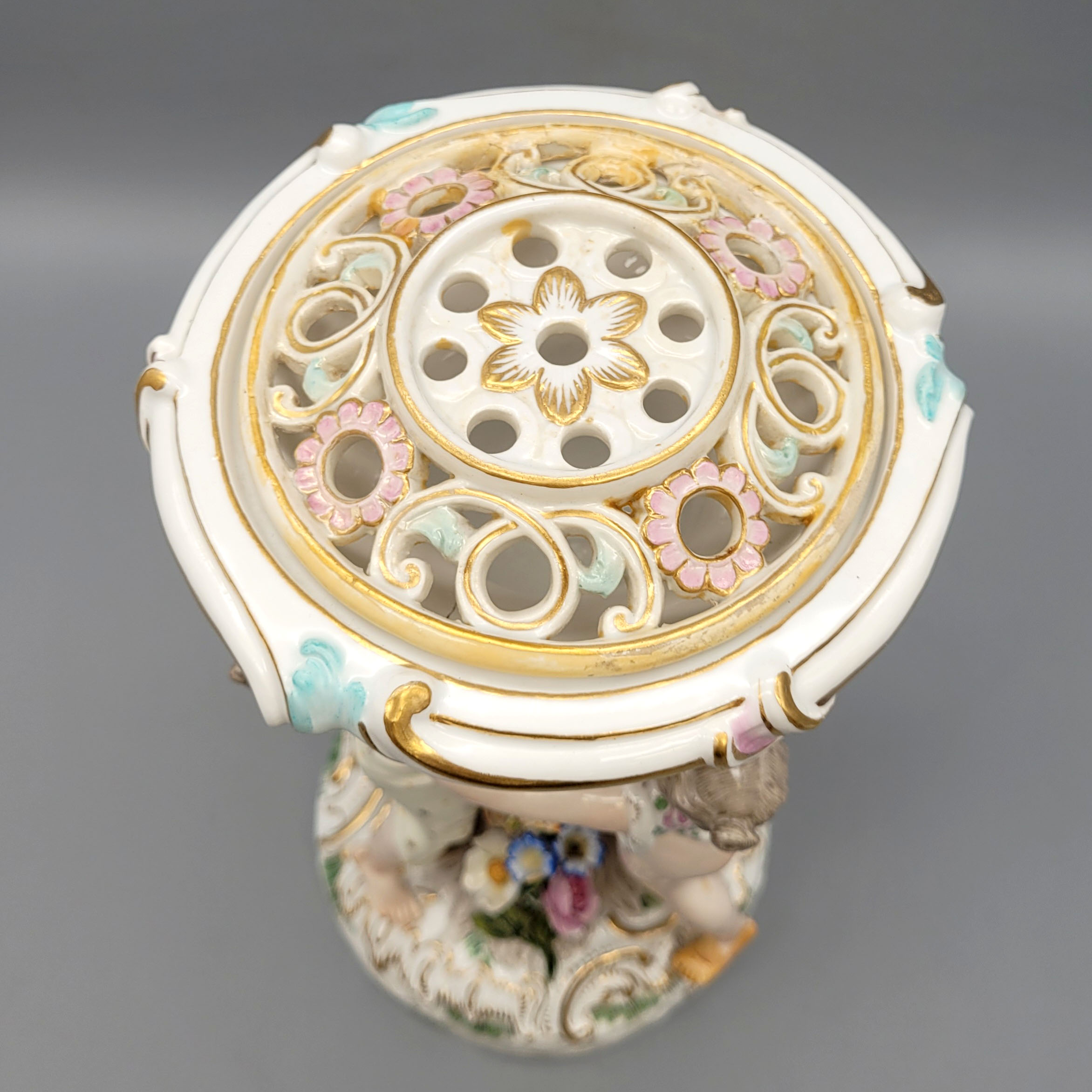 Porzellan, bemalt und vergoldet, Meissen, Modellnr. 2685, Entwurf Johann Joachim Kaendler, 1759, Knaufschwertermarke, 1 Schleifstrich (1860-1924), Höhe 25 cm (Deckel, eine Hand und ein Fuß alt restauriert, Fehlstellen an Blüten und Blättern, minimale Brandrisse)