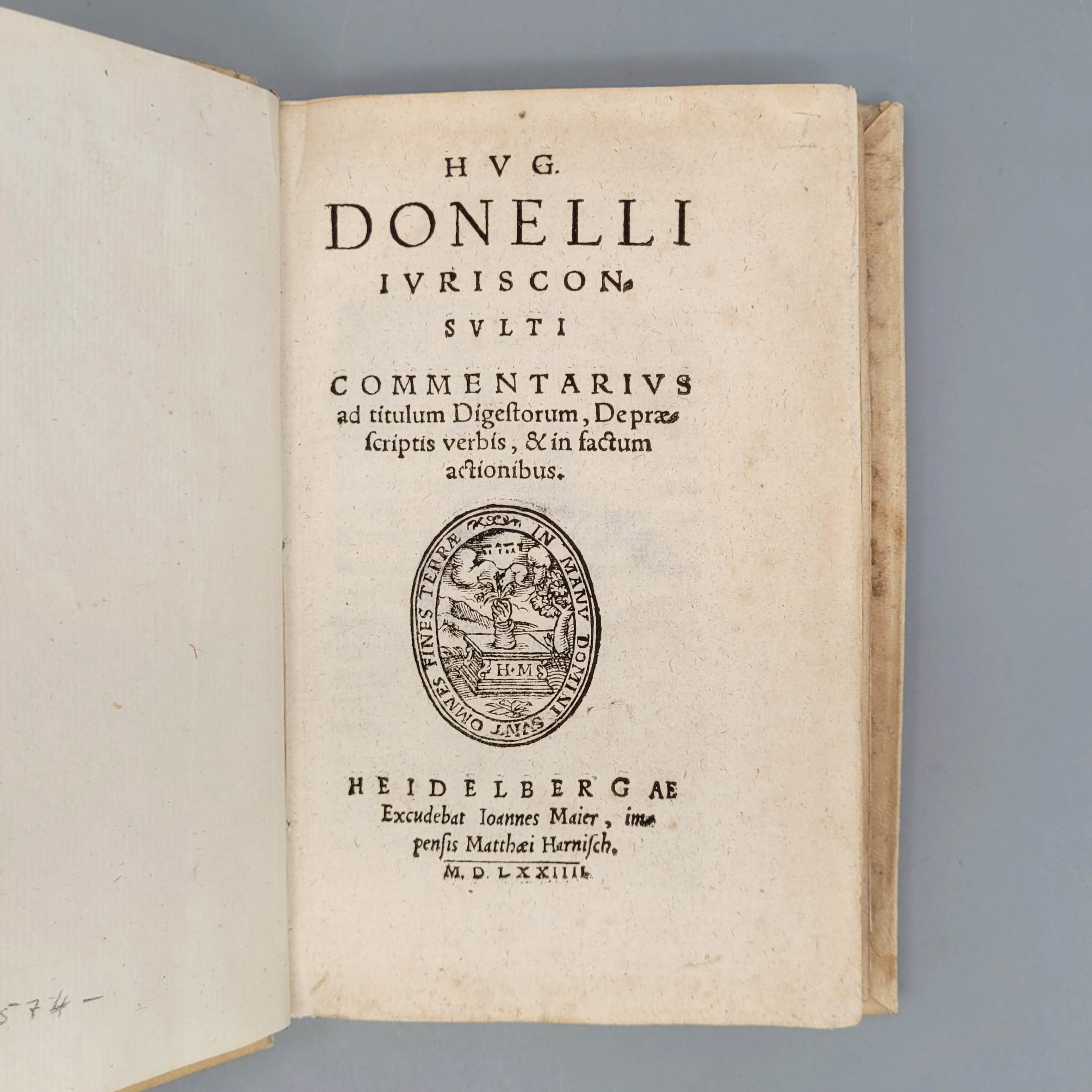 DONEAU, Hugues: Hug. Donelli iurisconsulti commentariusHeidelberg (Maier / Harnisch) 1574 (späterer Pergamenteinband, mit der Druckermarke von 1573)Wir weisen darauf hin, dass das Buch nicht kollationiert ist.
