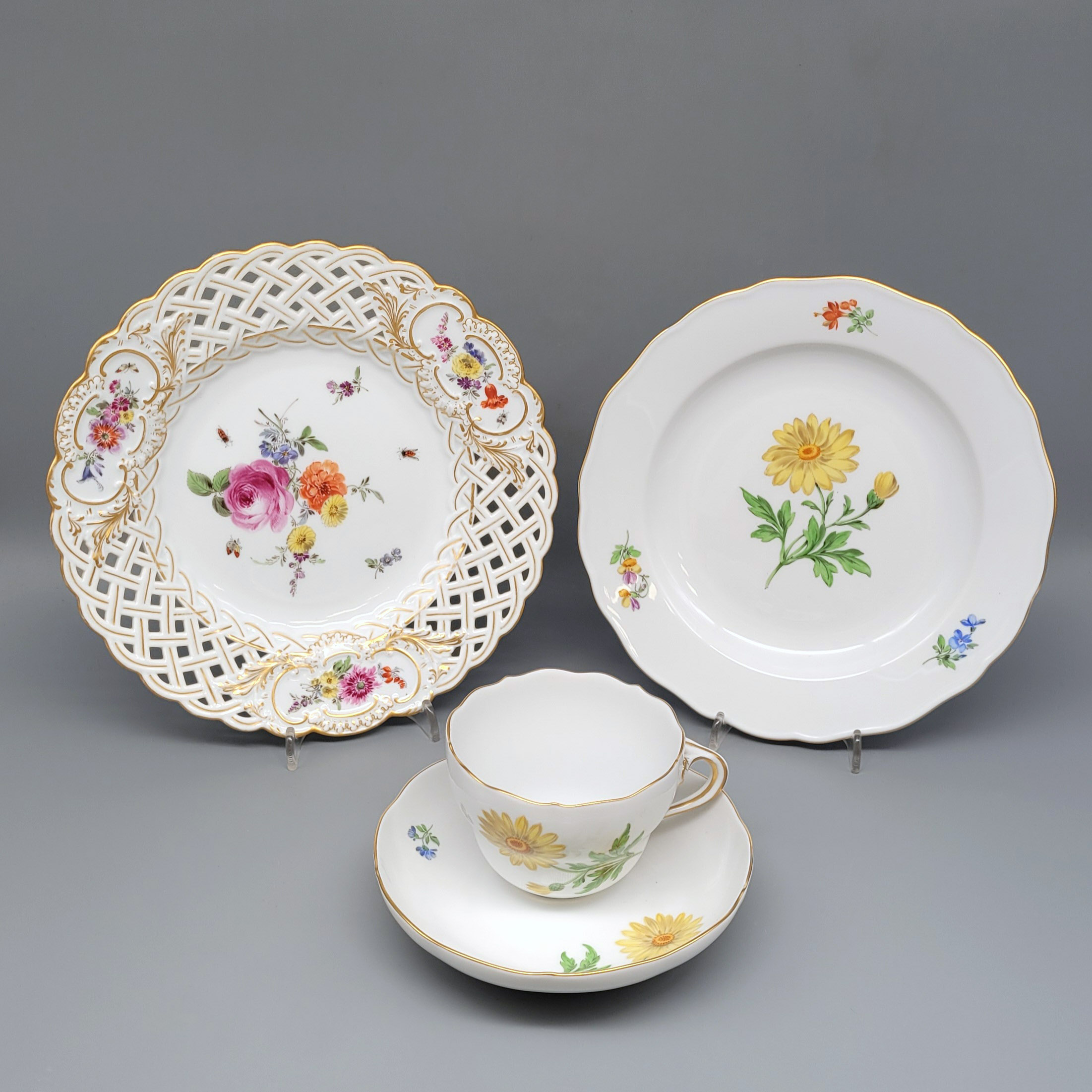 Teller, Porzellan, Blumenmalerei mit Insekten, Meissen, Knaufschwertermarke, Jubiläumsmarke 1710-1910, Durchmesser 21 cm Gedeck, Porzellan, Blumenmalerei, Randvergoldung, Meissen, Durchmesser Teller 20 cm