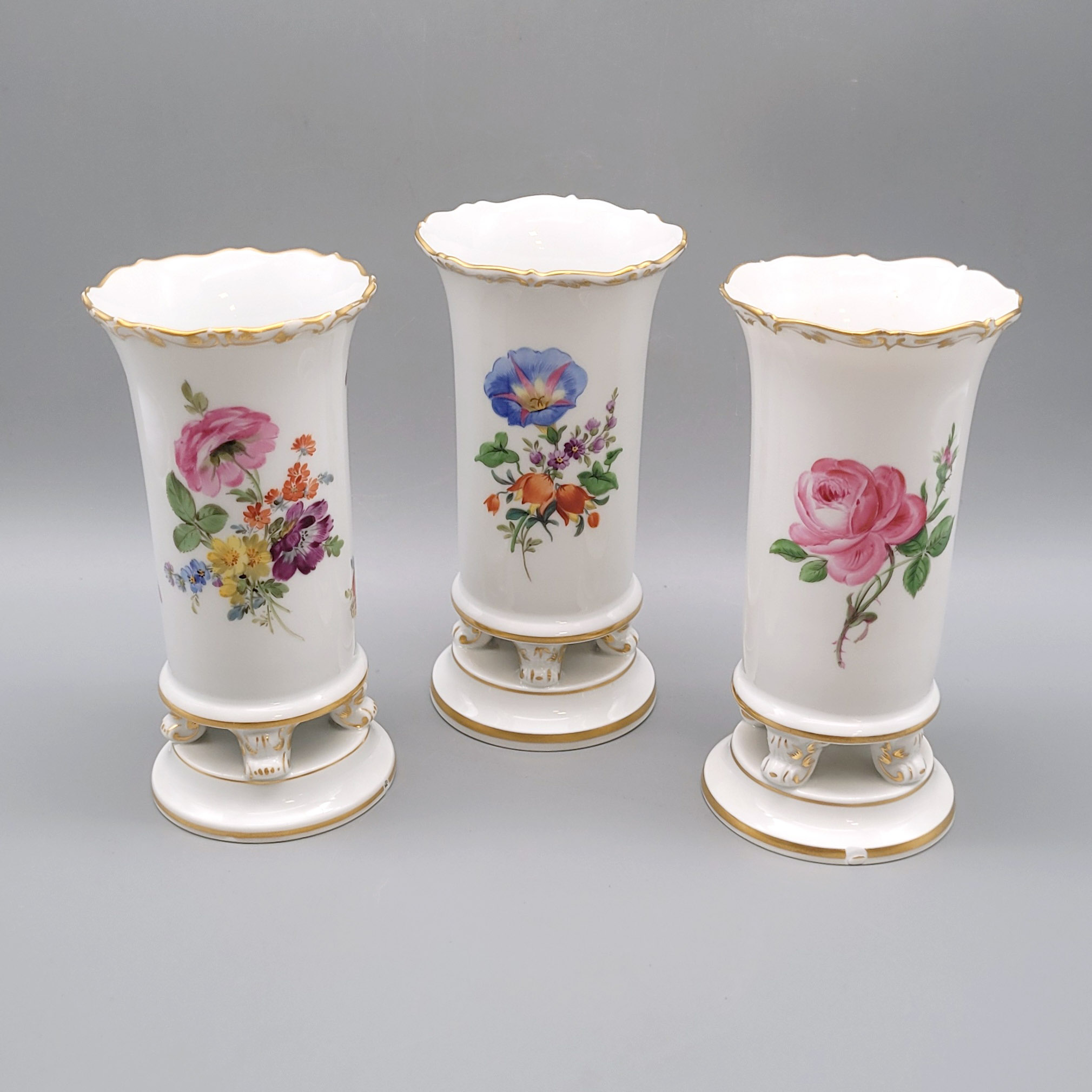 Porzellan, bemalt und vergoldet, Meissen, Knaufschwertermarke (1x), Blumenmalerei und Insekten (1x), Höhe 14 cm (Vase Dekor „Rote Rose“ II. Wahl und Chip am Standring)