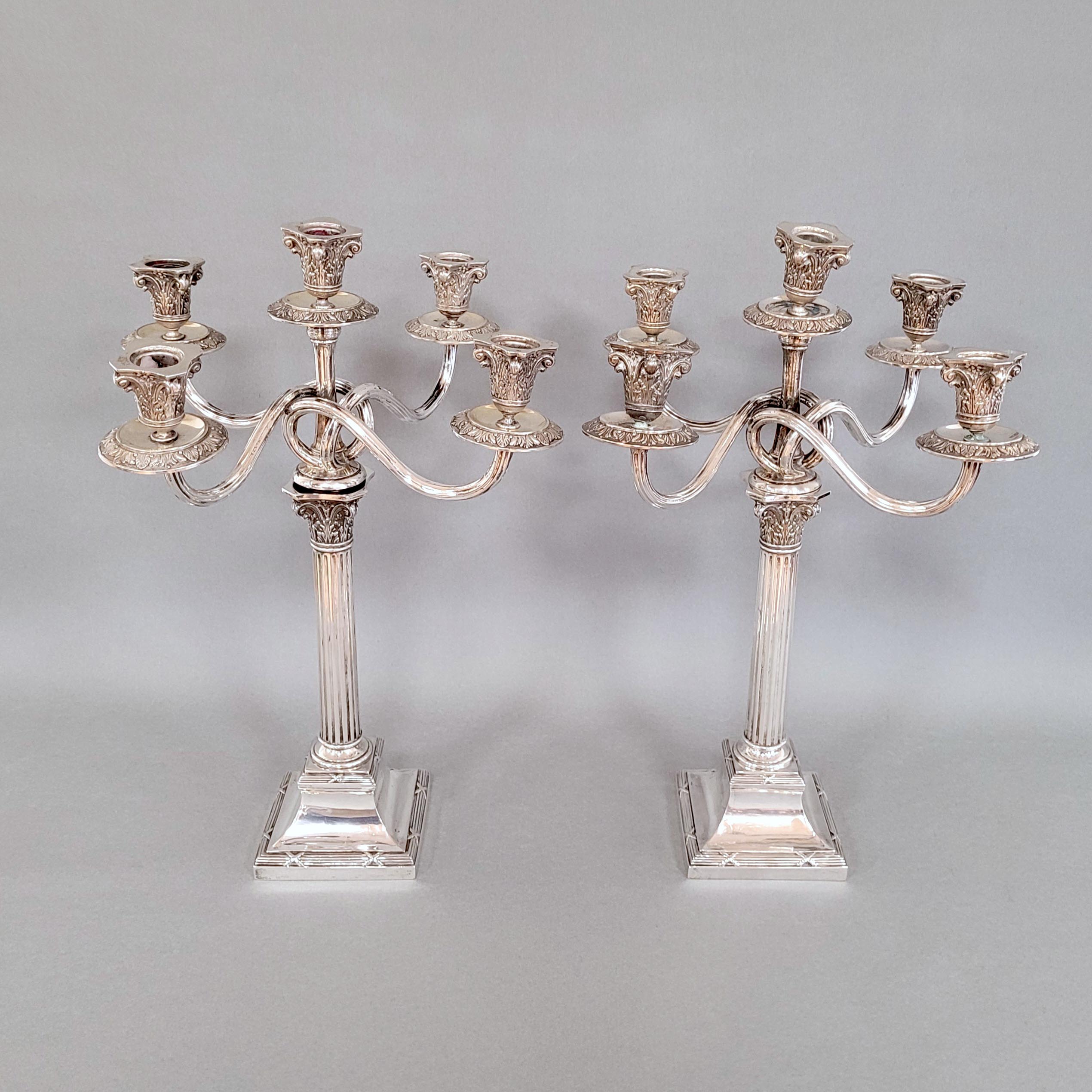 Paar fünfarmige GirandolenSilber (nicht gemarkt), Bodenplatte aus Metall, Schaft in Säulenform, Deutsch, um 1900, Höhe 45 cm, Gesamtgewicht ca. 2850g (ein Leuchter an der Basis mit kleiner Beschädigung)
