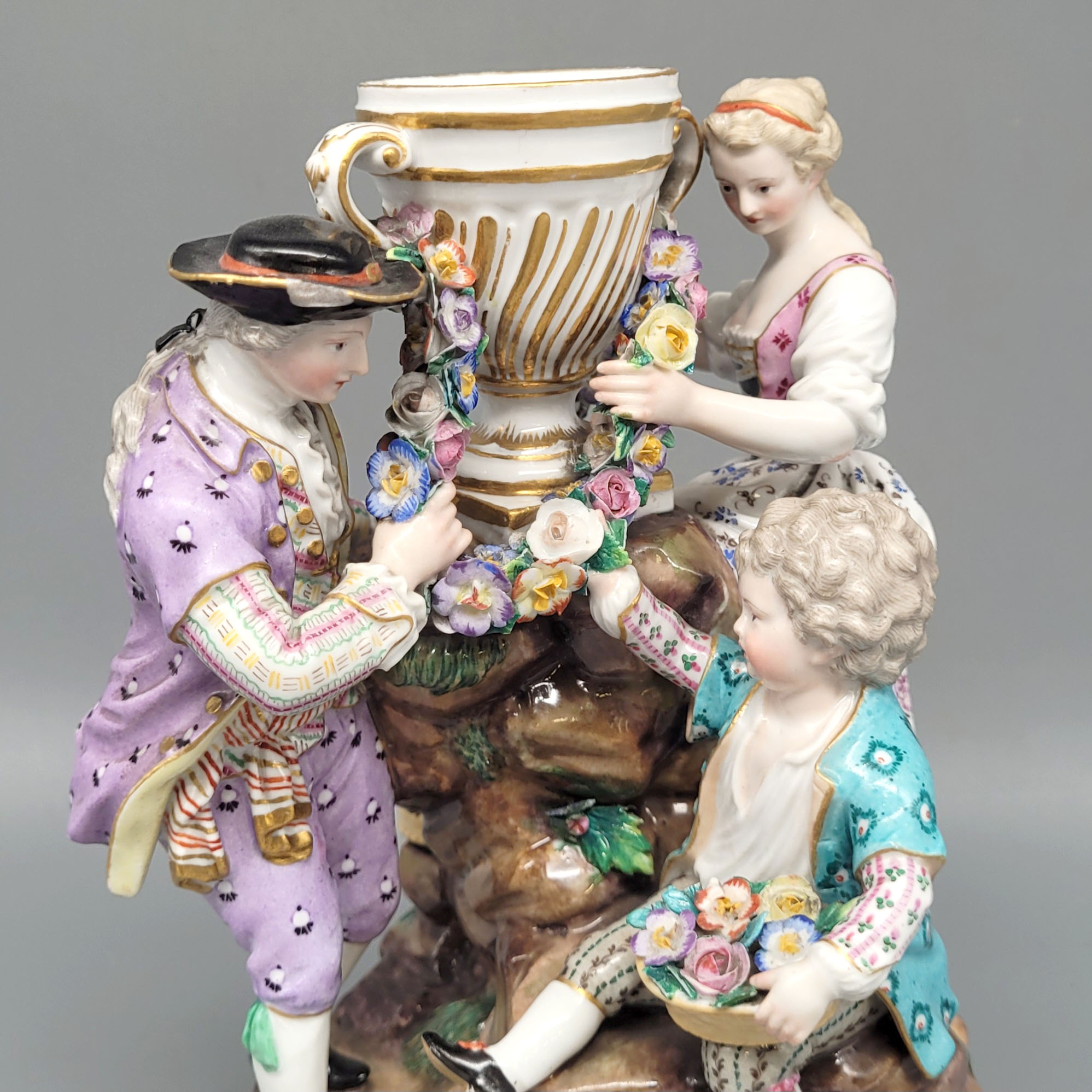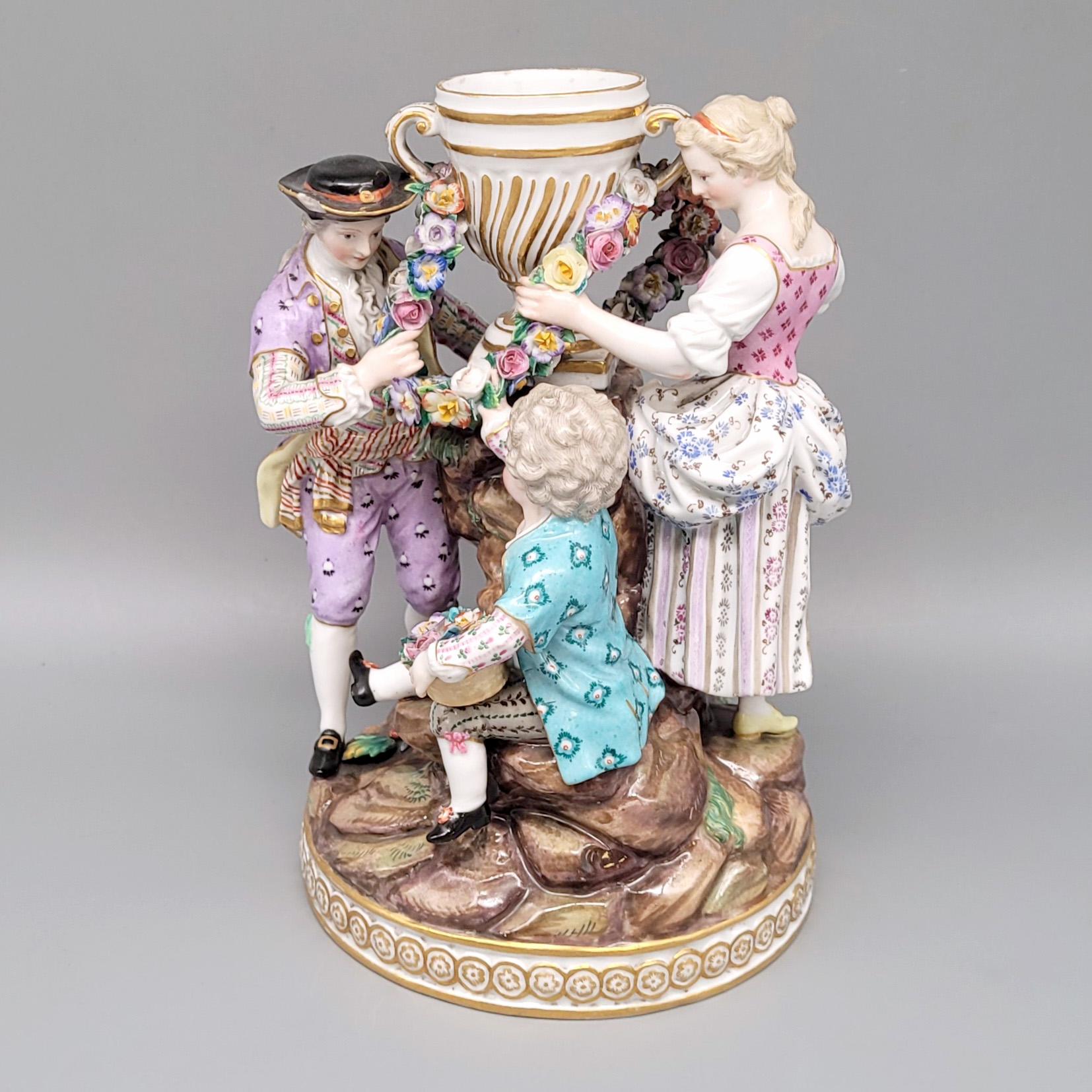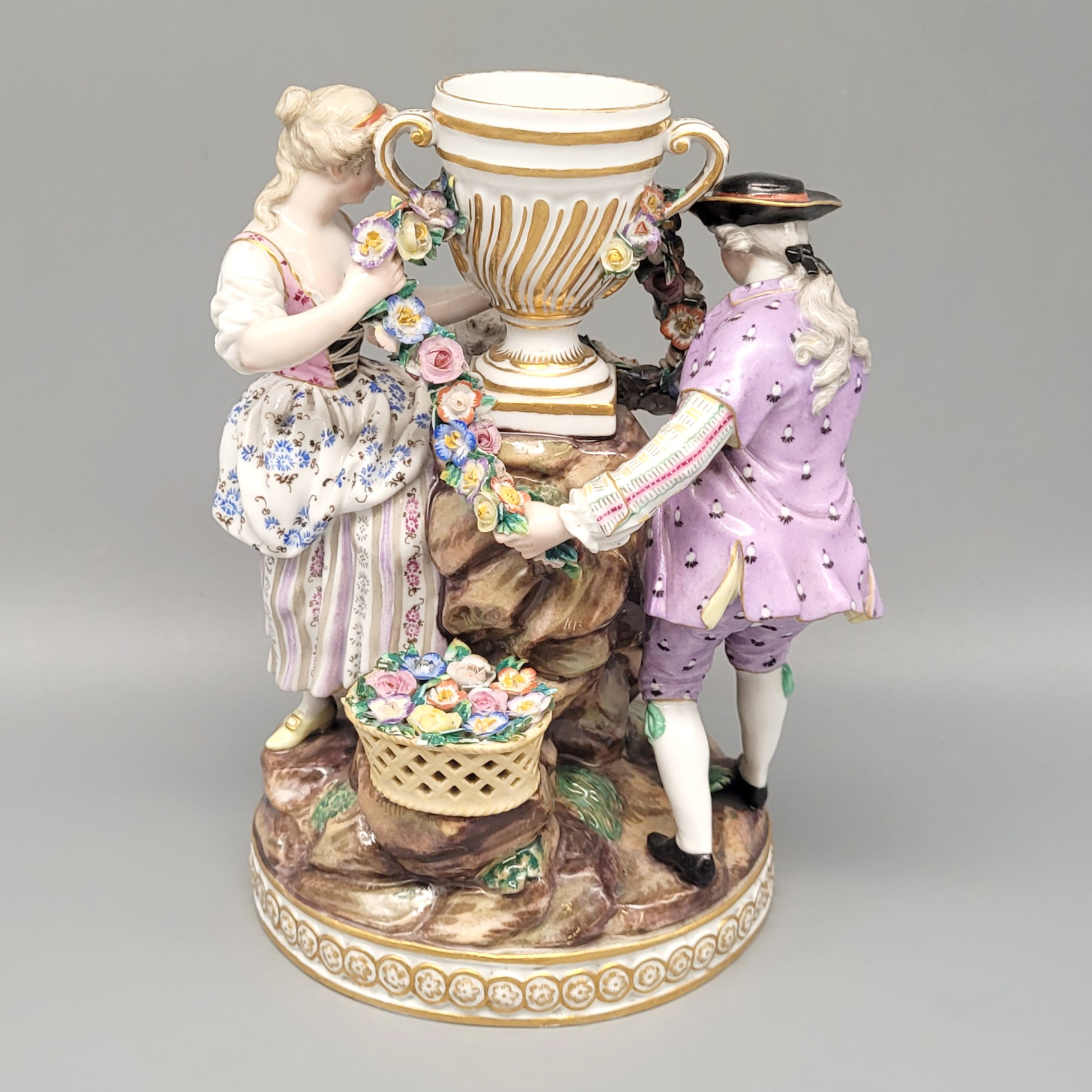 Galantes Paar mit Blumengirlanden um eine UrnePorzellan, bemalt und vergoldet, Knaufschwertermarke, Modellnr. D 92, Höhe 19 cm (Fehlstellen an der Hutkrempe und an einigen Blüten)