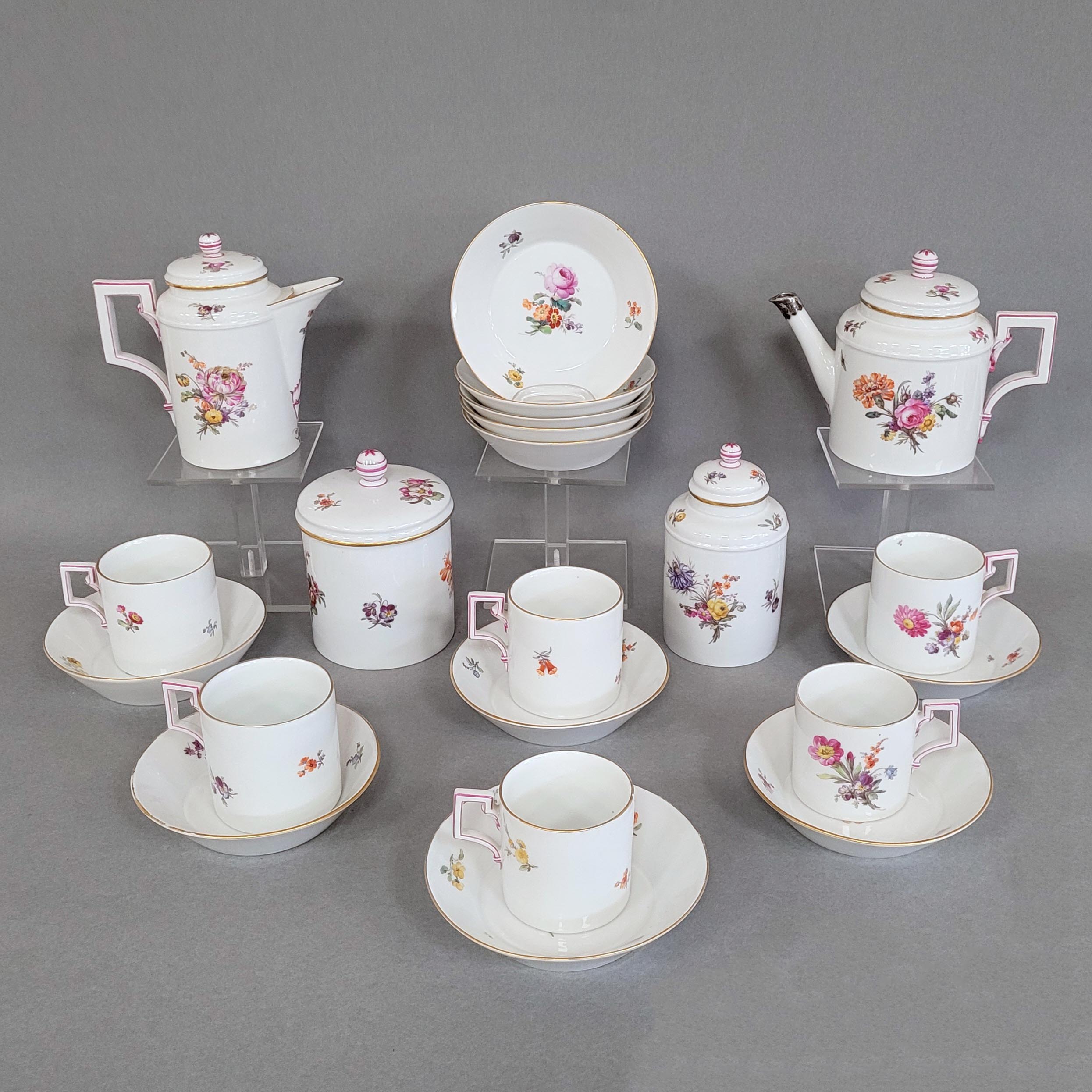 Porzellan, Blumenmalerei, Randvergoldung, Camieu-Rand, KPM Berlin, um 1780-1800, bestehend aus: 6 Tassen, 11 Untertassen, Mokka- und Teekanne, 2 Deckeldosen (Teekanne Tülle alt silbermontiert, 1 Untertasse mit Chip am Standring, partiell leichter Goldabrieb, leichte Gebrauchsspuren)