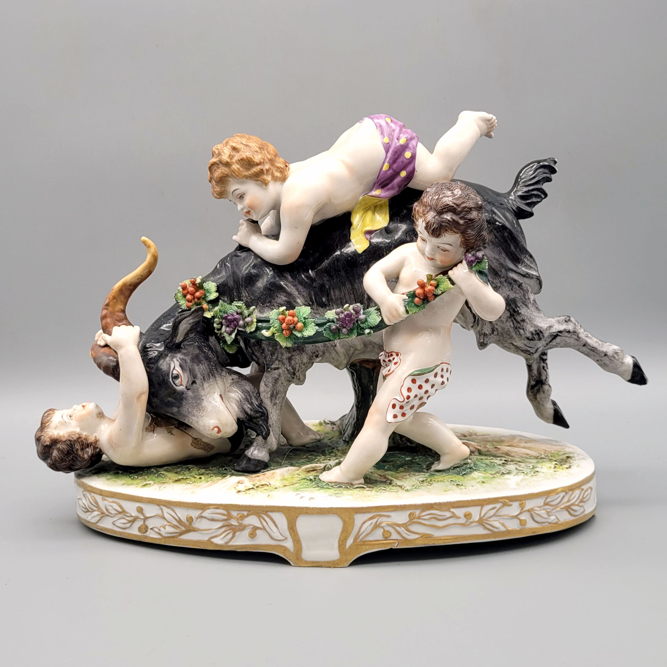 Drei Putti spielen mit einem Widder Porzellan, bemalt und vergoldet, Volkstedt, Rudolstadt, um 1920, möglicherweise Ernst Bohnen, Länge ca. 30 cm, Höhe 20 cm