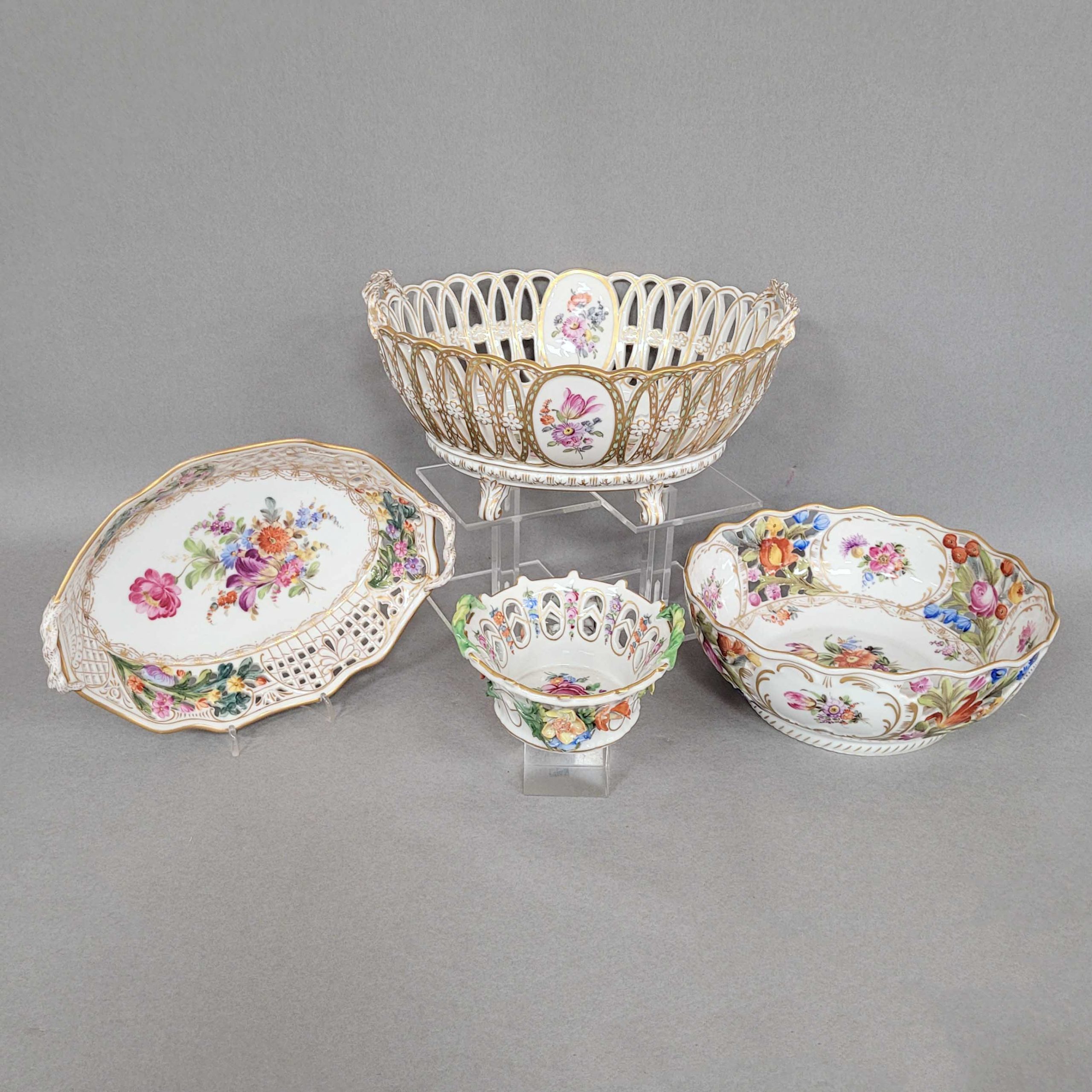 Vier Schalen und KörbePorzellan, bemalt und vergoldet, Asthenkel (3x), Blumenmalerei, Potschappel, Dresden, bis zu 14,5 x 28 x 21,5 cm, Durchmesser bis zu 21,5 cm