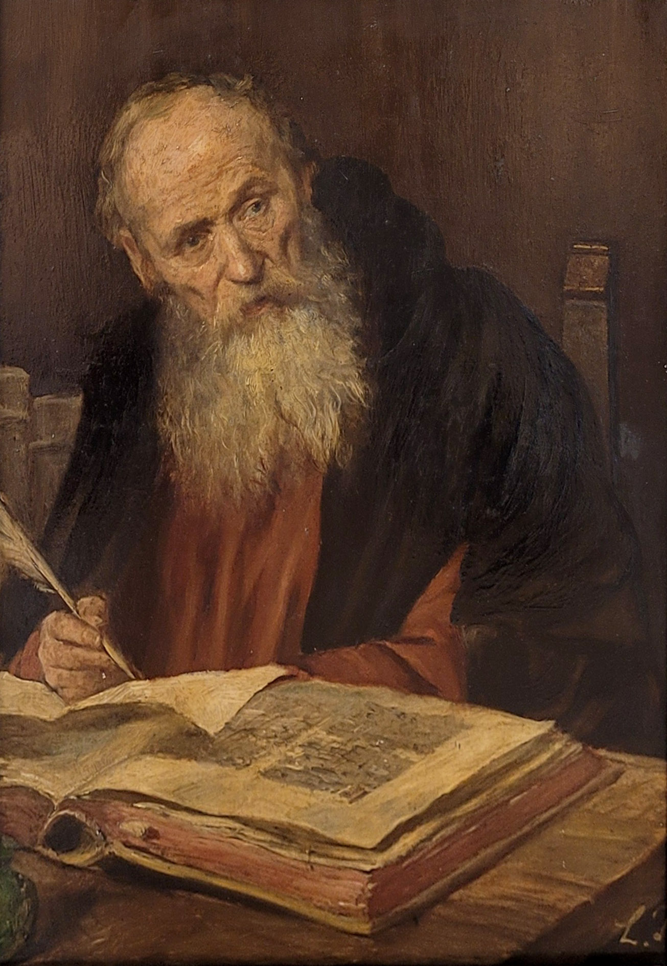 DEUTSCHER MEISTER (19. Jh.): Schreibender MönchÖl auf Holz, monogrammiert (S.P.) unten rechts, 41 x 31,5 cm, Rahmen