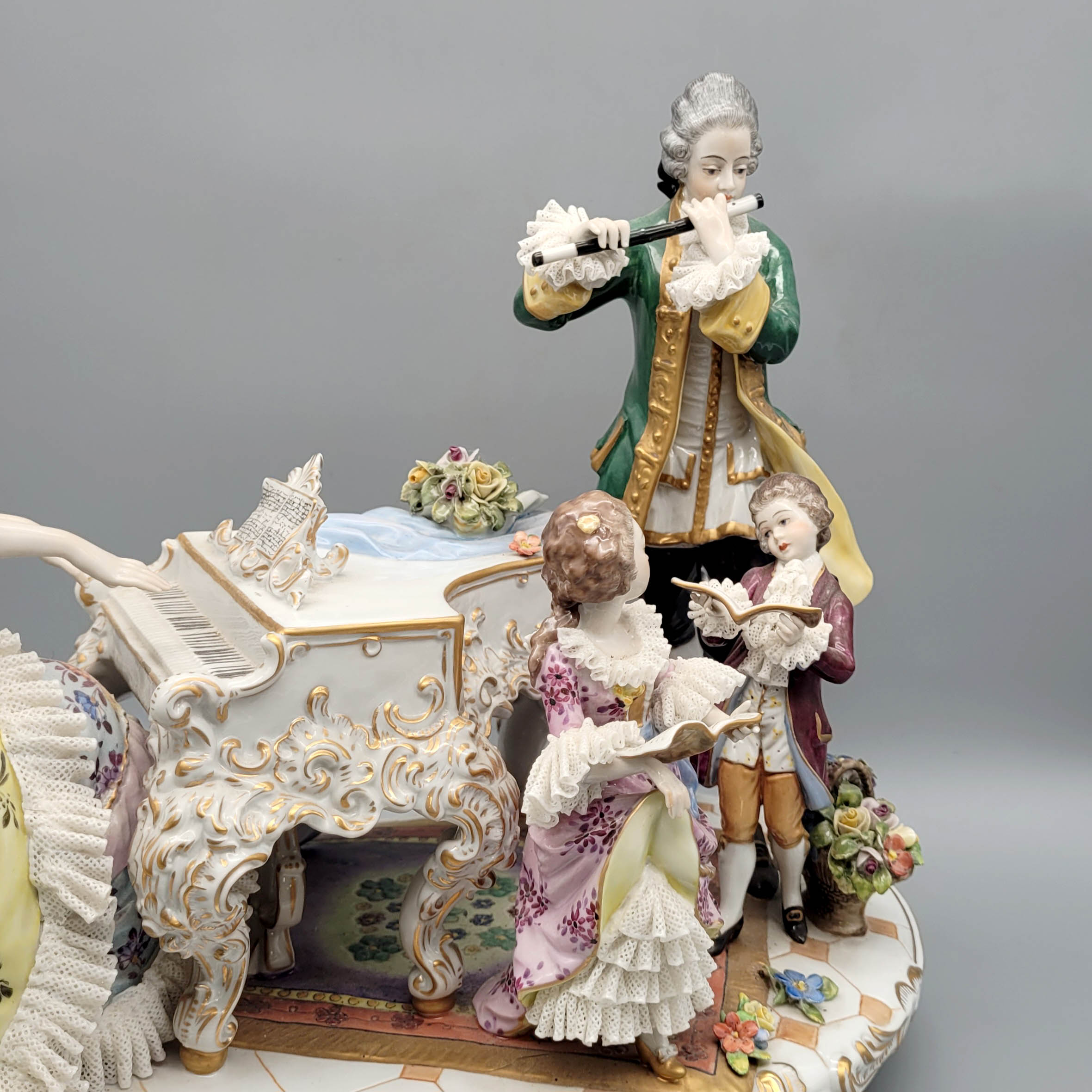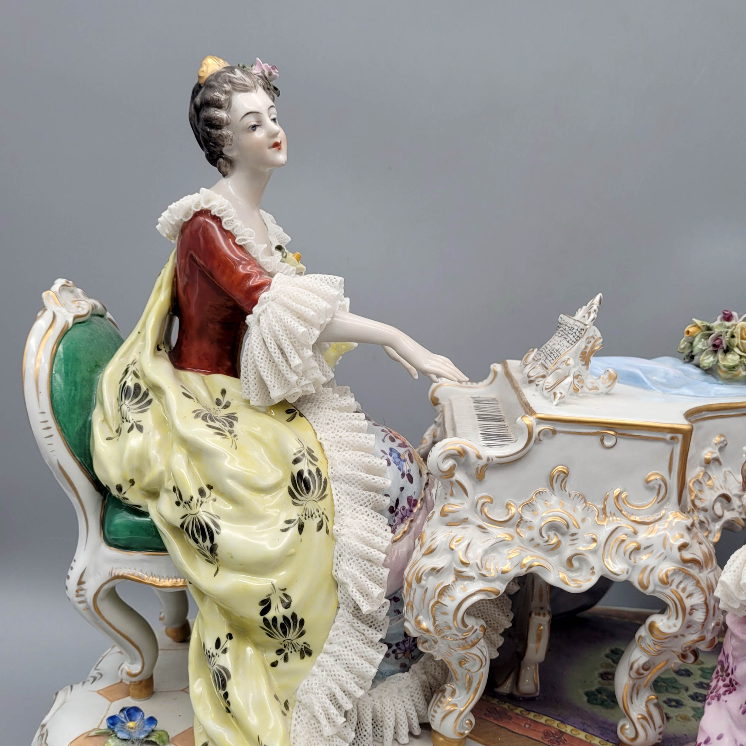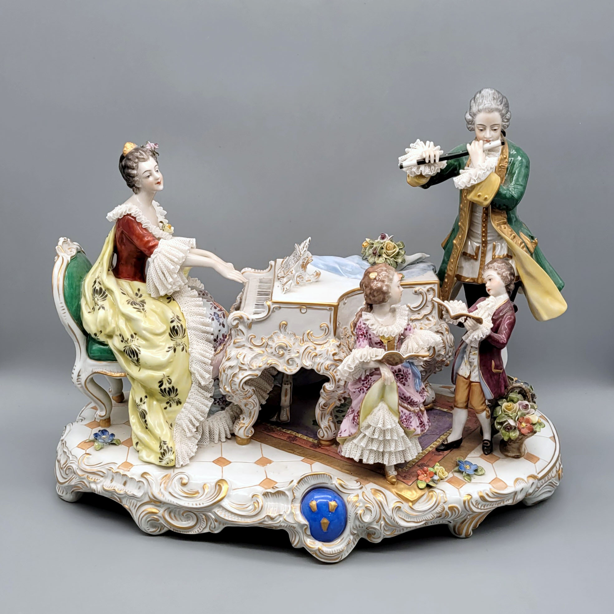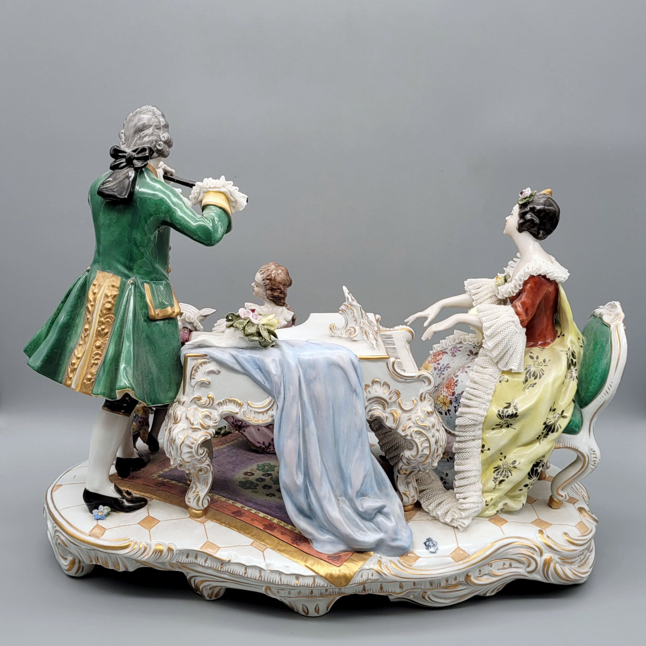 Die Musikstunde Figurengruppe, Porzellan, bemalt, vergoldet, Volkstedt Rudolstadt, Marke mit Zusatz 1762 (1977), Entwurf Carl Fuchs (1867-1951), Modellnr. V20523, 32 x 39 x 24 cm