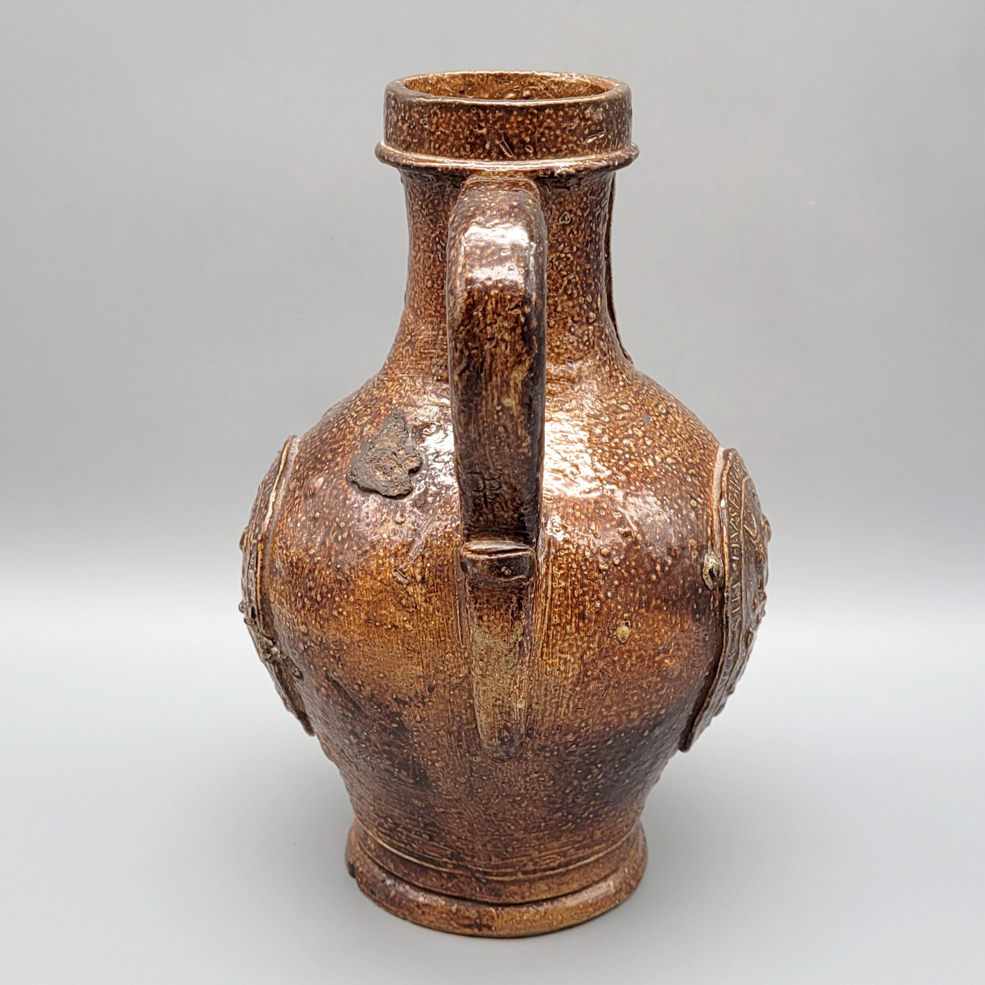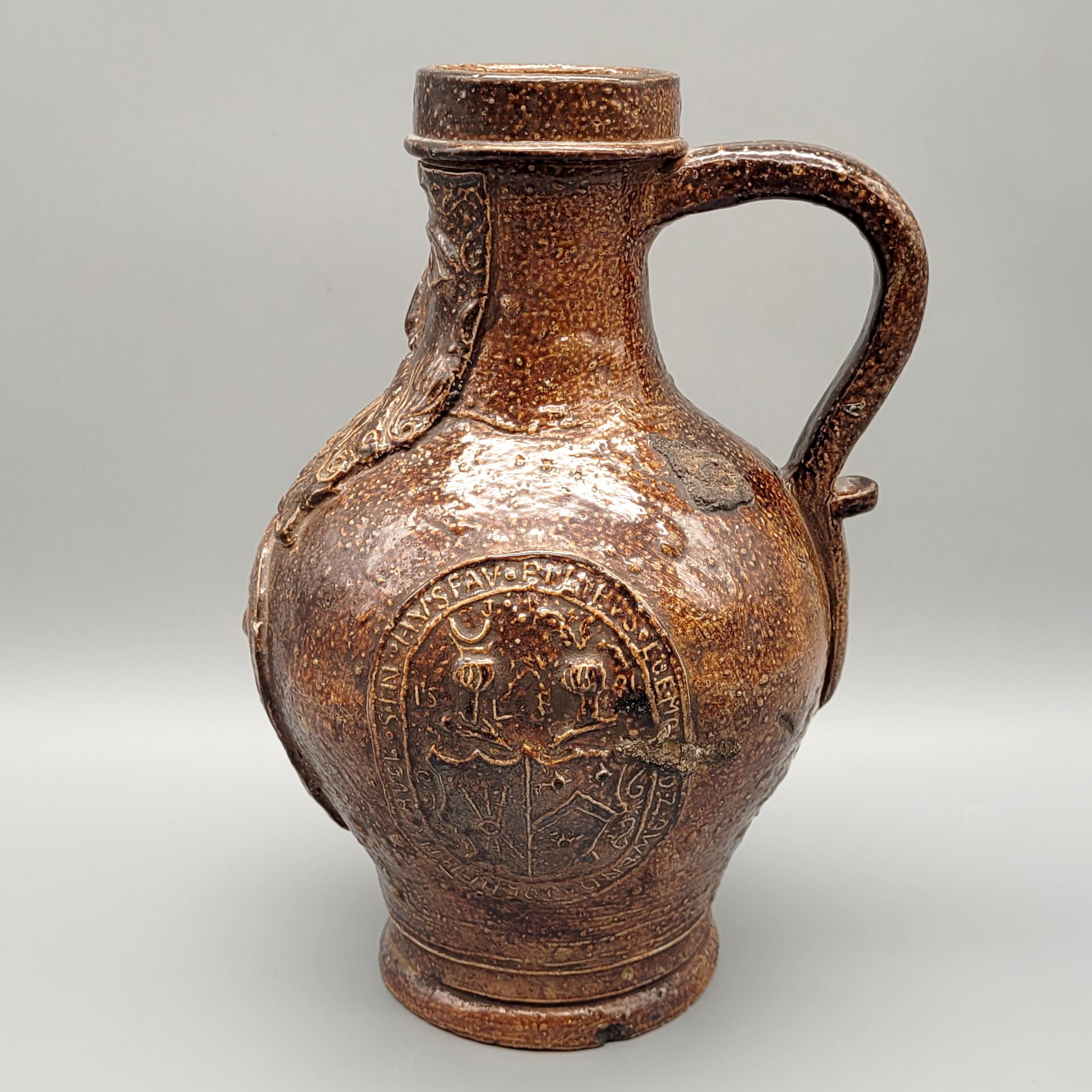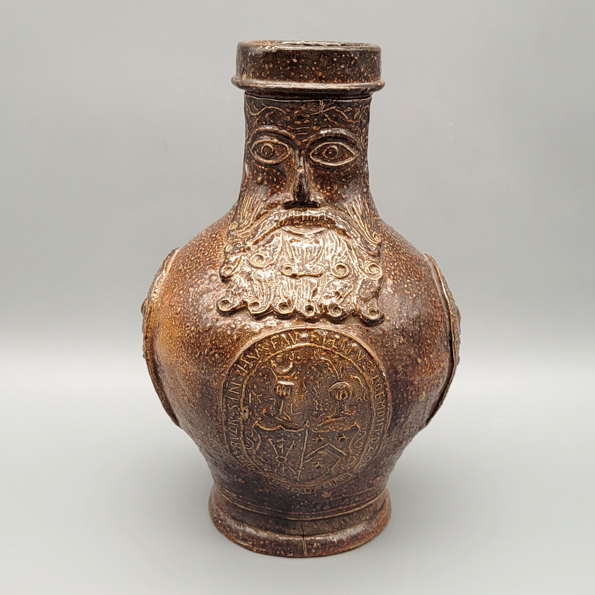 BartmannskrugSteinzeig, glasiert, Medaillons mit Allianzwappen, Frechen, um 1600, Höhe 23 cm