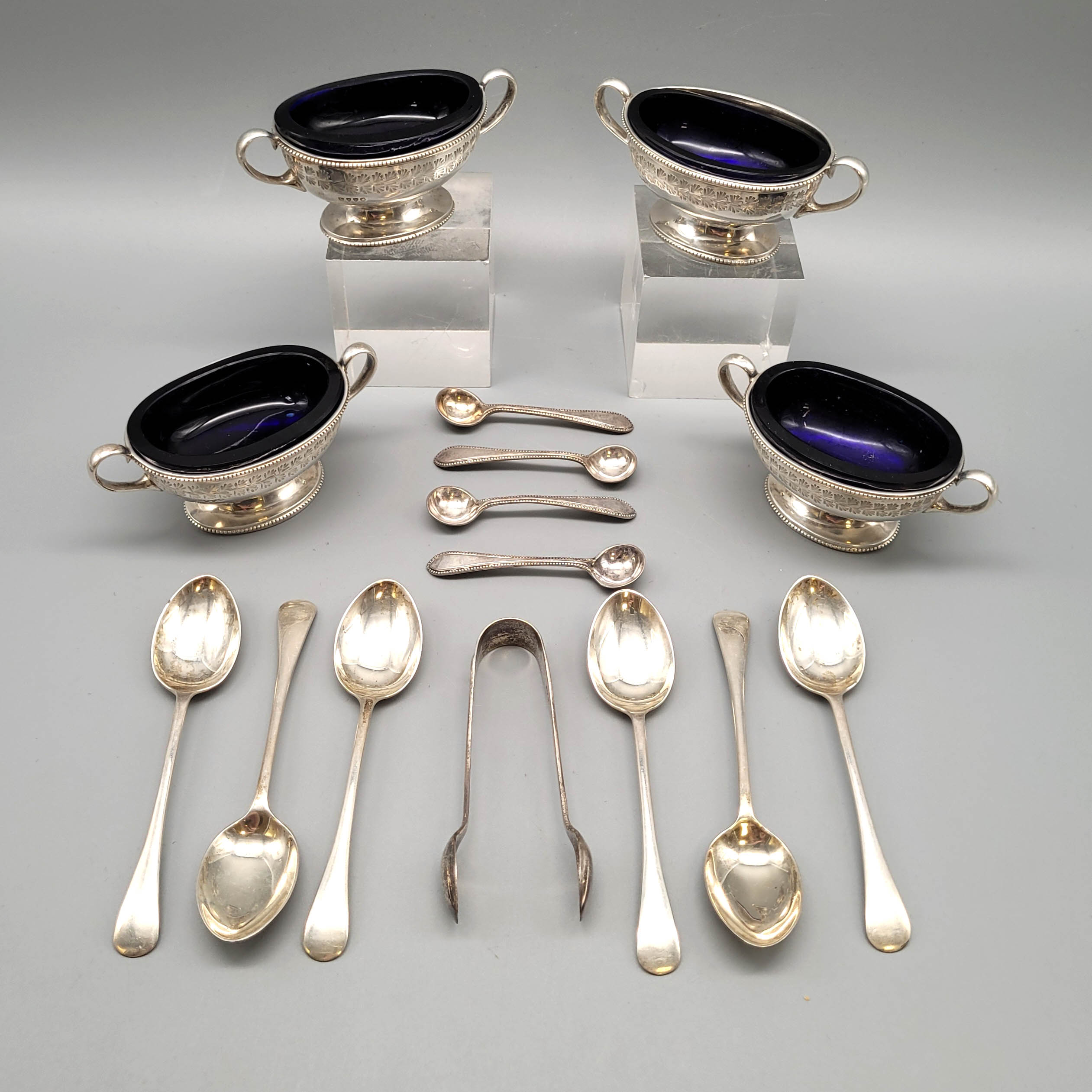 Set von vier Gewürzschälchen mit Löffeln / Sechs Kaffeelöffel und Zuckerzange