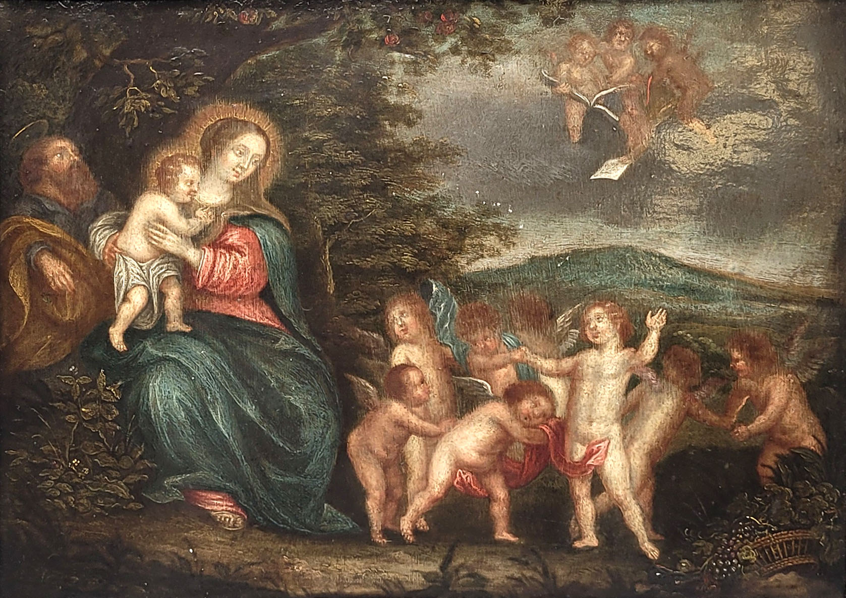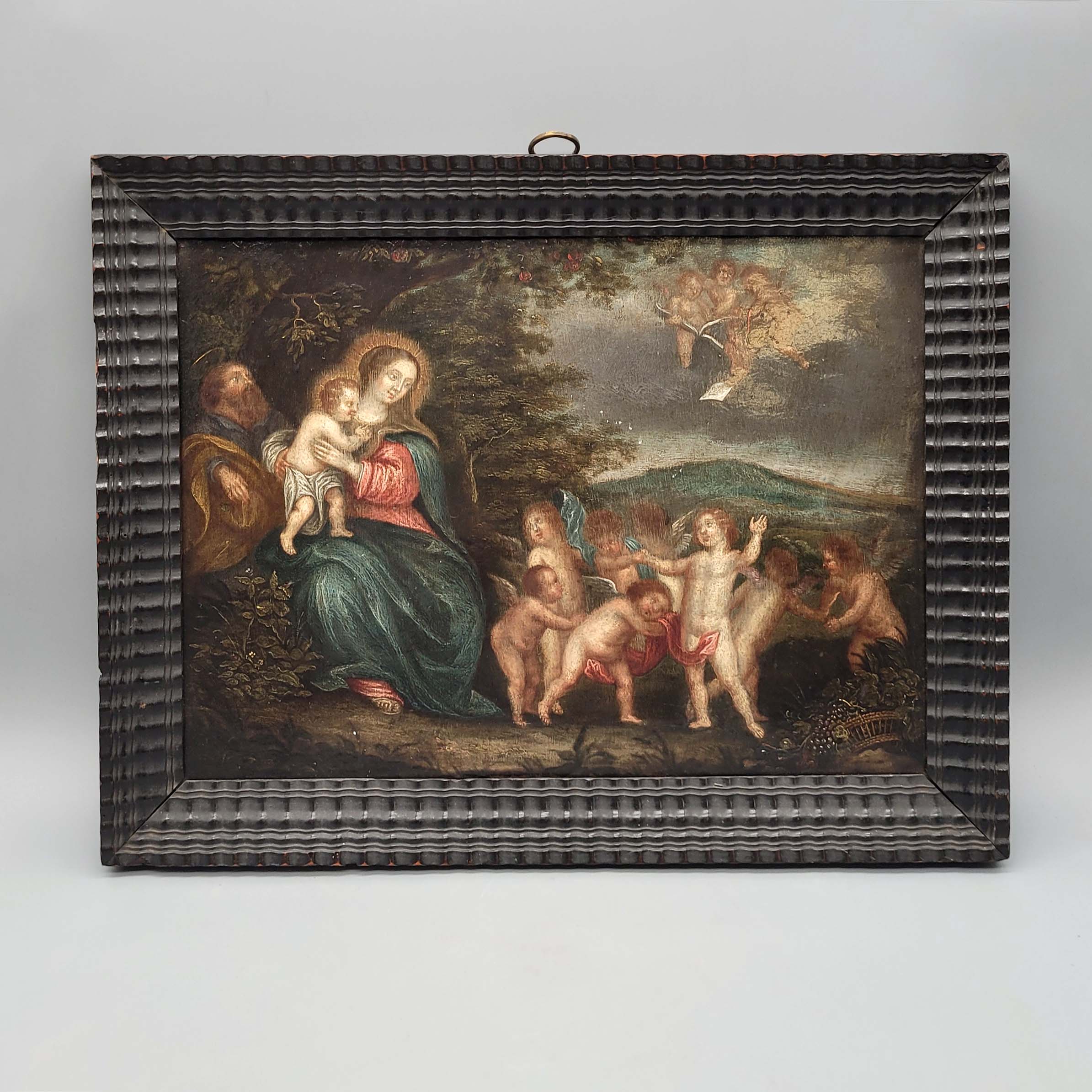 FLÄMISCHER MEISTER (um 1700): Heilige Familie mit PuttenÖl auf Kupfer, auf Holz gelegt, dort Zuschreibung an Hendrik van Balen (1575-1632), 23 x 33 cm, Rahmen