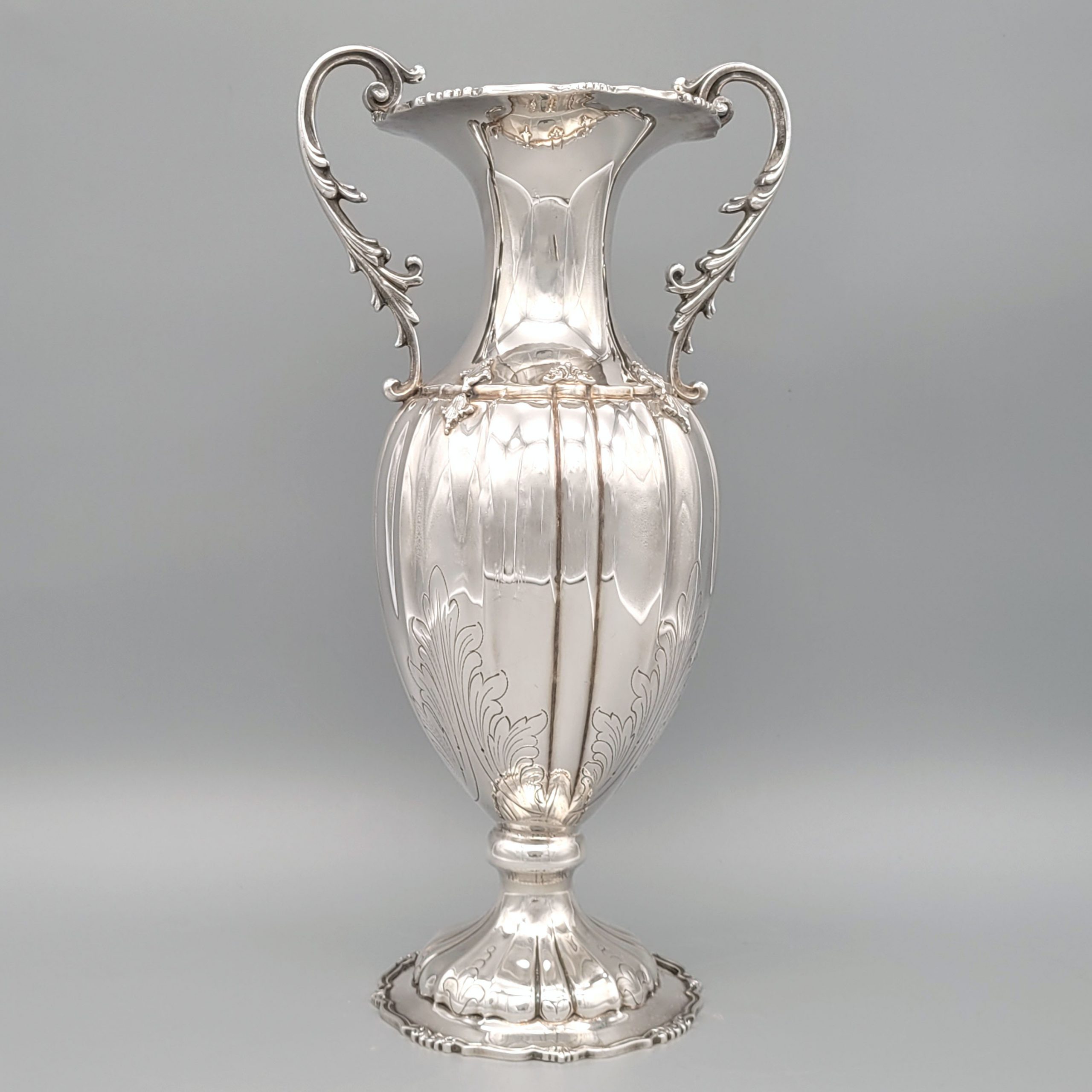 Henkelvase800er Silber, Fuß und Wandung mit graviertem Blattdekor, Italien 20. Jahrhundert, Höhe 30 cm, Gewicht 586g