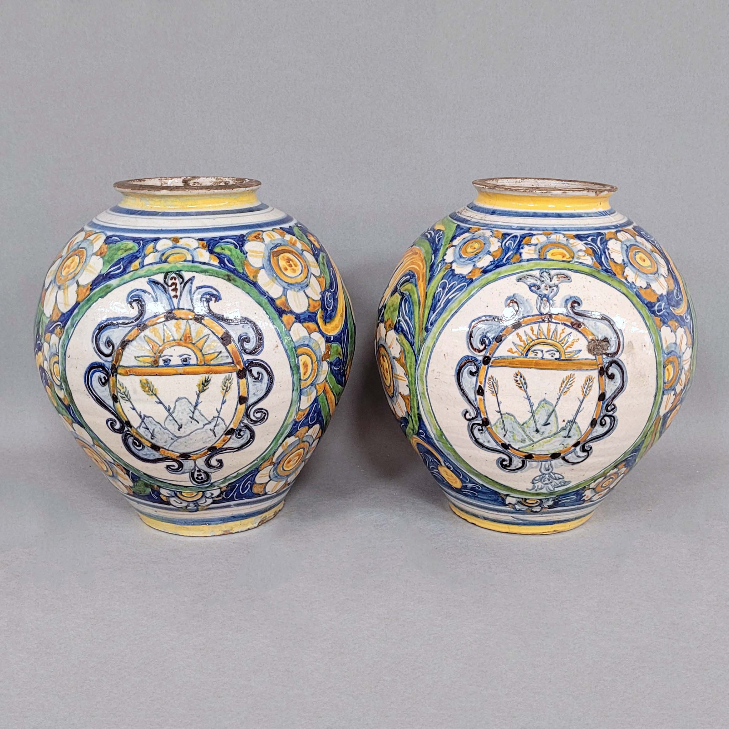 Fayence, polychromer Ranken- und Blütendekor, Kartusche mit wappenartiger Darstellung einer halben Sonne und baumbestandenes Gebirge, Italien, 18. Jahrhundert, Höhe 30 cm