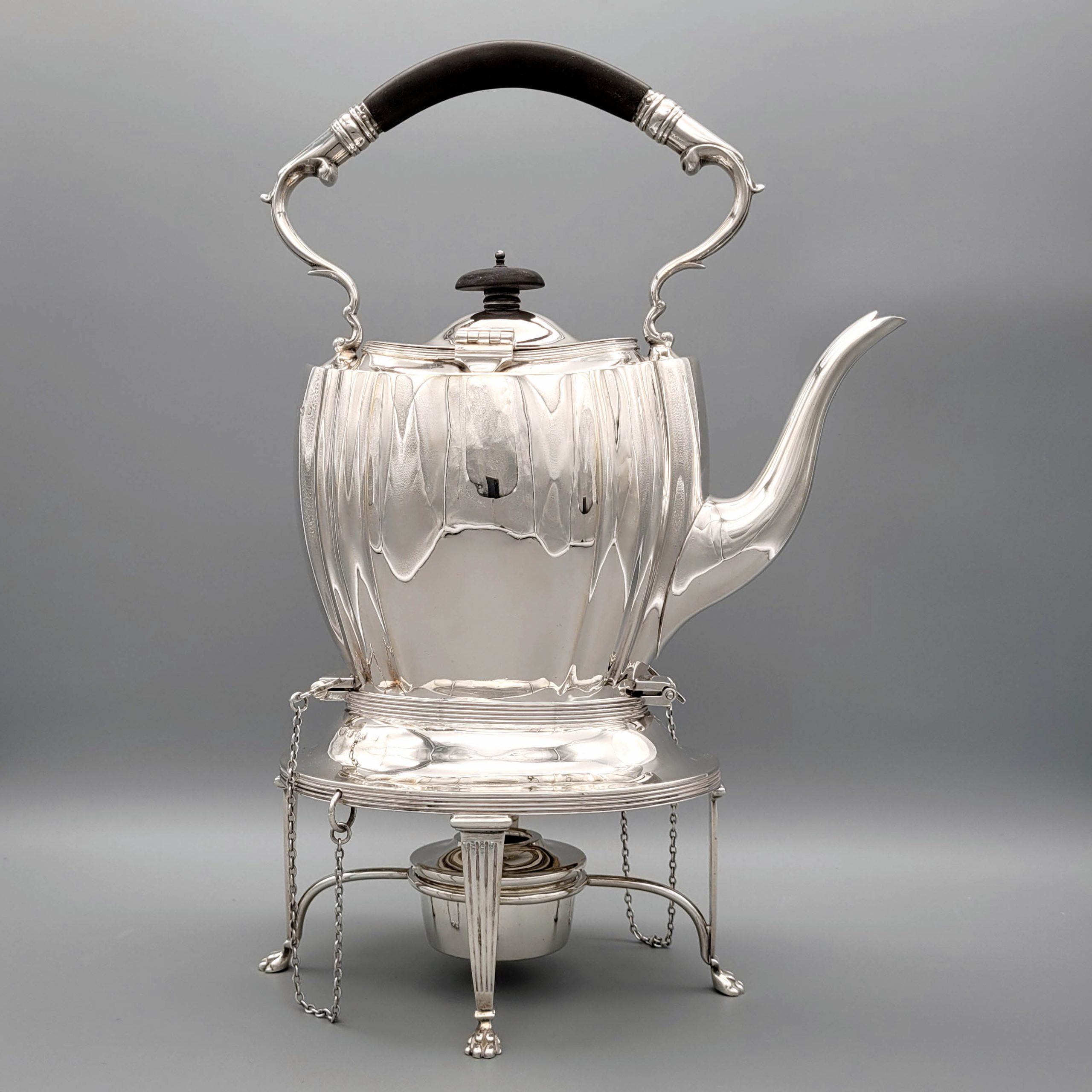 Teekanne auf Rechaud mit BrennerSilber, Griff und Deckelknauf geschwärztes Holz, Birmingham 1918, Höhe 35 cm, Gewicht 1415g (2 kleine Dellen in der Wandung)