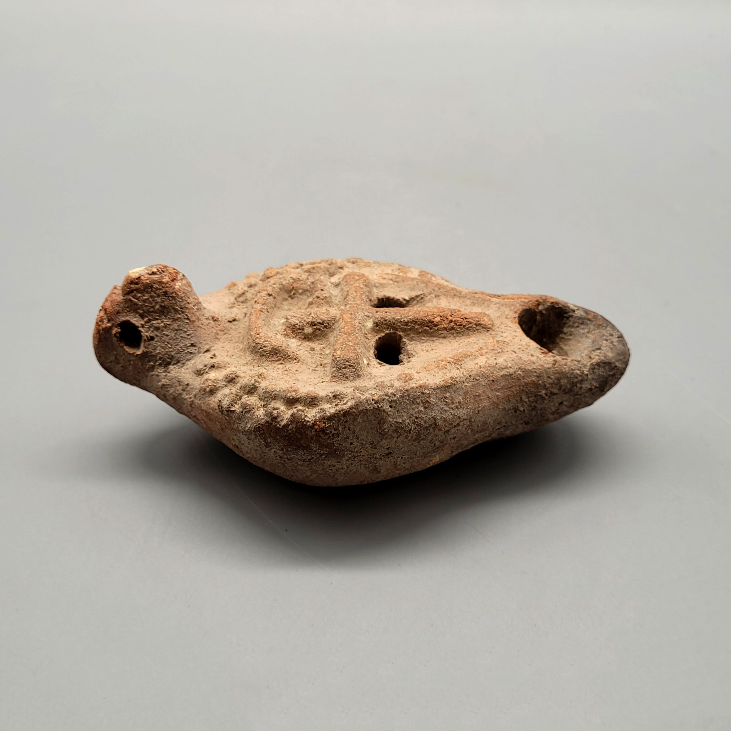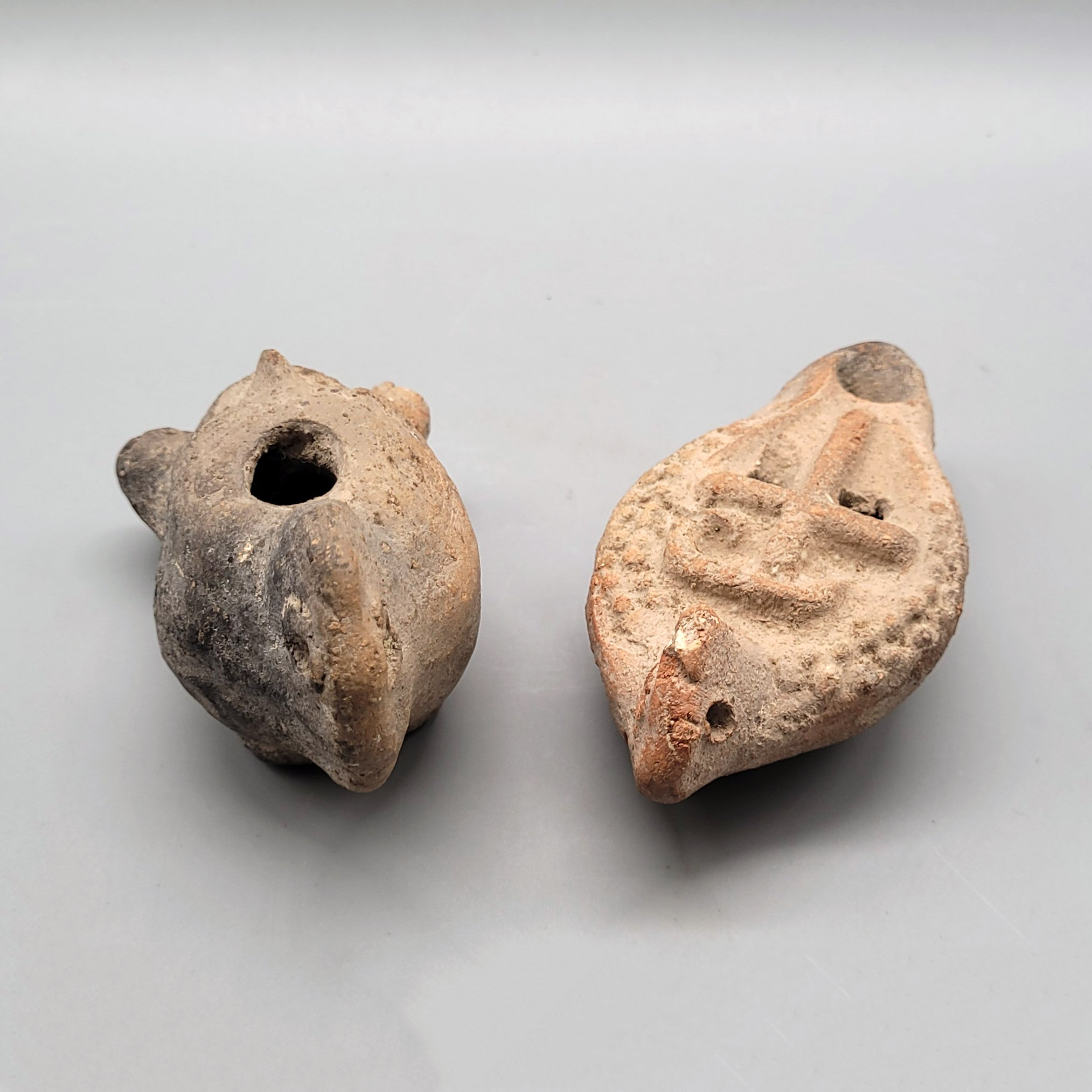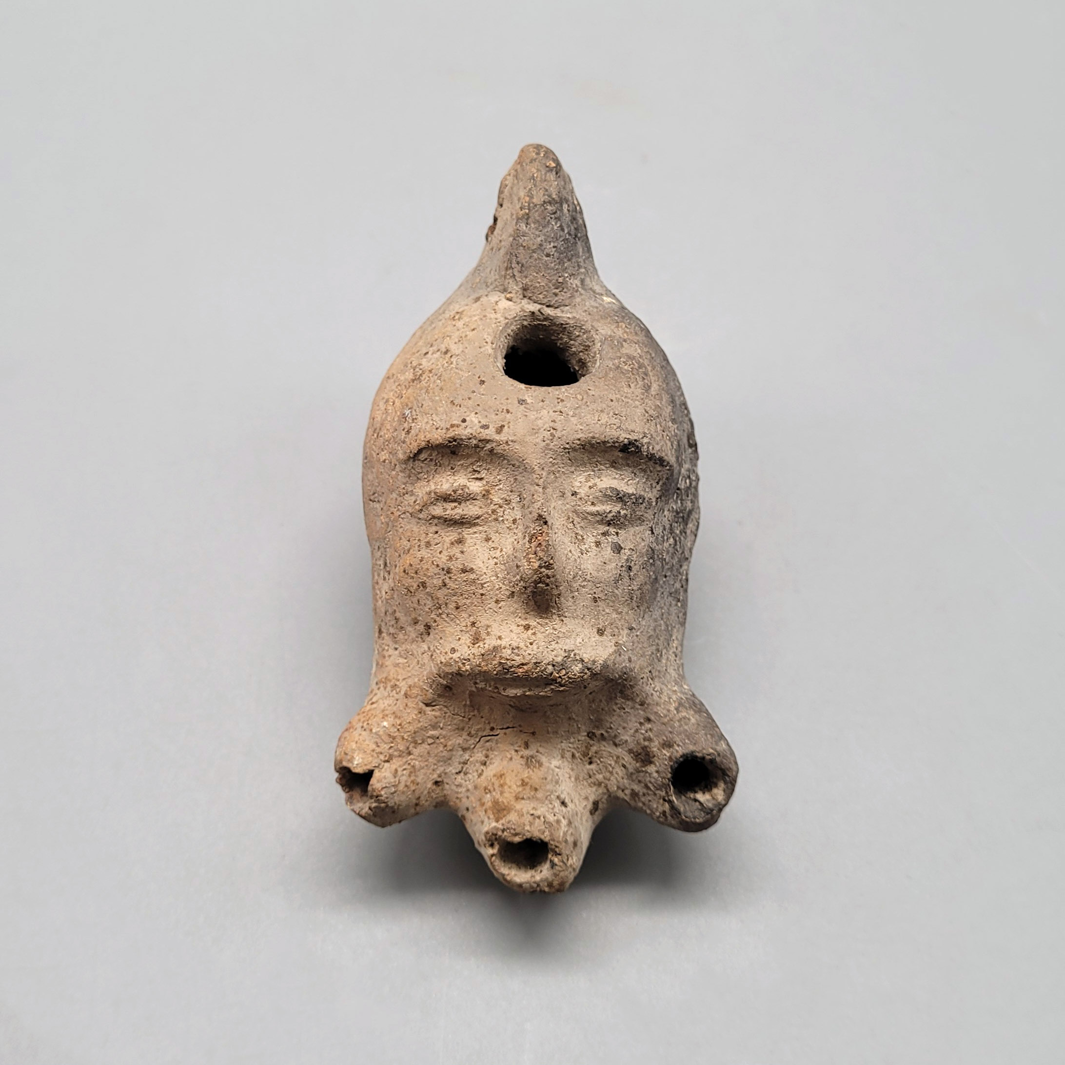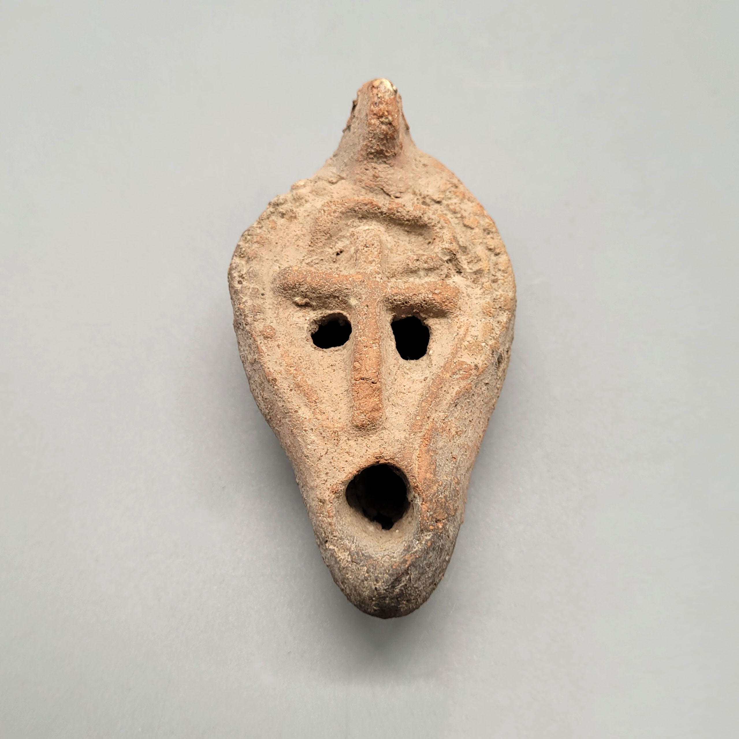 dreiflammige Gesichtslampe / Frühchristliche Lampe, Ton, gebrannt, Römisch / Byzantinisch 3.-5. Jahrhundert, 6 x 10 x 5 cm bzw. 4,5 x 10,5 x 5,5 cm (Provenienz: Sammlung F.H. [1903-1981], Köln seitdem in Familienbesitz)