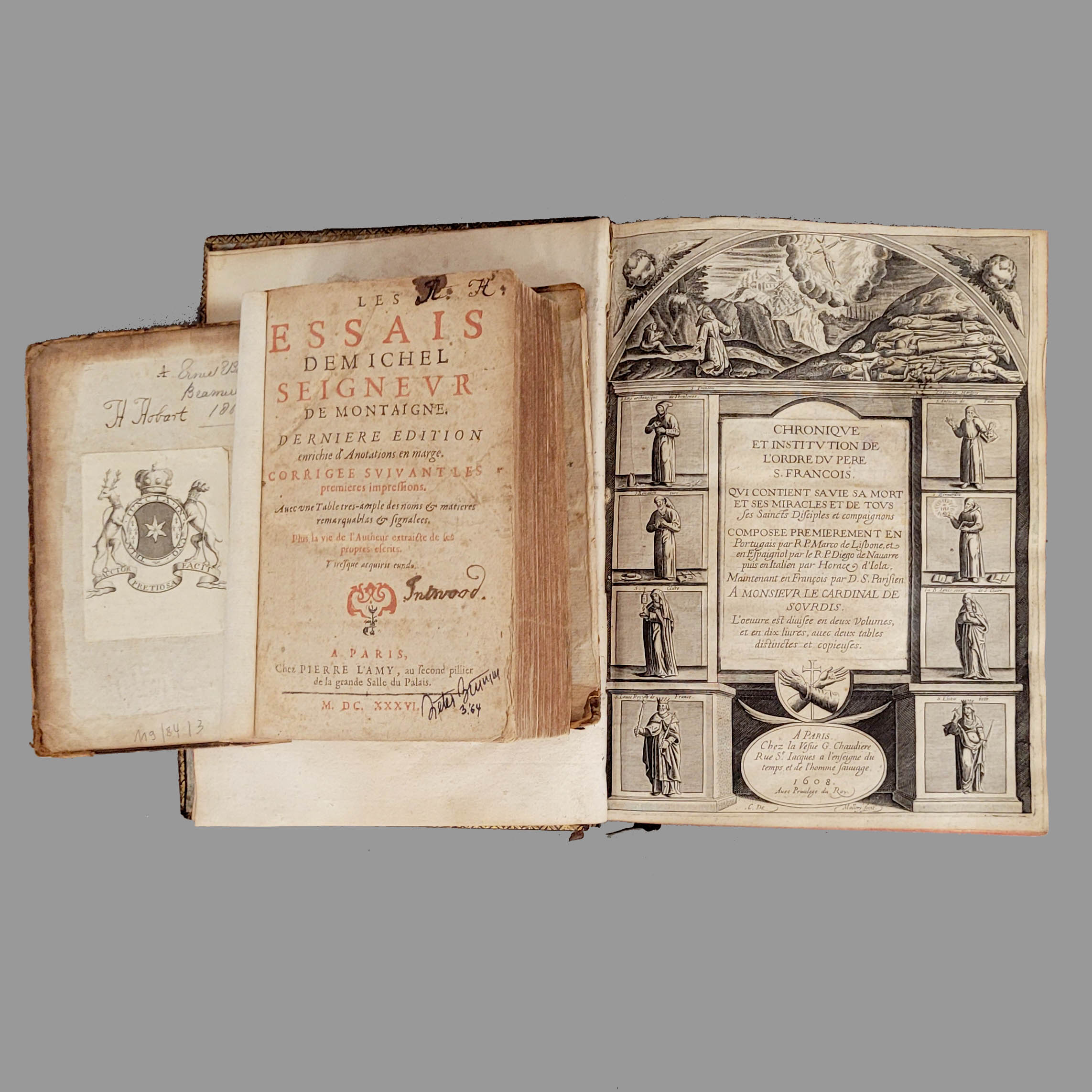 Paris (Pierre Lamy) 1636 (Ledereinband der Zeit, Vorder- und Rückendeckel gelöst) LISBOA, Marcos de, Chronique et institution de l’ordre du Père S. Francois, Vol I-II (in einem Band), Paris (Chaudiere) 1608 (Ledereinband der Zeit)