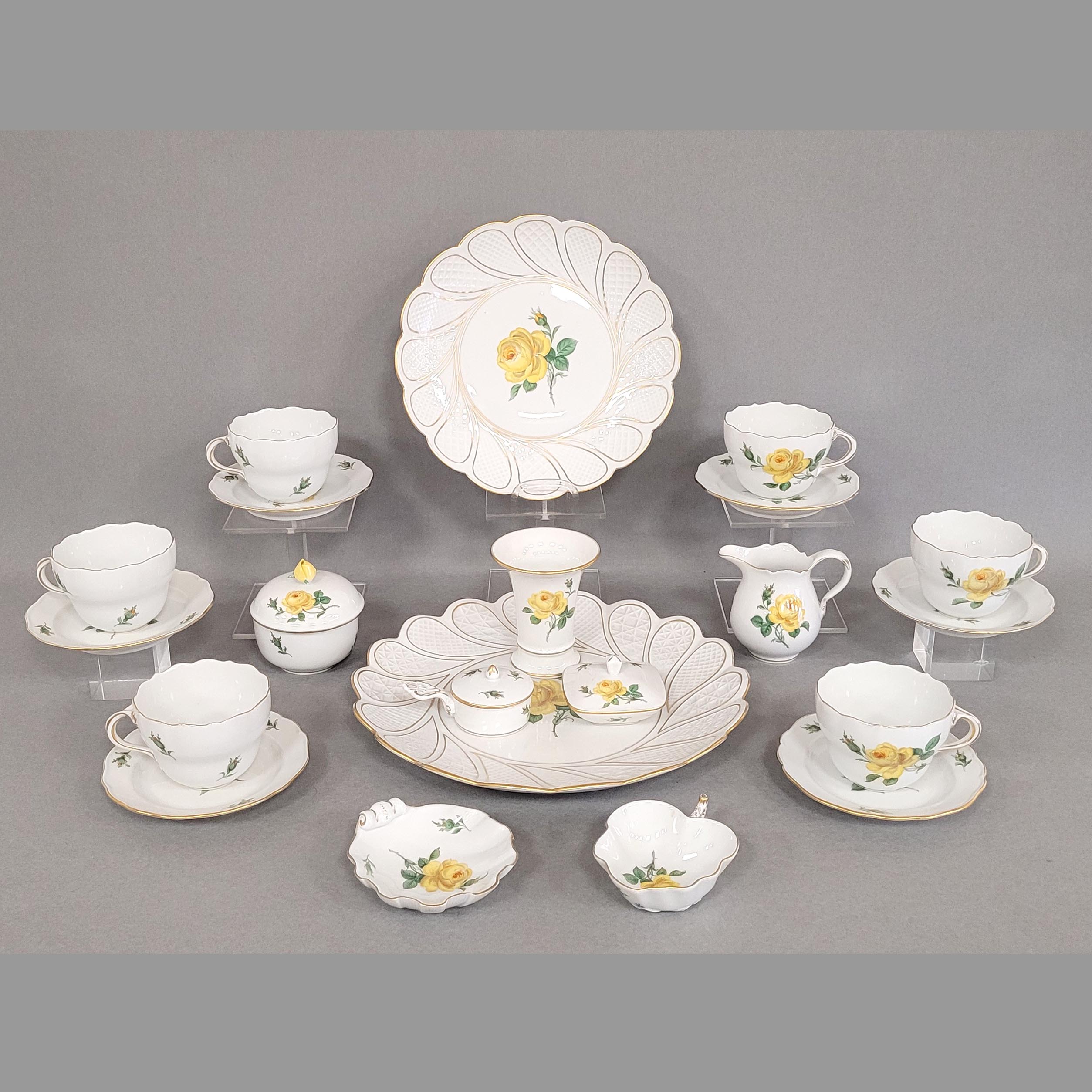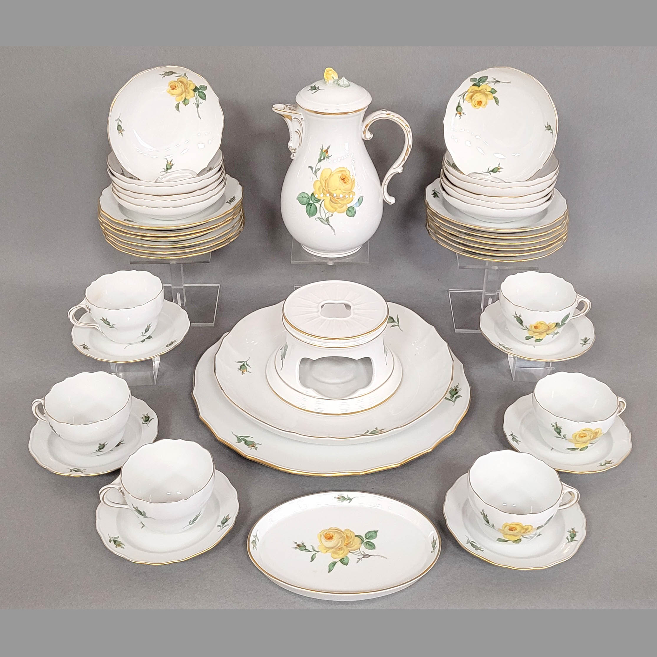 Porzellan, bemalt und vergoldet, Meissen, Dekor „Gelbe Rose“, bestehend aus: Kaffeekanne, Stövchen, Milch und Zucker, 12 Tassen, 12 Untertassen, 12 Konfektteller, 12 Kuchenteller, 2 Deckeldosen, 2 Schälchen, Vase, Kuchenplatte, 4 Anbietteller (ca. die Hälfte der Teile II. Wahl)