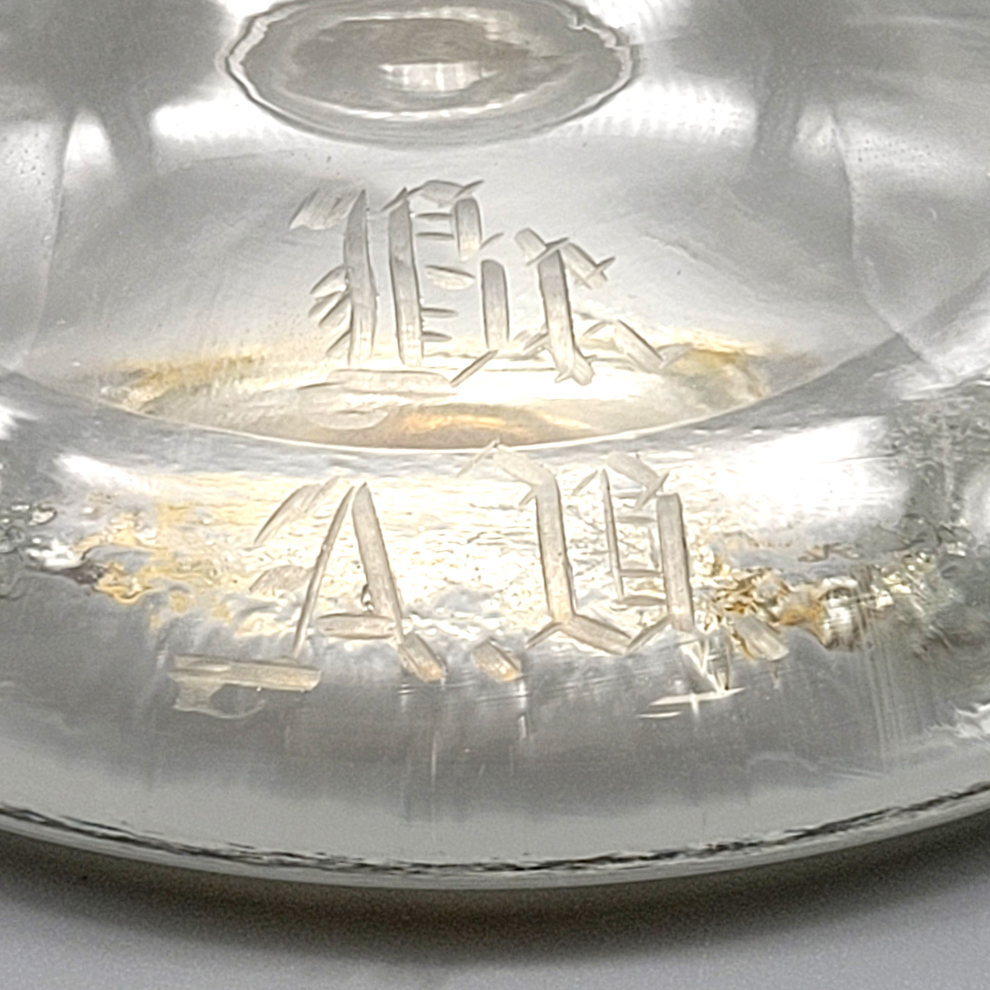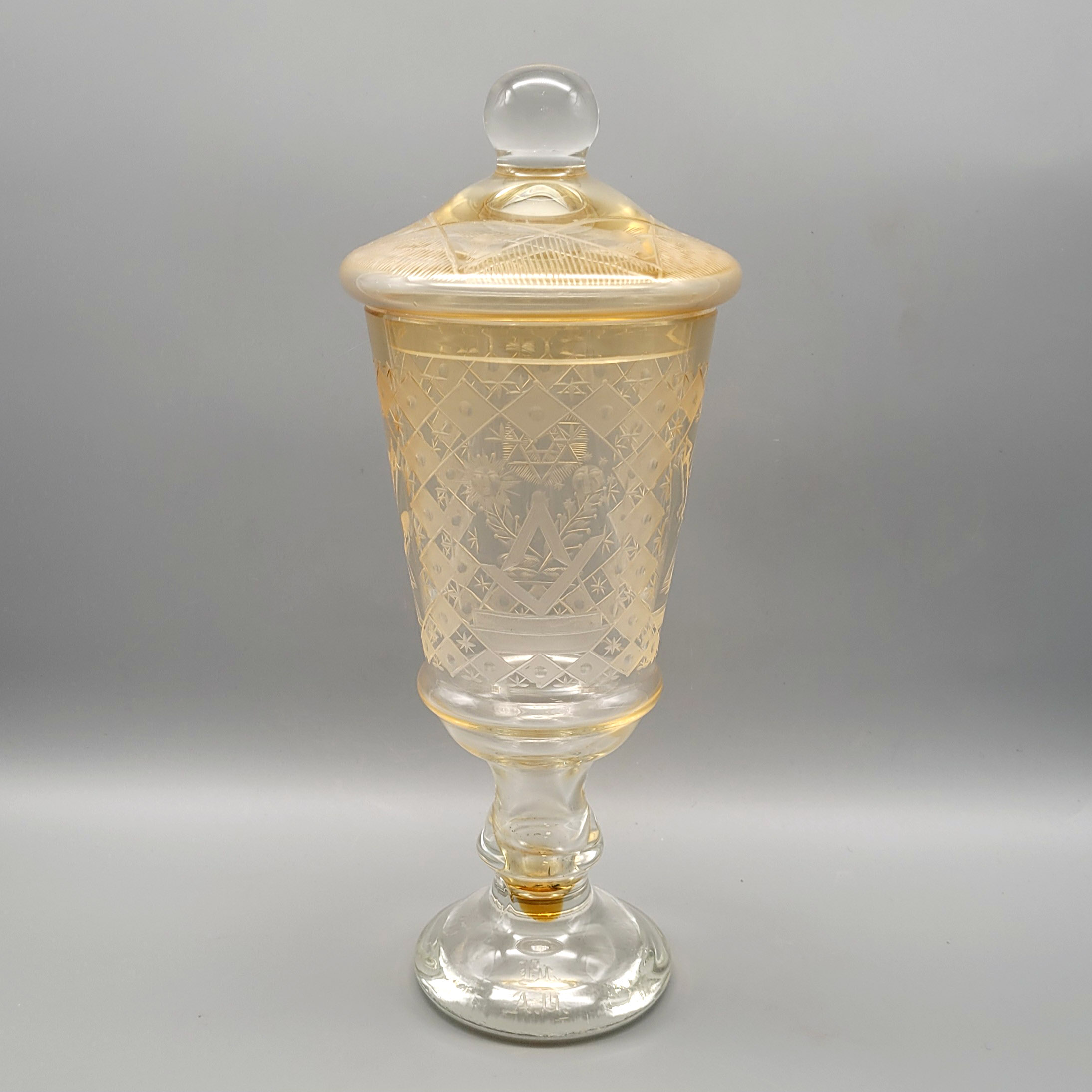 Deckelpokal einer Freimaurerlogefarbloses Glas, Schliff- und Ätzdekor, auf dem Standfuß bezeichnet „Dr. A.V.“, Deutsch, um 1900, Höhe 32,5 cm