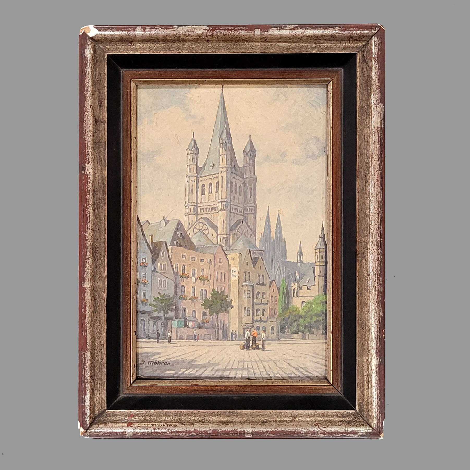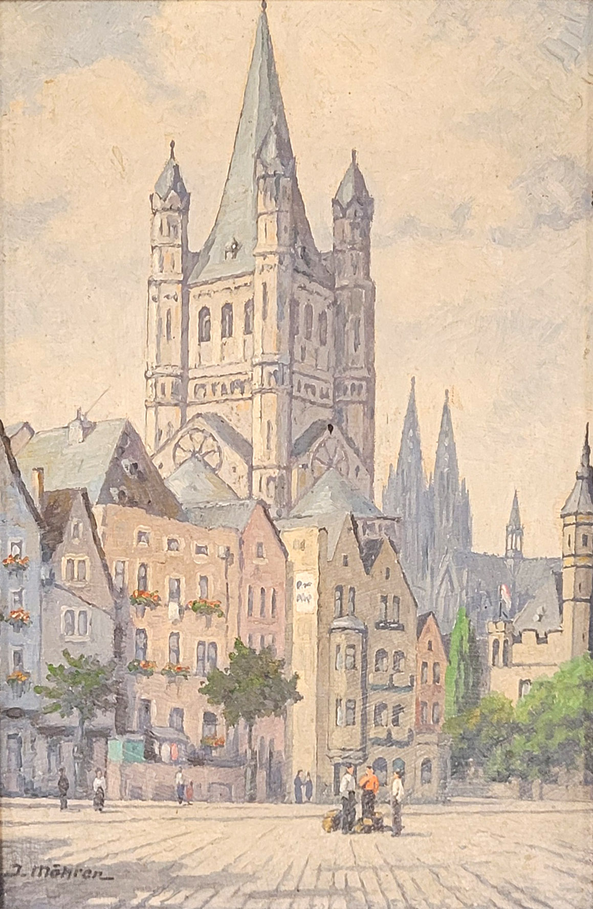 MÖHREN, Jean (1876-1954): Ansicht auf Groß St. Martin und den Kölner DomÖl auf Malkarton, signiert unten links, 23 x 15 cm, Rahmen (beschädigt)