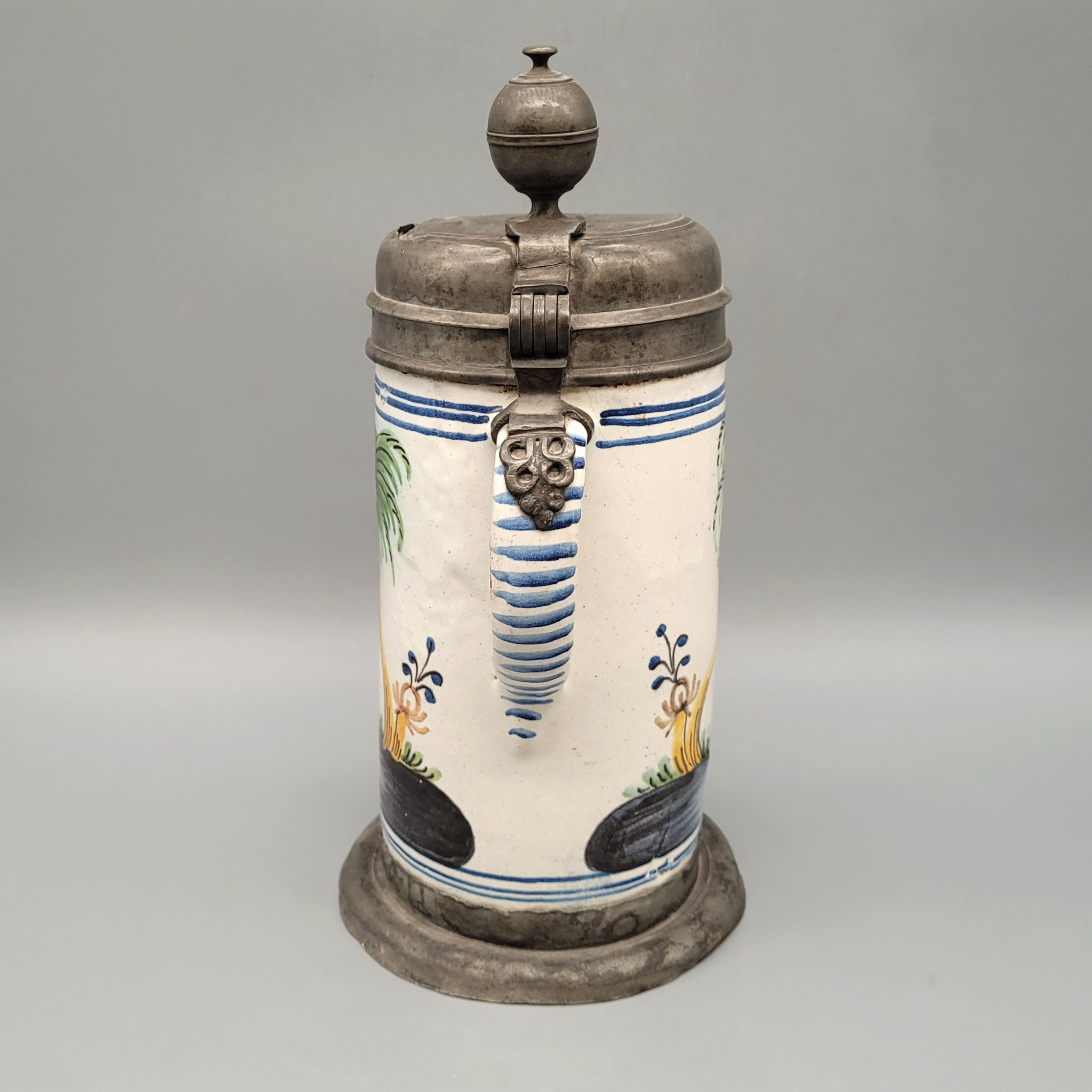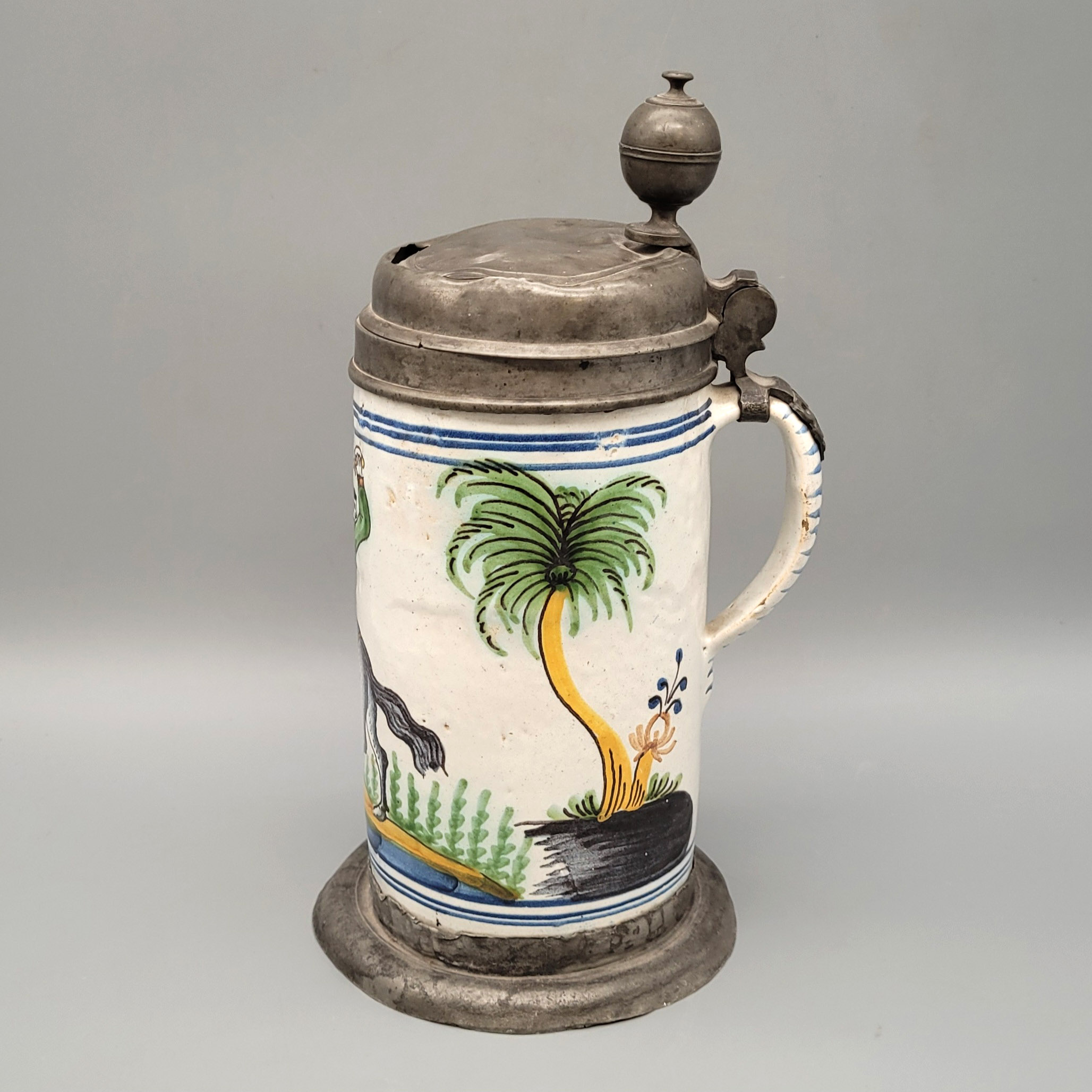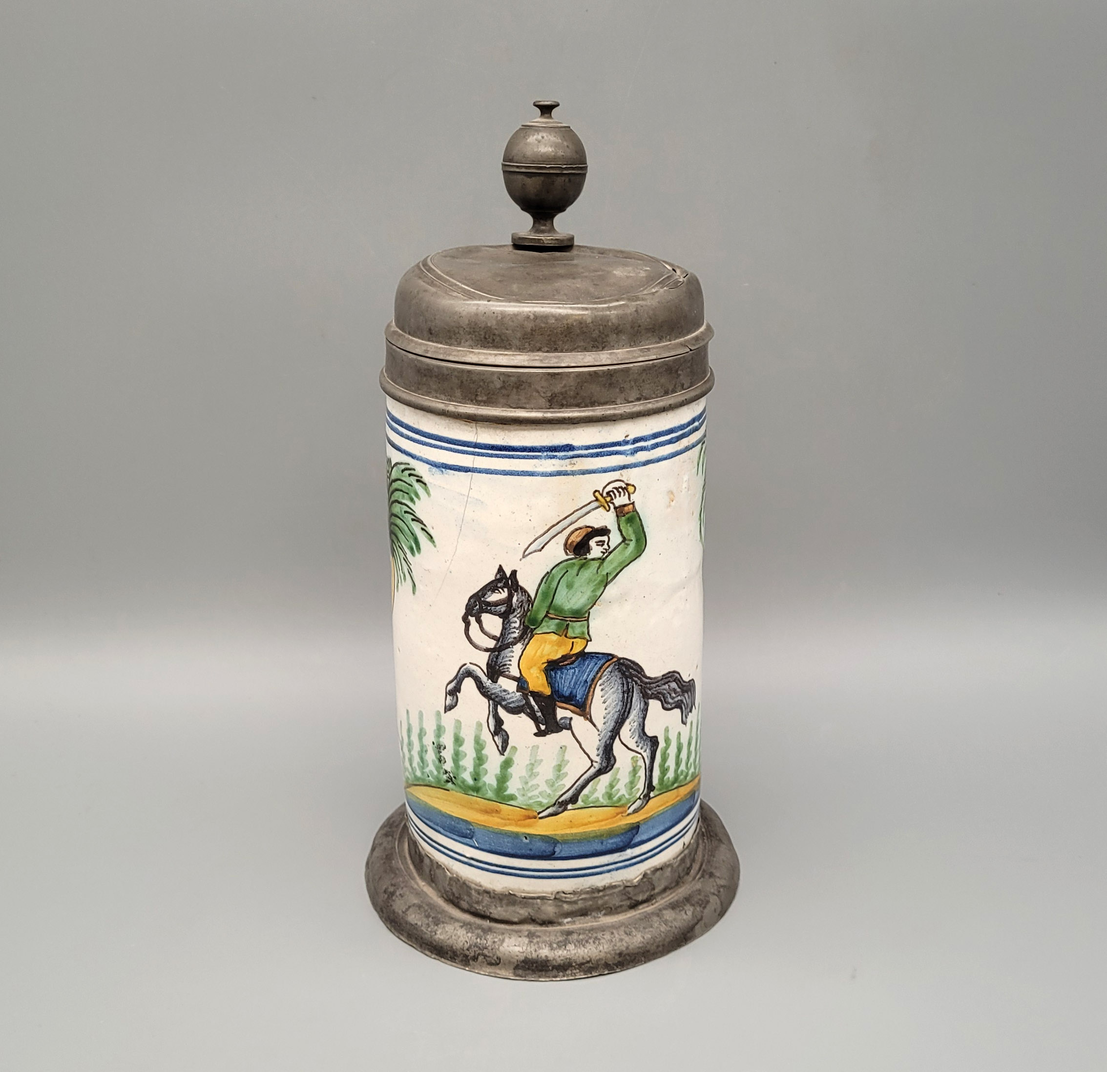 Fayence, Wandung mit „Türke auf Pferd“ in polychromer Malerei, Zinnmontierung, 18. Jahrhundert, Höhe 26,5 cm
