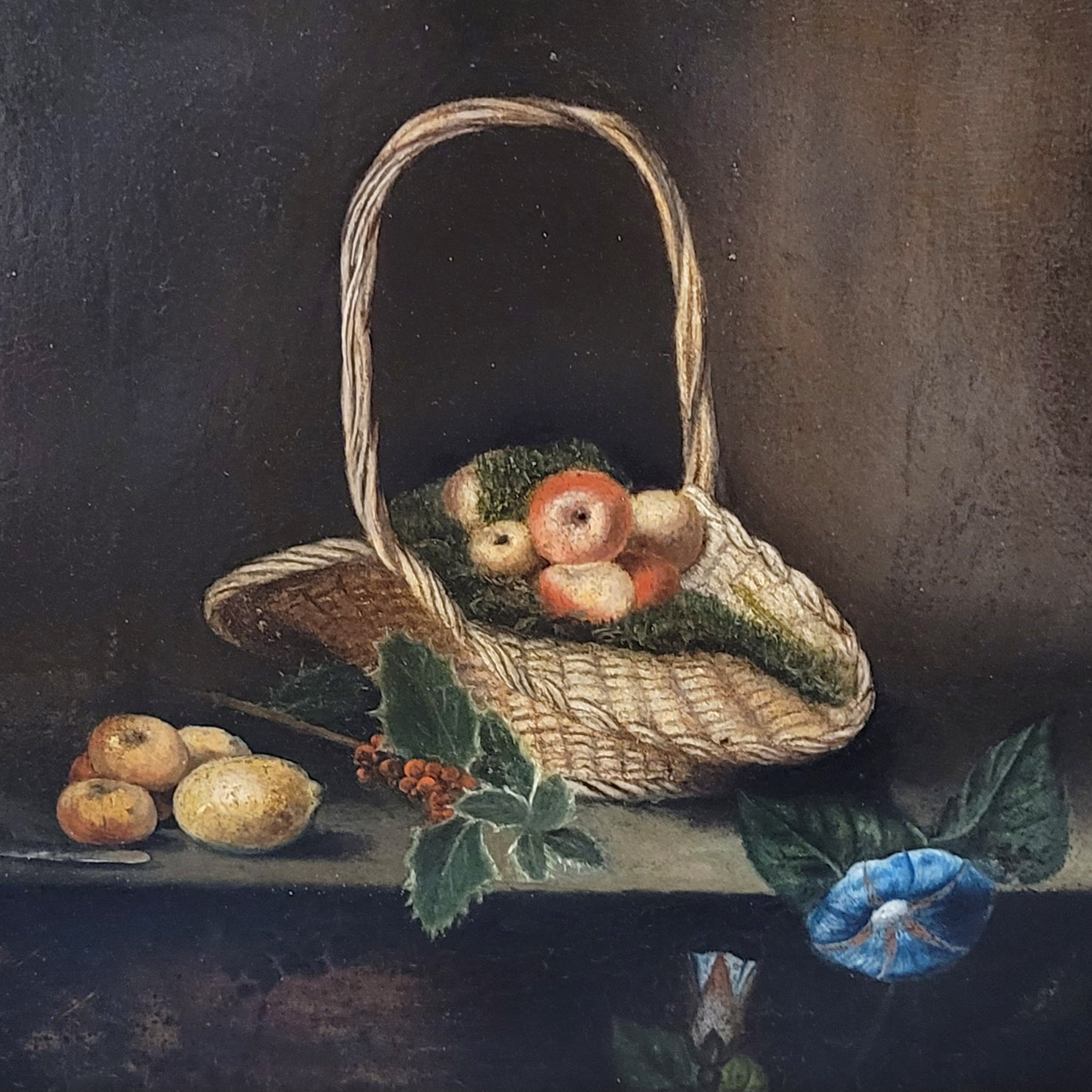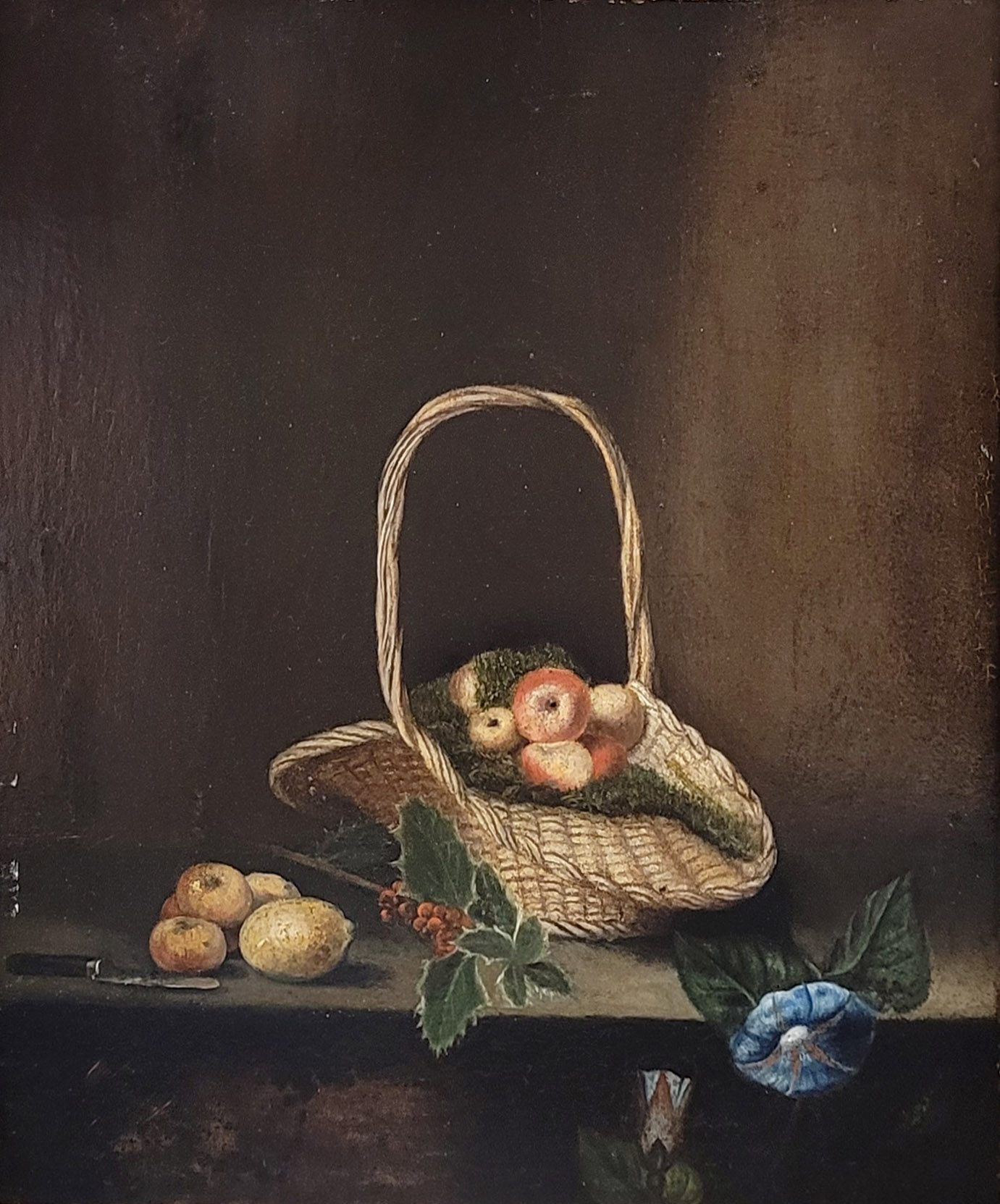DEUTSCHER MEISTER (19. Jh.): Früchtestilleben mit Korb und BlumenÖl auf Holz, 34 x 28 cm, Rahmen