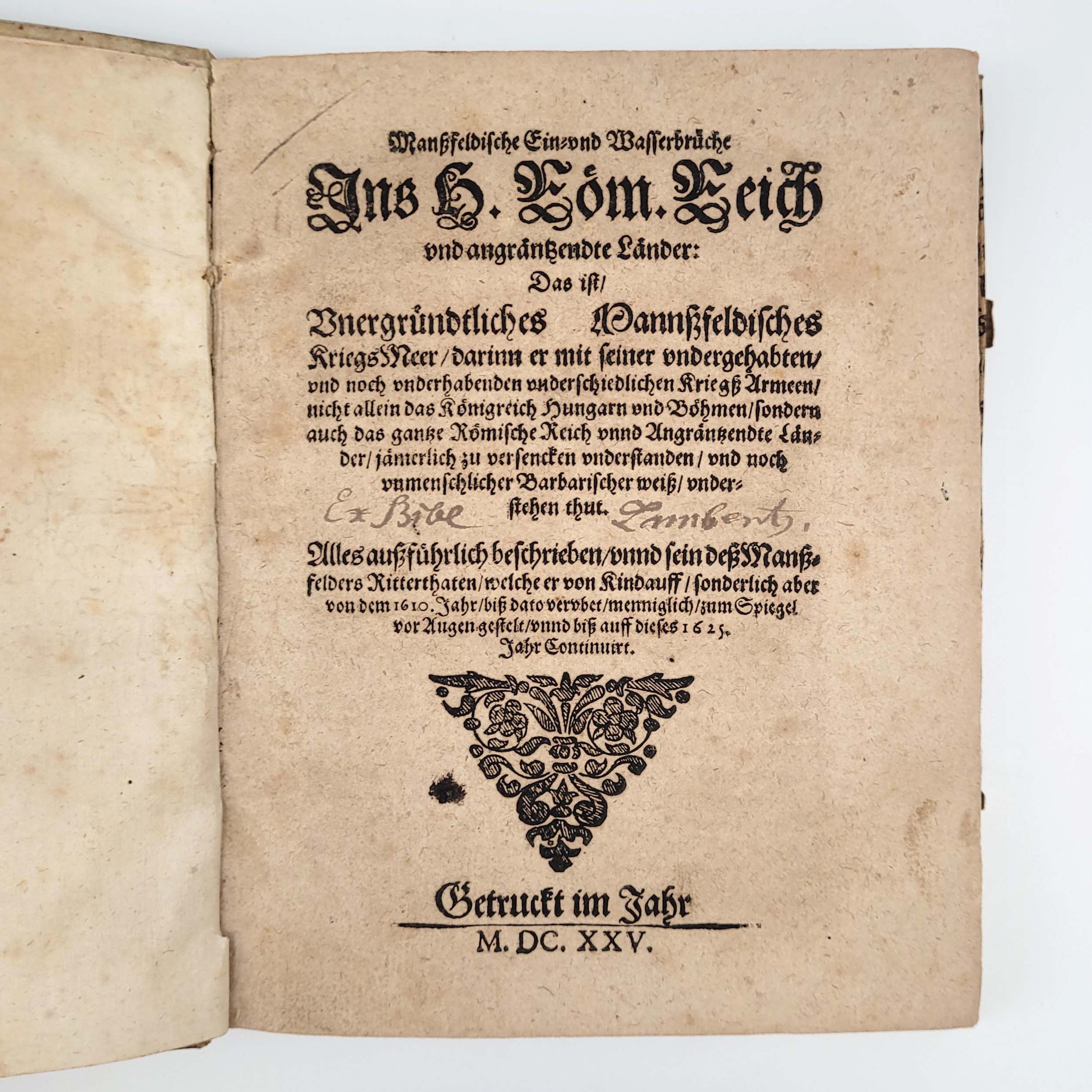 Das ist Unergründtliches Mannßfeldisches Kriegs Meer darinn er mit seiner undergehabten und noch underhabenden underschiedlichen Kriegß Armeen nicht allein das Königreich Hungarn und Böhmen sondern auch das gantze Römische Reich unnd Angräntzendte Länder jämerlich zu versencken understanden und noch unmenschlicher Barbarischer weiß understehen thut (=Acta Mansfeldica publica), o.O. 1625 (Einband unter Verwendung einer mittelalterlichen Handschrift, teilweise stärker gebräunt seltenes Pamphlet gegen den Kriegstreiber, Söldner und Heerführer Graf Peter Ernst II. von Mansfeld, der in den Anfangsjahren des 30-jährigen Krieges zu den erbittersten Feinden des Hauses Habsburg und seiner Verbündeten gehörte)