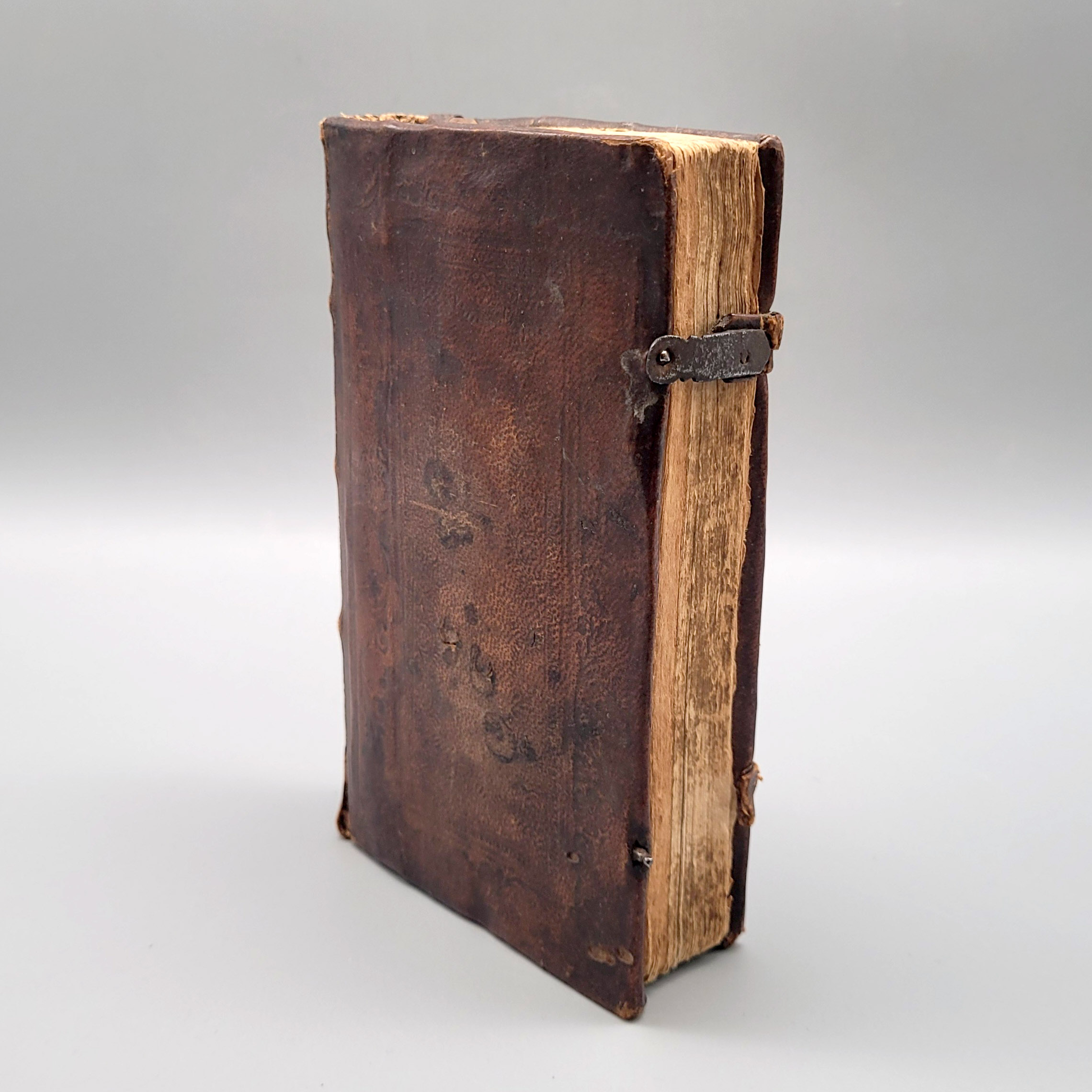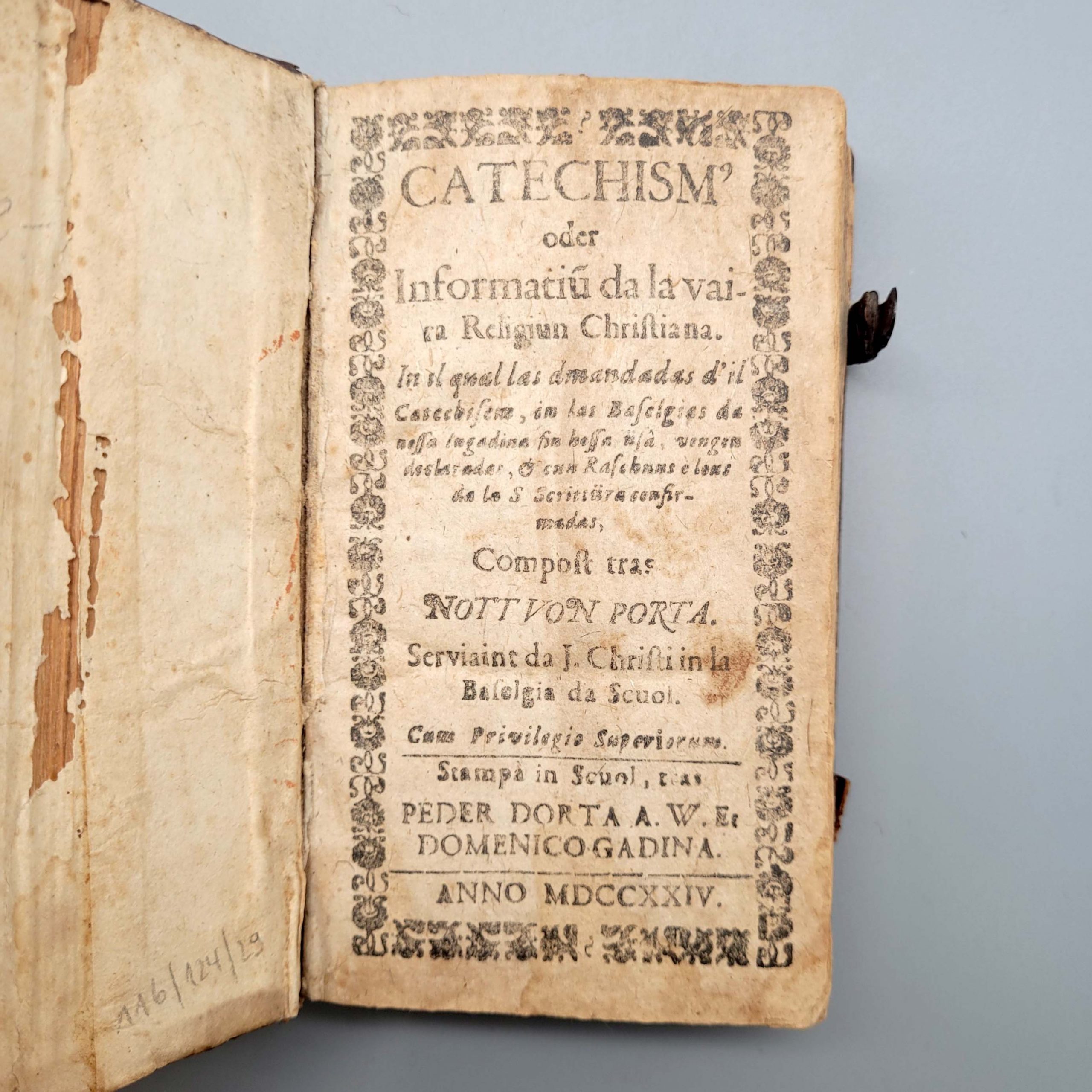 Scuol (Schuls) [bei Dom. Gadina] 1724 (Ledereinband über Holzdeckeln mit Metallschließen [eine fehlt], seltener rätoromanischer Katechismus von dem reformiertem Theologen Nott a Porta [1696-1767], der von 1718-1767 Pfarrer in Scuol war)